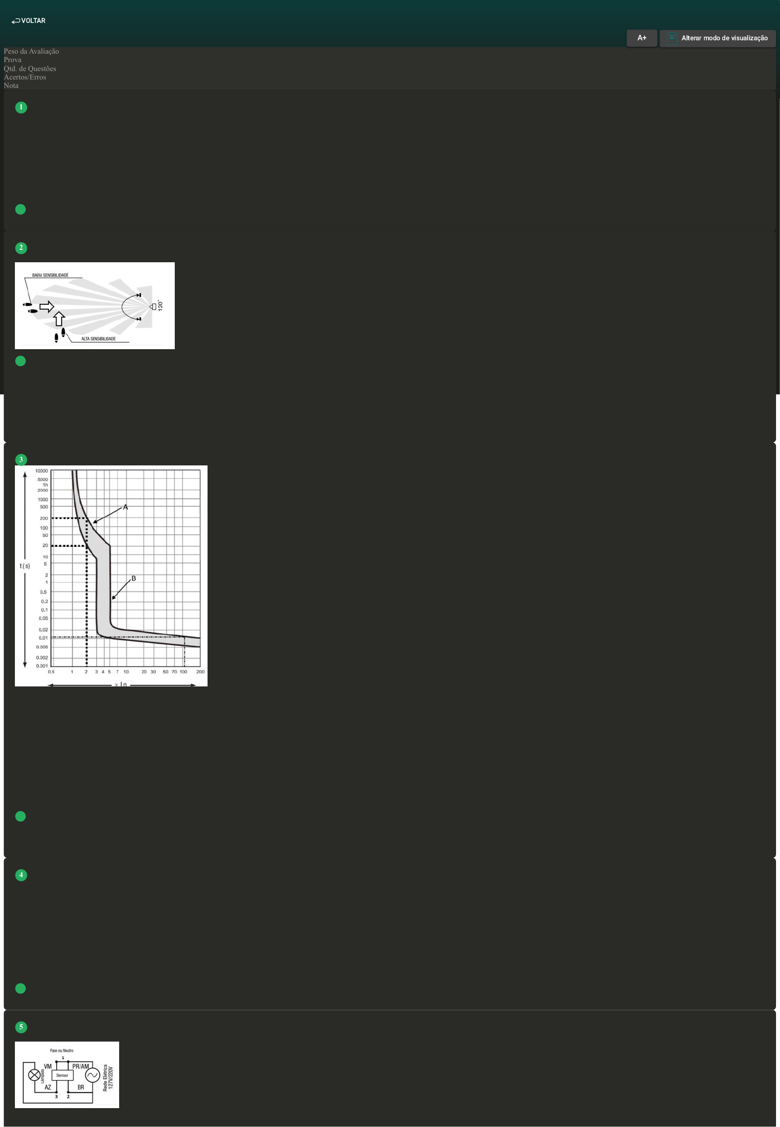 Prova Impressa GABARITO | Avaliação Final (Objetiva) - Individual (Cod.:1523944) Peso da Avaliação 4,00 Prova 103865408 Qtd. de Questões 10 Acertos/Erros 10/0 Nota 10,00 Uma instalação elétrica com condutor de cobre possui máxima queda de tensão permissível igual a 7%. Essa é composta por um circuito de comprimento de 24 m, por onde passa uma corrente de 45 A, com uma tensão fase-neutro de 220 V. Calcule a seção mínima admissível para o condutor e assinale a alternativa CORRETA: Onde: rho = 1/56 Ohm.mm^2/m A 3,75 mm^2. B 1,75 mm^2. C 3,25 mm^2. D 2,5 mm^2. [Laboratório virtual - Automação Residencial e Telecomunicações] A unidade fotoelétrica, também chamada de relé fotoelétrico, é composta por um LDR que altera sua resistência em função da luminosidade incidente. O sensor utilizado na bancada é o de presença com minuteria 6306 da Force Line. Com base na figura apresentada, assinale a alternativa CORRETA: A O sensor tem uma cobertura de 120° e apresenta uma maior sensibilidade em deslocamentos de um lado para o outro do sensor. B O sensor tem uma cobertura de 120° e apresenta uma menor sensibilidade em deslocamentos de um lado para o outro do sensor. C O sensor tem uma cobertura de 180° e apresenta uma maior sensibilidade em deslocamentos de um lado para o outro do sensor. D O sensor apresenta maior sensibilidade em deslocamentos realizados em sua direção e abrangência de 180°. As curvas de tempo × corrente dos disjuntores indicam o tempo que o dispositivo demora para desarmar sob uma determinada corrente. Observe o gráfico a seguir referente às curvas de tempo versus corrente dos disjuntores. Fonte: SEIDEL, L. R. Instalações elétricas de baixa tensão. Indaial: UNIASSELVI, 2019. p. 171. Com relação à aplicação correta dos disjuntores, tendo em vista as características de sua curva de atuação, analise as afirmativas a seguir: I. O eixo horizontal representa o tempo de atuação do disjuntor em milissegundos (s), e o eixo vertical representa a corrente elétrica em ampères (A). II. O eixo horizontal representa a corrente elétrica em ampères (A), e o eixo vertical representa a sensibilidade do disjuntor em segundos (s). III. O eixo horizontal representa o tempo de atuação do disjuntor em segundos (s), e o eixo vertical representa a potência em watts (W). IV. O trecho indicado pela letra “A” representa a faixa de atuação do disparador térmico do disjuntor, ou seja, representa o comportamento do dispositivo em relação a uma sobrecorrente. V. O trecho “B” representa a característica de atuação do dispositivo eletromagnético, que atua na ocorrência de curtos-circuitos.É correto o que se afirma em: A I, II e III, apenas. B I, III e V, apenas. C I, IV e V, apenas. D II, IV e V, apenas. E II, III e IV, apenas. Os disjuntores são dispositivos de segurança elétrica que protegem circuitos contra sobrecargas e curtos-circuitos, interrompendo o fluxo de corrente quando detectam condições anormais. As curvas tempo x corrente dos disjuntores representam graficamente a relação entre a corrente elétrica e o tempo necessário para que o disjuntor atue e interrompa o circuito. Essas curvas são essenciais para selecionar o disjuntor adequado para proteger os circuitos contra sobrecargas e curtos-circuitos, considerando as características específicas de cada aplicação. Qual é o principal objetivo da curva tempo x corrente dos disjuntores? A Determinar a eficiência energética do disjuntor em diferentes condições de carga. B Medir a eficácia do disjuntor na prevenção de surtos elétricos na rede de distribuição. C Avaliar a resistência do disjuntor à sobrecarga térmica em um ambiente industrial. D Definir a temperatura máxima permitida para o disjuntor durante sua operação. E Estabelecer a relação entre a corrente de curto-circuito e o tempo de atuação do disjuntor. [Laboratório virtual - Automação Residencial e Telecomunicações] Sensor de presença é um equipamento muito empregado em instalações residenciais ou prediais, sendo comum seu uso para o acendimento automático de luzes e/ou acionamento de alarmes. Seu funcionamento é baseado em sensoriamento da radiação infravermelha do local. A imagem apresenta o esquema de ligação do sensor de presença para acionamento de iluminação indicativa: Sobre o funcionamento do circuito de acionamento da lâmpada indicativa, assinale a alternativa CORRETA: A Quando o sensor detecta alguma presença, ele abre os contatos 1 e 1 e fecha o contato 1 com 2, energizando o circuito da lâmpada. VOLTAR A+ Alterar modo de visualização 1 2 3 4 5 B Quando o sensor detecta alguma presença, ele fecha os contatos 2 com o 3, alimentando diretamente a lâmpada. C Quando o sensor detecta alguma presença, ele fecha os contatos 1 com o 2, alimentando o circuito de iluminação. D Quando o sensor detecta alguma presença, ele fecha os contatos 1 e 3, liberando a passagem da corrente elétrica e acendendo a lâmpada. Existem vários tipos de lâmpadas que foram utilizadas nos tempos modernos, em especial as lâmpadas incandescentes, fluorescentes e mais recentemente as lâmpadas LED. Com base no exposto, classifique V para as sentenças verdadeiras e F para as falsas: ( ) As lâmpadas incandescentes possuem alta eficiência luminosa, motivo pelo qual foram usadas por muito tempo. ( ) A norma NBR 5410 (2004) não prevê o uso de lâmpadas LED, apenas incandescentes e fluorescentes. ( ) As lâmpadas LED possuem maior eficiência luminosa com as incandescentes, podendo gerar uma economia de potência de 10 vezes para o mesmo fluxo luminoso. ( ) A luminosidade de lâmpadas incandescentes e fluorescentes não pode ser comparada, pois há muita variabilidade entre a potência das lâmpadas e o seu fluxo luminoso. Assinale a alternativa que apresenta a sequência CORRETA: A V - V - F - F. B V - F - F - F. C F - F - V - V. D F - F - V - F. A eficiência luminosa indica o q