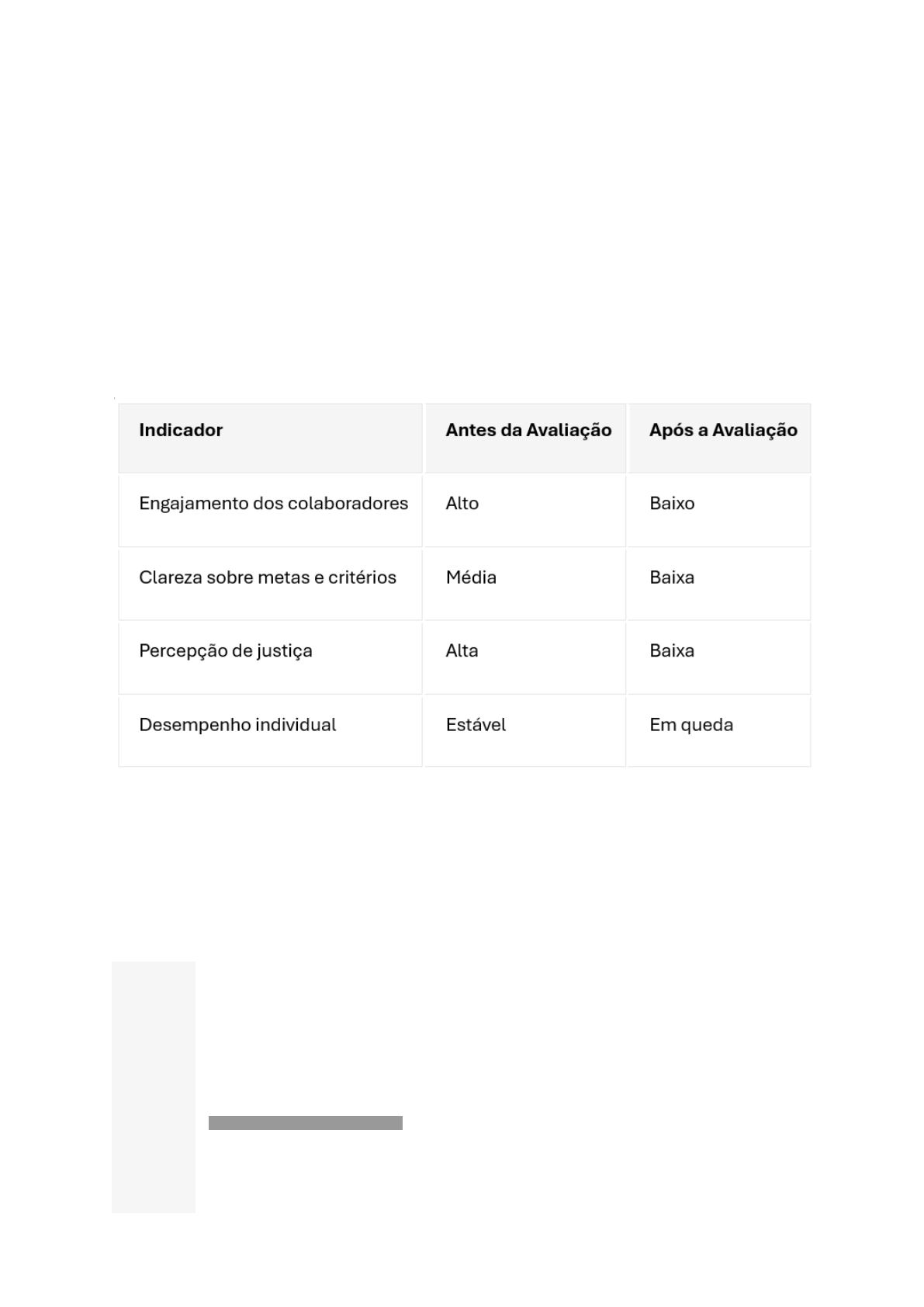 Questão 1/10 - Avaliação de Desempenho Ler em voz alta A empresa Gestus Soluções Empresariais decidiu implementar uma nova ferramenta de avaliação de desempenho. No entanto, o processo foi conduzido sem considerar as especificidades da organização, como cultura interna, estrutura hierárquica e objetivos estratégicos. Os formulários foram padronizados com base em modelos genéricos disponíveis na internet, e os gestores não receberam qualquer orientação sobre como aplicar os critérios. Após a primeira rodada de avaliações, diversos colaboradores relataram sentimento de injustiça e desmotivação, alegando que os critérios não refletiam suas funções reais. A área de Recursos Humanos identificou que o problema estava na fase de planejamento da ferramenta, que não contemplou os fatores críticos de sucesso. A figura abaixo resume os impactos observados: Diante disso, a empresa decidiu revisar o planejamento da ferramenta e envolver os gestores e colaboradores na definição dos critérios. Com base no caso apresentado, conclui-se que a falha no processo de avaliação ocorreu principalmente por: A Ausência de feedback corretivo após a aplicação da avaliação. B Falta de treinamento dos avaliadores sobre técnicas de comunicação. C Planejamento inadequado da ferramenta, desconsiderando a realidade organizacional. Você assinalou essa alternativa (C) D Aplicação de critérios excessivamente rigorosos para todos os colaboradores. Questão 2/10 - Avaliação de Desempenho Ler em voz alta A empresa LíderTech, do setor de tecnologia educacional, está revisando seu processo de Avaliação de Desempenho por Competências. Após aplicar o modelo por dois ciclos consecutivos, a equipe de Recursos Humanos identificou inconsistências nos critérios utilizados pelos gestores para avaliar os colaboradores. Alguns avaliadores utilizavam escalas subjetivas, enquanto outros aplicavam critérios próprios, sem alinhamento com os objetivos organizacionais. Para resolver o problema, a empresa decidiu implementar uma matriz de referência, com descritores claros para cada competência avaliada, e realizar a parametrização dos indicadores de desempenho. A ideia é garantir que todos os avaliadores utilizem os mesmos parâmetros, promovendo justiça, comparabilidade e alinhamento estratégico. Durante a implementação, surgiu um debate entre os gestores: alguns defendiam que a padronização limitaria a autonomia dos líderes, enquanto outros argumentavam que a ausência de parâmetros comprometeria a objetividade da avaliação. Com base no caso apresentado, a principal função da matriz de referência e da parametrização no processo de avaliação é: A Garantir a liberdade dos gestores para avaliarem conforme sua percepção individual. B Estabelecer critérios subjetivos que permitam maior flexibilidade na avaliação. C Padronizar os critérios de avaliação, promovendo objetividade e alinhamento estratégico. Você assinalou essa alternativa (C) D Substituir a avaliação por competências por um modelo baseado em metas operacionais. Questão 3/10 - Avaliação de Desempenho Ler em voz alta A empresa Syntagma Consultoria implementou um programa de desenvolvimento de lideranças com foco em comunicação assertiva e feedback. Durante uma das oficinas, os participantes foram convidados a simular situações reais de feedback com seus liderados. Um dos gestores, ao tentar aplicar um feedback corretivo, utilizou frases vagas como “você precisa melhorar sua postura” e “não está indo bem”, sem especificar comportamentos, exemplos ou consequências. O colaborador, ao final da conversa, relatou não ter compreendido o que precisava mudar e saiu da reunião mais confuso do que antes. A consultora responsável pela oficina destacou que a falta de objetividade e clareza compromete a eficácia do feedback e pode gerar insegurança, desmotivação e até conflitos. A seguir, a tabela resume os principais erros cometidos pelos gestores durante os exercícios: Com base nos resultados, a empresa decidiu reforçar a capacitação dos gestores em técnicas de comunicação eficaz. Com base no caso apresentado, conclui-se que a principal falha no feedback foi: A Ausência de objetividade e clareza na comunicação da mensagem. Você assinalou essa alternativa (A) B Falta de recompensas associadas ao desempenho do colaborador. C Excesso de elogios que mascararam os pontos de melhoria. D Aplicação do feedback em ambiente coletivo e informal. 4/10 - Avaliação de Desempenho Ler em voz alta A empresa Solidez Engenharia realizou uma Avaliação de Desempenho semestral e identificou que diversos colaboradores apresentavam dificuldades em comunicação interpessoal e gestão de tempo. A área de Recursos Humanos decidiu utilizar esses dados para elaborar um plano de T&D personalizado. Foram aplicadas entrevistas com gestores, observações diretas e análise de cargos, mas o principal insumo para o plano foi a Avaliação de Desempenho, que revelou lacunas específicas de competências. A empresa estruturou dois programas distintos: um de treinamento técnico para melhorar a produtividade e outro de desenvolvimento comportamental para preparar os colaboradores para futuras posições de liderança. A tabela abaixo resume os objetivos dos programas: Após seis meses, os indicadores de desempenho mostraram melhora significativa, e os colaboradores relataram maior autoconfiança e engajamento. Com base no caso apresentado, conclui-se que o plano de T&D foi estruturado para: A Atender às lacunas de desempenho identificadas na avaliação e preparar os colaboradores para desafios futuros. Você assinalou essa alternativa (A) B Substituir a Avaliação de Desempenho por treinamentos padronizados e obrigatórios. C Eliminar a necessidade de observação direta e análise de cargos. D Garantir que todos os colaboradores recebam o mesmo conteúdo, independentemente das necessidades 