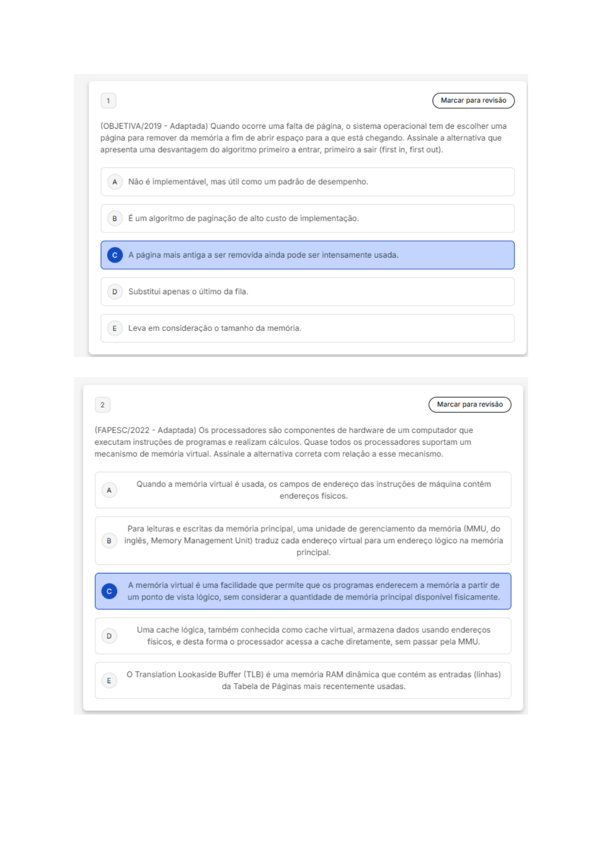 1 Marcar para revisão (OBJETIVA/2019 Adaptada) Quando ocorre uma falta de página, sistema operacional tem de escolher uma página para remover da memória a fim de abrir espaço para a que está chegando. Assinale a alternativa que apresenta uma desvantagem do algoritmo primeiro a entrar, primeiro a sair (first in, first out). A Não é implementável, mas útil como um padrão de desempenho. B É um algoritmo de paginação de alto custo de implementação. A página mais antiga a ser removida ainda pode ser intensamente usada. D Substitui apenas último da fila. E Leva em consideração tamanho da memória. 2 Marcar para revisão (FAPESC/2022 Adaptada) Os processadores são componentes de hardware de um computador que executam instruções de programas e realizam cálculos. Quase todos os processadores suportam um mecanismo de memória virtual. Assinale a alternativa correta com relação a esse mecanismo. Quando a memória virtual é usada, campos de endereço das instruções de máquina contêm A endereços físicos. Para leituras e escritas da memória principal, uma unidade de gerenciamento da memória (MMU, do B inglês, Memory Management Unit) traduz cada endereço virtual para um endereço lógico na memória principal. A memória virtual é uma facilidade que permite que os programas enderecem a memória a partir de um ponto de vista lógico, sem considerar a quantidade de memória principal disponível fisicamente. Uma cache lógica, também conhecida como cache virtual, armazena dados usando endereços D físicos, e desta forma processador acessa a cache diretamente, sem passar pela MMU. Translation Lookaside Buffer (TLB) é uma memória RAM dinâmica que contém as entradas (linhas) E da Tabela de Páginas mais recentemente usadas.3 Marcar para revisão (SELECON/2022 Adaptada) Nos computadores atuais, é utilizado um mecanismo para melhorar desempenho dos equipamentos, conhecido como memória virtual e implementado por meio de um arquivo de troca "swap file" armazenado no disco Esse mecanismo emprega basicamente dois recursos, descritos a seguir: I. Técnica de gerência de memória, na qual um programa é espalhado por áreas não de memória, em que espaço de endereçamento lógico de um processo é dividido em unidades lógicas de tamanho fixo. II. Técnica de gerência de memória, na qual programas são divididos em unidades de tamanhos variados, cada um com seu próprio espaço de endereçamento. Os recursos descritos em e são conhecidos, respectivamente, como: A fragmentação e compactação B compactação e fragmentação paginação e segmentação D segmentação e paginação E Divisão e endereçamento4 Marcar para revisão (FAPESC/2017 Adaptada) Gerenciamento é processo de planejar, organizar, dirigir e controlar recursos. Assinale a alternativa correta com relação ao gerenciamento da memória em Sistemas Operacionais. Além de desacoplar os endereços lógicos dos endereços físicos e realizar a tradução entre ambos, a A noção de memória virtual também permite implementar a proteção de memória do núcleo e dos processos entre si, fundamentais para a segurança e estabilidade do sistema. Para ocultar a organização complexa da memória física e simplificar os procedimentos de alocação da memória aos processos, os sistemas de computação modernos implementam a noção de memória virtual, na qual existem dois tipos de endereços de memória distintos: Endereços Diretos e Endereços Indiretos. Endereços físicos são os endereços de memória usados pelos processos e pelo sistema operacional C e, portanto, usados pelo processador durante a execução. Estes endereços são definidos de acordo com espaço de endereçamento do processador. Na execução, os processos "enxergam" somente a memória real. Assim, durante a execução de um D programa, o processador gera endereços virtuais para acessar a memória. Por questões de desempenho, a tradução de endereços lógicos em físicos é feita por um componente E específico do hardware do computador, denominado Unidade de Gerência de Endereçamento Virtual (VMM Virtual Memory Management). 5 Marcar para revisão Um dos comandos mais utilizados quando se está trabalhando em um shell do Linux é o comando para listar conteúdo do diretório corrente. Para listar conteúdo do diretório corrente, mostrando os arquivos ocultos e o tamanho dos arquivos, deve-se utilizar comando: A cp -R B directory show C list -a D Is -al E show all6 Marcar para revisão Para armazenamento de dados em partições Linux, um disco precisa ser particionado. Depois, as partições precisam ser formatadas e, posteriormente, montadas. Somente após a conclusão destes 3 processos, sistema de arquivos poderá ser acessado pelos processos do sistema. Os comandos do Linux que podem ser utilizados, respectivamente, para particionamento, formatação e montagem de sistema de arquivos são: A df, frmt e Is. fdisk, mkfs e mount. C gparted, fsck e du. D In, mkswap e link. E part, format, put. 7 Marcar para revisão nano é um editor de texto para linha de comando que está presente na grande maioria das distribuições Linux. Qual comando é responsável por salvar um arquivo? A +G +O C +X D +R E +W8 Marcar para revisão Dos comandos abaixo, qual pode ser usado para limpar terminal, apagando todo conteúdo previamente existente? A refresh B date C halt D read E clear 9 Marcar para revisão É um comando que permite interromper um LOOP imediatamente: A loop B undo C while D continue E break10 Marcar para revisão Dos comandos abaixo, qual permite alterar a configuração de CRONTAB do usuário? A crond B vi crontab C In cron tab D crontab -e E service cron enable Gabarito da prova Nota Confira gabarito da prova de Sistemas Operacionais 1,0 Realizada em 28/08/2025 conteúdo do gabarito é apresentado de maneira resumida para preservar a integridade do nosso banco de questões. Questão Enunciado Sua resposta Resposta corre
