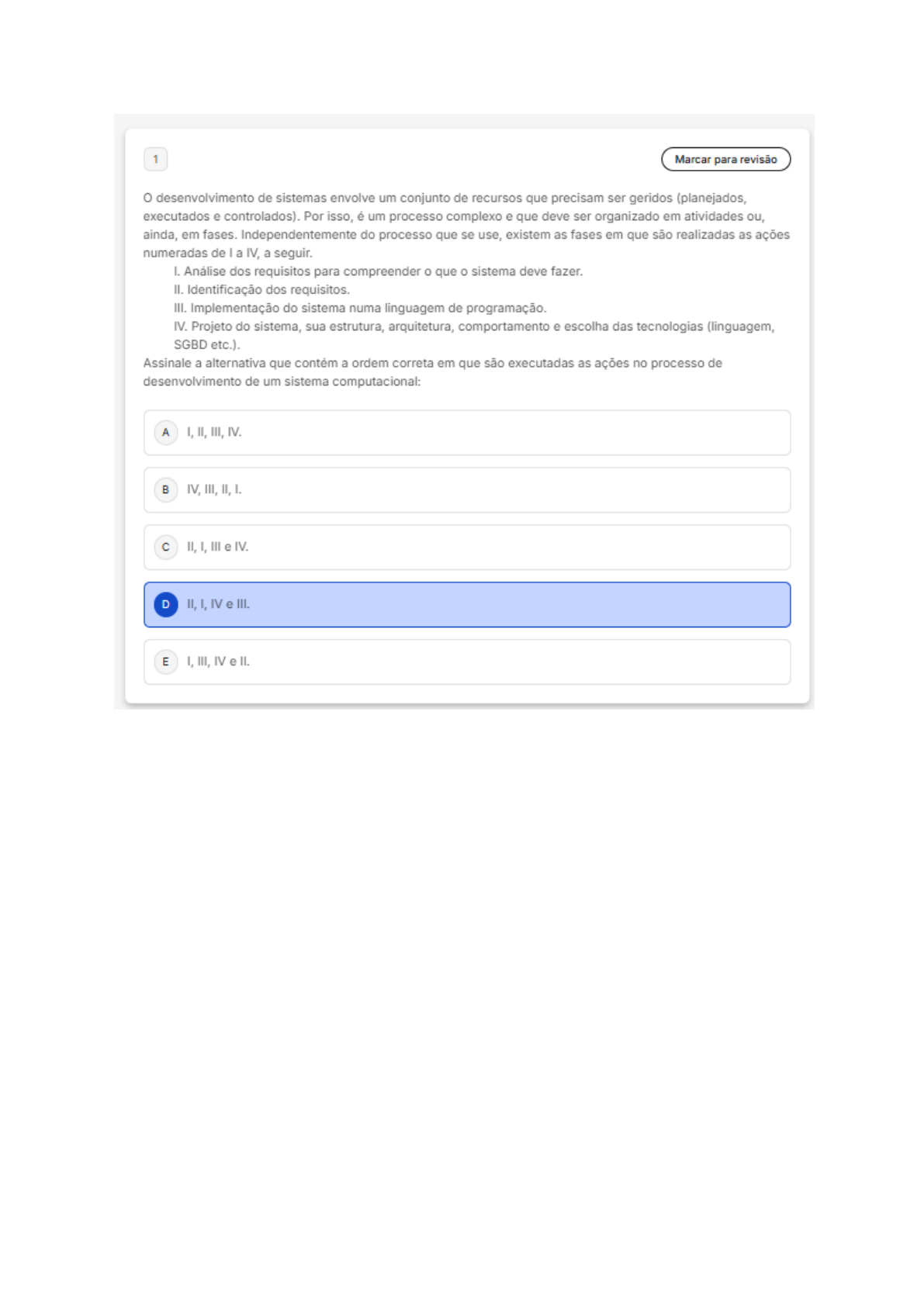 1 Marcar para revisão o desenvolvimento de sistemas envolve um conjunto de recursos que precisam ser geridos (planejados, executados e controlados). Por isso, é um processo complexo e que deve ser organizado em atividades ou, ainda, em fases. Independentemente do processo que se use, existem as fases em que são realizadas as ações numeradas de la IV, a seguir. Análise dos requisitos para compreender o que o sistema deve fazer. II. Identificação dos requisitos. III. Implementação do sistema numa linguagem de programação. IV. Projeto do sistema, sua estrutura, arquitetura, comportamento e escolha das tecnologias (linguagem, SGBD etc.). Assinale a alternativa que contém a ordem correta em que são executadas as ações no processo de desenvolvimento de um sistema computacional: A I, II, III, IV. IV, III, II, I. C II, I, III e IV. D II, I, IV e III. E I, III, IV e II.2 Marcar para revisão Modelos são ferramentas extremamente úteis quando desenvolvemos sistemas computacionais. Um dos benefícios é a possibilidade de servir como instrumento de comunicação das ideias para construção do sistema, entre membros da equipe de desenvolvimento e destes com os usuários. I. 0 programador precisa construir os programas e pode ter a necessidade de consultar determinado diagrama para um entendimento primordial das implementações. II. Os projetistas do software não precisam compreender a realidade dos requisitos para realizar seu trabalho. III. Os modelos de análise nascem a partir de um documento primordial, denominado Documento de Requisitos do Sistema. IV. Os usuários validam os modelos junto à equipe de desenvolvimento. Assinale a ÚNICA alternativa que contém apenas as assertivas corretas: A Estão corretas as assertivas I e II. Estão corretas as assertivas I, e IV. Estão corretas as assertivas Il e IV. D Estão corretas as assertivas I, III e IV. E Somente a assertiva III está correta.3 Marcar para revisão Modelos vêm ajudando cada vez mais as pessoas a desenvolverem suas ideias de forma gráfica e discutir facilmente com sua equipe e com os usuários. Avalie as assertivas e II, a seguir. I. Uma realidade complexa exige maior número de perspectivas de análise do que um problema mais elementar. PORQUE II. Para entender a totalidade, precisamos enxergar o problema sob várias perspectivas. E assinale a alternativa correta. A As assertivas e são verdadeiras e a assertiva justifica a I. B As assertivas e são verdadeiras e a assertiva não justifica a I. C As assertivas e são falsas. D A assertiva é verdadeira e a assertiva é falsa. A assertiva é falsa e a assertiva é verdadeira.4 Marcar para revisão 0 contexto é um sistema de gestão de uma carteira de investimentos, no qual usuário pode comprar e vender ações da bolsa, enviando uma ordem de compra ou venda a sua corretora. Considere os seguintes requisitos pertinentes ao contexto descrito anteriormente. Deve ser envio de ordem de compra pelo sistema. II. Deve ser envio de ordem de venda pelo sistema. III. A emissão da ordem deve ser segura e deve seguir protocolo específico. IV. A interface deve permitir destreza nas operações, pois estas precisam ser práticas e permitir agilidade. V. Deve ser ao investidor emitir posição financeira de seu saldo atualizado. VI. A segurança é fundamental para que dados financeiros não sejam alvos de ataques. Assinale a alternativa que contém apenas os requisitos não funcionais: A III, IV e VI. IV e VI. C D e IV. II, e V. 5 Marcar para revisão Fonte: Adaptado de Q747519 CESPE 2018 TCE-MG Analista de Controle Externo Ciência da Computação Em um diagrama de caso de uso, ator representa: A programadores que vão implementar os casos de uso. papéis que humanos e outros sistemas podem assumir ao interagirem com sistema. C uma elipse e um rótulo com nome do caso de uso. D nomes das pessoas que interagem com o sistema. E humanos específicos que interagem com o sistema.6 Marcar para revisão A UML é uma linguagem unificada de modelagem que surgiu da união de alguns métodos de profissionais do mercado. Passou a ser adotada pela OMG e tornou-se uma linguagem universal, padronizada. Sobre a UML, avalie as alternativas a seguir e assinale a ÚNICA que é falsa: A UML não determina os diagramas que devem ser usados e nem a ordem com que devem ser A usados. B A UML é independente de tecnologia. C A UML qualifica-se para ser usada em todo processo de desenvolvimento de software. D A UML disponibiliza diagramas estruturais e comportamentais. E A UML tem restrições de uso, caso o sistema seja implementado em determinadas linguagens.7 Marcar para revisão Fonte: CESGRANRIO 2018 Transpetro Analista de Sistemas Júnior SAP Um sistema deve controlar projetos de software, os quais podem ou não gerar artefatos. Para cada projeto, é necessário conhecer seu nome e status (ATIVO ou INATIVO). Deve-se saber, para cada artefato gerado pelo projeto, qual o seu número de série, além de um indicador de patente obtida (SIM ou NÃO). Na documentação desse projeto, foi apresentado o seguinte diagrama UML: PKY: numSerie: 1234 Projeto indPatente: NÃO nome: Projeto ABC status: ATIVO XYZ: numSerie: 5678 SIM Qual o tipo de diagrama apresentado? A Classes Interações C Pacotes D Objetos E Máquinas de Estados8 Marcar para revisão Fonte: FAURGS 2018 UFCSPA RS Analista de Tecnologia da Informação Sistema de Informação Sobre Casos de Uso e Diagramas de Casos de Uso da UML 2.5, considere as seguintes afirmações. Casos de Uso e Diagrama de Casos de Uso UML ajudam a determinar a funcionalidade e as características do software sob ponto de vista do usuário. Alguns Casos de Uso podem estar relacionados com outros. Por exemplo, há passos similares para gravar uma lista de músicas em um CD e carregar uma lista de músicas em um celular. Em ambos os casos, usuário primeiro cria uma lista vazia e, em seguida, acrescenta as músicas de suas pastas na lista. Para evitar duplicação