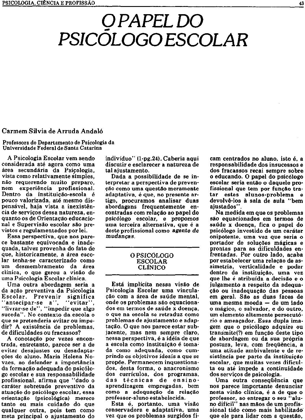O PAPEL DO PSICÓLOGO ESCOLAR Carmem Silvia de Arruda Andaló Professora do Departamento de Psicologia da Universidade Federal de Santa Catarina A Psicologia Escolar vem sendo considerada até agora como uma área secundária da Psicologia, vista como relativamente simples, não requerendo muito preparo, nem experiência profissional. Dentro da instituição-escola é pouco valorizada, até mesmo dis pensável, haja vista a inexistên cia de serviços dessa natureza, en quanto os de Orientação educacio nal e Supervisão escolar são pre vistos e regulamentados por lei. Essa perspectiva, que nos pare ce bastante equivocada e inade quada, talvez provenha do fato de que, historicamente, a área esco lar tenha-se caracterizado como um desmembramento da área clínica, o que gerou a visão de uma Psicologia Escolar clínica. Uma outra abordagem seria a da ação preventiva da Psicologia E s c o l a r . P r e v e n i r s ign i f i ca " a n t e c i p a r - s e a " , " e v i t a r " , "livrar-se de" , "impedir que algo suceda". No contexto da escola o que se pretenderia evitar ou impe dir? A existência de problemas, de dificuldades ou fracassos? A conotação por vezes encon trada, entretanto, parece ser a de evitar desajustes ou desadapta ções do aluno. Maria Helena No vaes, ao defender a importância da formação adequada do psicólo go escolar e sua responsabilidade profissional, afirma que "dado o caráter sobretudo preventivo da atuação do psicólogo escolar, essa orientação (psicológica) merece tanto ou mais cuidado do que qualquer outra, pois tem como meta principal o ajustamento do indivíduo" (l-pg.24). Caberia aqui discutir e esclarecer a natureza de tal ajustamento. Dada a possibilidade de se in terpretar a perspectiva de preven ção como uma questão meramente adaptativa, é que, no presente ar tigo, procuramos analisar duas abordagens frequentemente en contradas com relação ao papel do psicólogo escolar, e propomos uma terceira alternativa, que é a deste profissional como agente de mudanças. O PSICÓLOGO ESCOLAR CLÍNICO Está implícita nessa visão de Psicologia Escolar uma vincula ção com a área de saúde mental, onde os problemas são equaciona dos em termos de saúde x doença, o que na escola se retraduz como problemas de ajustamento e adap tação. O que nos parece estar sub jacente, mas nem sempre claro, nessa perspectiva, é a idéia de que a escola como instituição é toma da como adequada, como cum prindo os objetivos ideais a que se propõe. Permanecem inquestiona¬ dos, desta forma, o anacronismo dos currículos, dos programas, d a s t é c n i c a s d e e n s i n o - aprendizagem empregadas, bem como a adequação da relação professor-aluno estabelecida. Esta é, portanto, uma visão conservadora e adaptat iva, uma vez que os problemas surgidos fi cam centrados no aluno, isto é, a responsabilidade dos insucessos e dos fracassos recai sempre sobre o educando. O papel do psicólogo escolar seria então o daquele pro fissional que tem por função tra ta r es tes a lunos-problema e devolvê-los à sala de aula "bem ajustados". Na medida em que os problemas são equacionados em termos de saúde x doença, fica o papel do psicólogo investido de um caráter onipotente, uma vez que seria o portador de soluções mágicas e prontas para as dificuldades en frentadas. Por outro lado, acaba por estabelecer uma relação de as simetria, verticalidade e poder dentro da instituição, uma vez que lhe é atribuída a decisão e o julgamento a respeito da adequa ção ou inadequação das pessoas em geral. São as duas faces de uma mesma moeda — de um lado o mágico, o salvador, e do outro, um elemento altamente persecutó rio e ameaçador. Essa dupla ima gem que o psicólogo adquire ou transmite(?) em função deste tipo de abordagem ou da sua própria postura, leva, com freqüência, a uma atitude ambivalente e de re sistência por parte da instituição escolar, que muitas vezes dificul ta ou até impede a continuidade dos serviços de psicologia. Uma outra conseqüência que nos parece importante denunciar nesta visão clínica, é a de que o professor, ao entregar o seu "alu no difícil" nas mãos de um profis sional tido como mais habilitado que ele para lidar com a questão, Eduarda Moura Eduarda Moura Eduarda Moura Eduarda Moura Eduarda Moura Eduarda Moura 44 PSICOLOGIA, CIÊNCIA E PROFISSÃO se exime da sua responsabilidade para com este aluno. Passa então a considerá-lo como um problema que não é seu e que deveria ser so lucionado fora do contexto de sala de aula, que é o seu ambiente de trabalho, a saber, no gabinete de Psicologia. Na realidade, porém, a criança que apresenta dificulda des, mesmo quando atendida por outros profissionais, enquanto aluna continua sendo problema do professor e da sua turma e como tal deve ser assumida. É também frequente, no traba lho clínico dentro da escola, o uso de testes variados, desde as tradi cionais medidas de QI até provas de personalidade, com elaboração de diagnósticos e orientação bas tante minuciosas e aprofundadas. Ocorre, entretanto, que este tra balho todo se torna infrutífero e sem sentido, pois é comum as famílias se recusarem a aceitar a orientação, preferindo atribuir as causas do insucesso escolar à pró pria instituição, que é então acu sada de ineficiente. É evidente que, ao buscar uma orientação psicológica, todo cliente passa por um processo, frequentemente lon go e ambivalente, de lidar e acei tar as suas próprias dificuldades ou deficiências. Ora, na medida em que a escola toma a iniciativa de realizar esse processo, através do serviço de Psicologia, sem uma conscientização gradativa e es pontânea da família a respeito do seu filho-problema, o resultado deverá ser ou um recusa de cola borar até mesmo na fase inicial de diagnóstico, ou uma rejeição clara e aberta da orientação oferecida. Uma outra dificuldade é a de os dados obtidos através de