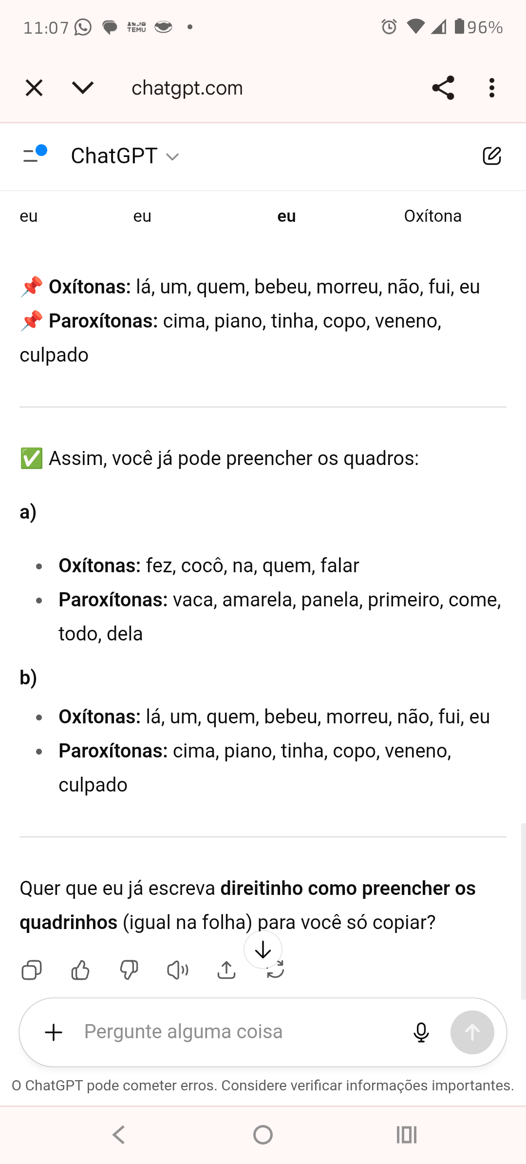 11:07 TEMU L 96% X chatgpt.com ChatGPT eu eu eu Oxítona Oxítonas: lá, um, quem, bebeu, morreu, não, fui, eu Paroxítonas: cima, piano, tinha, copo, veneno, culpado Assim, você já pode preencher os quadros: a) Oxítonas: fez, cocô, na, quem, falar Paroxítonas: vaca, amarela, panela, primeiro, come, todo, dela b) Oxítonas: lá, um, quem, bebeu, morreu, não, fui, eu Paroxítonas: cima, piano, tinha, copo, veneno, culpado Quer que eu já escreva direitinho como preencher os quadrinhos (igual na folha) para você só copiar? + Pergunte alguma coisa ChatGPT pode cometer erros. Considere verificar informações importantes.