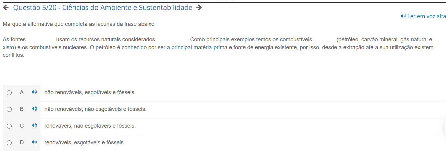 Questão 5/20 Ciências do Ambiente e Sustentabilidade Ler em voz alta Marque a alternativa que completa as lacunas da frase abaixo As fontes usam recursos naturais considerados Como principais exemplos temos combustíveis (petróleo, carvão mineral, gás natural e xisto) e combustíveis nucleares. petróleo é conhecido por ser a principal matéria-prima e fonte de energia existente, por isso, desde a extração até a sua utilização existem conflitos. A não renováveis, esgotáveis e fósseis. B não renováveis, não esgotáveis e fósseis. C renováveis, não esgotáveis e fósseis. D renováveis, esgotáveis e fósseis.