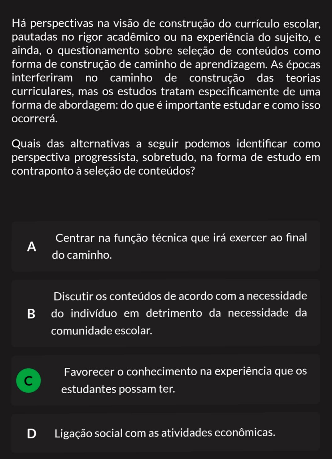 Há perspectivas na visão de construção do currículo escolar, pautadas no rigor acadêmico ou na experiência do sujeito, e ainda, o questionamento sobre seleção de conteúdos como forma de construção de caminho de aprendizagem. As épocas interferiram no caminho de construção das teorias curriculares, mas os estudos tratam especificamente de uma forma de abordagem: do queé importante estudar e como isso Ocorrerá. Quais das alternativas a seguir podemos identificar como perspectiva progressista, sobretudo, na forma de estudo em contraponto à seleção de conteúdos? A B Centrar na função técnica que irá exercer ao final do caminho. Discutir os conteúdos de acordo com a necessidade do indivíduo em detrimento da necessidade da comunidade escolar. Favorecer o conhecimento na experiência que os estudantes possam ter. D Ligação social com as atividades econômicas. Nos anos 1970, também como apontam Lopes e Macedo (2011), houve críticas do currículo como aparato de controle Social, chamadas de teorias da correspondência reprodução. Isso implica na imposição de cultura, saberes e comportamentos dos determinadores de currículo para as classes sociais, e ainda leva a crença de que a igualdade de oportunidades, quando há divergências em caminhos e condições sociais, sobretudo, de acesso à cultura e experiências diversificadas. FONTE: LOPES, Alice Casimiro; MACEDO, Elizabeth. Teorias de currículo. São Paulo: Cortez, 2011. No texto base, quais autores formularam, com apoio da Nova Sociologia da Educação (NSE), estudos sobre a ideia de currículo como objeto modelado constantemente pela sociedade? A Freinet e Freire. B C D Apple e Young. Piaget e Perrenoud. Montessori e Macedo. A participação da comunidade na construção da escola é importante para os engajamentos, a criação de utopias e solução de problemas. Neste contexto, a participação dos membros da comunidade escolar (pais, responsáveis e cidadãos interessados na educação) deve ser valorizada e possuir caminho legal para efetivação das decisões coletivas. Qual desses caminhos podem ser considerados participativos? A B Conselhos escolares. D Aplicação de provas para os indicadores externos. C Supervisão escolar pela secretaria de Educação. Controle de frequência escolar. As formas de comunicação e de construção de textos com as TDIC se multiplicaram em formas e tempos. Isso também se aplica ao contexto multimídia ligado ao digital. Neste caminho, Rojo (2012) tratou das formas contemporâneas. FONTE: ROJO, Roxane Helena R. Multiletramentos na escola. ROJO, ROxane; MOURA, Eduardo (Orgs.). São Paulo: Parábola Editorial, 2012. Qual o contexto apresentado por Rojo (2012) no sentido de proficiência nestes processos de comunicação? A Multifuncionalidades dos hardwares. comunicacionais B D Alfabetização digital para o uso de computadores. C Multimodalidades de uso dos computadores. Multiletramentos das formas de acessar e produzir textos. As políticas redistributivas, a exemplo do Pronera, são implementadas no sentido de reduzir as desigualdades sociais nas suas várias dimensões, n�o se restringindo somente sobre a renda da população, mas também sobre diversos serviços públicos como a educação, com o intuito de reduzir os impactos na sociedade no tocante à redução dos conflitos sociais (CAETANO; CARDOSO; SANTOS, 2019, p. 134). FONTE: SANTOS, Arlete Ramos dos; CARDOSo, Elisângela Andrade Moreira; CAETANO, Maria Raquel (organizadores). Poliíticas Educacionais no Cenário Brasileiro: reificações e contradições no sistema capitalista. 1. ed. Curitiba: Appris, 2019. Qual das ações legais a seguir é importante política distributiva de financiamento da Educação Básica, lembrando que têm a função de garantir o acesso por meio de redistribuição de impostos arrecadados? A Plano Nacional de Educação (PNE). B D Lei do Menor Aprendiz. Fundo de Manutenção e Desenvolvimento da Educação Básica (FUNDEB). Lei de Diretrizes e Bases (LDB). Os planejamentos coletivos organizados pelos conselhos de educação são de suma importância para ações de melhoria continuada e criação de utopias (novos projetos). Estes documentos organizam ações e estabelecem caminhos qualitativos e quantitativos com relação ao desenvolvimento de todas as comunidades escolares, como forma de orientar, cobrar e regular os processos educacionais. Qual documento decenal traduz as ações educacionais intencionadas por estes conselhos? A B D A Base Nacional Comum Curricular (BNCC). Os Parâmetros Curriculares Nacionais (PCN). O Plano Nacional de Educação (PNE). O Projeto Político Pedagógico (PPP). A transformação das casas de moradia dos estudantes em "escolas" se deu pela necessidade de atendimento ao sentido de ciclos de passagens (12 anos) que formaram os cursos com base no ramismo. Qual era a diferença que existia até então no contexto de oferta do estudo nas universidades como a de Bolonha? A B D Apenas com relação ao poder habitar a casa que agora recebia muitas pessoas. Mudou de 10 anos para 12 anos segundo informam OS registros da época. A tutoria, pois o aluno antes era orientado por um professor em caminho único. Nenhuma, pois a adaptação atendeu aos locais onde não havia universidade. Os estudos de Chizzotti e Casali (2012) tratam da produção da Organização para Cooperação e Desenvolvimento Econômico (0CDE), que elaborou o relatório DeSeCo tratando das habilidades necessárias para o desenvolvimento dos estudantes, isso posto no contexto dos estados-nação europeus. Neste sentido, envolveu a necessidade de desenvolvimento econômico e social como forma de produção de inovações e tecnologias. FONTE: CHIZZOTTI, Antonio; CASALI, Alípio. O paradigma curricular europeu das competências. Cadernos de História da Educação, v. 11, n. 1, p. 13-30, Jan./Jun. 2012. Segundo o texto da disciplina, quais foram os principais motivos desse relatóri