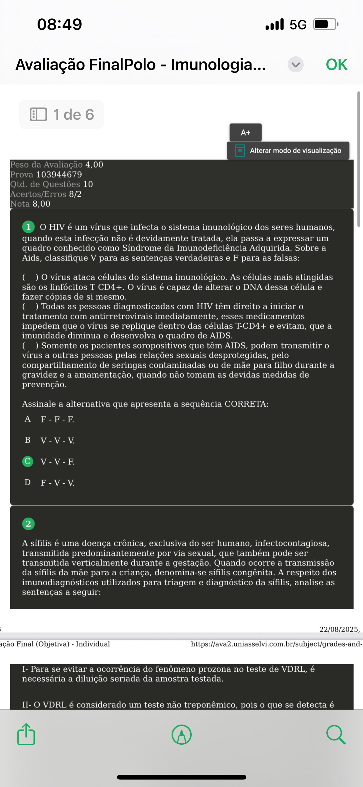 08:49 5G Avaliação FinalPolo - Imunologia... OK 1 de 6 A+ Alterar modo de visualização Peso da Avaliação 4,00 Prova 103944679 Qtd. de Questões 10 Acertos/Erros 8/2 Nota 8,00 1 HIV é um vírus que infecta o sistema imunológico dos seres humanos, quando esta infecção não é devidamente tratada, ela passa a expressar um quadro conhecido como Síndrome da Imunodeficiência Adquirida. Sobre a Aids, classifique V para as sentenças verdadeiras e F para as falsas: ( ) vírus ataca células do sistema imunológico. As células mais atingidas são os linfócitos T CD4+. vírus é capaz de alterar DNA dessa célula e fazer cópias de si mesmo. ( ) Todas as pessoas diagnosticadas com HIV têm direito a iniciar tratamento com antirretrovirais imediatamente, esses medicamentos impedem que vírus se replique dentro das células T-CD4+ e evitam, que a imunidade diminua e desenvolva quadro de AIDS. ( ) Somente os pacientes soropositivos que têm AIDS, podem transmitir vírus a outras pessoas pelas relações sexuais desprotegidas, pelo compartilhamento de seringas contaminadas ou de mãe para filho durante a gravidez e a amamentação, quando não tomam as devidas medidas de prevenção. Assinale a alternativa que apresenta a sequência CORRETA: A F F F. C D 2 A sífilis é uma doença crônica, exclusiva do ser humano, infectocontagiosa, transmitida predominantemente por via sexual, que também pode ser transmitida verticalmente durante a gestação. Quando ocorre a transmissão da sífilis da mãe para a criança, denomina-se sífilis congênita. A respeito dos imunodiagnósticos utilizados para triagem e diagnóstico da sífilis, analise as sentenças a seguir: 22/08/2025, Final (Objetiva) Individual https://ava2.uniasselvi.com.br/subject/grades-and- I- Para se evitar a ocorrência do fenômeno prozona no teste de VDRL, é necessária a diluição seriada da amostra testada. II- VDRL é considerado um teste não treponêmico, pois que se detecta é