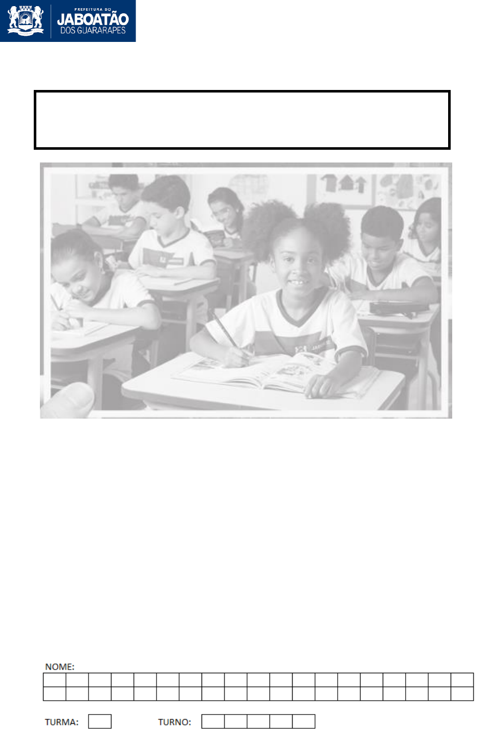 PREFEITURA MUNICIPAL DO JABOATÃO DOS GUARARAPES SECRETARIA MUNICIPAL DE EDUCAÇÃO SECRETARIA EXECUTIVA DE GESTÃO PEDAGÓGICA SUPERINTENDÊNCIA DE DESENVOLVIMENTO DO ENSINO LÍNGUA PORTUGUESA MATEMÁTICA 2º ANO DO ENSINO FUNDAMENTAL SIMULADO DO 1° BIMESTRE 2018 DA REDE MUNICIPAL DO JABOATÃO DOS GUARARAPES 1º Simulado de Língua Portuguesa e Matemática (2º Ano do Ensino Fundamental) ESCOLA: NOME: ANO: 2º DO ENSINO FUNDAMENTAL/TURMA: TURNO: 1º SIMULADO DE 2018 MATEMÁTICA LÍNGUA PORTUGUESA 1º Simulado de Língua Portuguesa e Matemática (2º Ano do Ensino Fundamental) QUESTÃO 01 Observe as placas. Faça um X no quadradinho que mostra a placa que contém somente letras. (A) (B) (C) (D) 1º Simulado de Língua Portuguesa e Matemática (2º Ano do Ensino Fundamental) QUESTÃO 02 Faça um X no quadradinho que mostra as letras: P, F, V. (A) (B) (C) (D) P B M V F T F N D P F V 1º Simulado de Língua Portuguesa e Matemática (2º Ano do Ensino Fundamental) QUESTÃO 03 Leia a palavra abaixo. Escola Faça um X no quadradinho onde aparece a palavra que você leu escrita de outra forma. (A) ESCOLA (B) escolha (C) ESCOVA (D) espora 1º Simulado de Língua Portuguesa e Matemática (2º Ano do Ensino Fundamental) QUESTÃO 04 Faça um X no quadradinho onde aparecem as duas figuras nas quais as palavras rimam. (A) (B) (C) (D) 1º Simulado de Língua Portuguesa e Matemática (2º Ano do Ensino Fundamental) QUESTÃO 05 Observe a figura abaixo: Marque um X no quadradinho que está escrito o nome da figura. (A) CAMA (B) DAMA (C) FAMA (D) LAMA 1º Simulado de Língua Portuguesa e Matemática (2º Ano do Ensino Fundamental) QUESTÃO 06 Veja a cena abaixo. . Faça um X na frase que indica o que acontece na cena. (A) O MENINO JOGA ARGOLA. (B) O MENINO JOGA BOLA. (C) O MENINO TEM UMA MOLA. (D) O MENINO VIU A CAMISOLA. 1º Simulado de Língua Portuguesa e Matemática (2º Ano do Ensino Fundamental) QUESTÃO 07 Leia o texto: ABELHAS PASSAM A MAIOR PARTE DA VIDA (CERCA DE 7 MESES) VISITANDO FLORES PARA COLETAR PÓLEN E NÉCTAR, USADOS NA FABRICAÇÃO DE CERA E DE MEL. O MEL E O PÓLEN SÃO A BASE DA ALIMENTAÇÃO DESSES INSETOS. PARADIZO, S. Abelhas X Vespas. Revista Recreio. n. 662, 15 nov. 2012 (fragmento). Qual é a base da alimentação das abelhas? (A) FLORES E NÉCTAR. (B) MEL E PÓLEN. (C) CERA E PÓLEN. (D) MEL E CERA. 1º Simulado de Língua Portuguesa e Matemática (2º Ano do Ensino Fundamental) QUESTÃO 08 Observe a imagem e responda. A figura mostra: (A) PESSOAS NA FILA DO BANCO. (B) UMA CRIANÇA NA FILA DO SUPERMERCADO. (C) UM IDOSO ATRAVESSANDO A RUA. (D) AS DIFERENTES IDADES DA PESSOA. 1º Simulado de Língua Portuguesa e Matemática (2º Ano do Ensino Fundamental) QUESTÃO 09 Observe o cartaz. Disponível em: http://bibliotecamedicinauff.com.br. Acesso: 23 dez. 2013. Marque um X no quadradinho que mostra o assunto desse texto. (A) BRINCADEIRA DE SUPER-HERÓI. (B) CAMPANHA DE VACINAÇÃO. (C) DIVERSÃO NO PARQUE. (D) VENDA DE FANTASIAS. 1º Simulado de Língua Portuguesa e Matemática (2º Ano do Ensino Fundamental) QUESTÃO 10 Leia o texto. QUERIDA, VOU TRABALHAR ATÉ MAIS TARDE HOJE. JANTE COM AS CRIANÇAS. UM BEIJO, RICARDO Esse texto é: (A) UM BILHETE. (B) UMA CARTA. (C) UMA POESIA. (D) UMA RECEITA. 1º Simulado de Língua Portuguesa e Matemática (2º Ano do Ensino Fundamental) QUESTÃO 01 Ana estava brincando no parque. Faça um X no quadradinho que mostra quantas pedras separam Ana de seus amigos. (A) 15 (B) 13 (C) 12 (D) 11 1º Simulado de Língua Portuguesa e Matemática (2º Ano do Ensino Fundamental) QUESTÃO 02 Os cartões estão arrumados em ordem crescente, mas um deles ficou virado. Faça um X no quadradinho do cartão que está virado. (B) (C) (D) (A) 1º Simulado de Língua Portuguesa e Matemática (2º Ano do Ensino Fundamental) QUESTÃO 03 Veja os armários de uma sala de aula. Faça um X no quadradinho do armário mais alto da sala de aula. (A) (B) (C) (D) 1º Simulado de Língua Portuguesa e Matemática (2º Ano do Ensino Fundamental) QUESTÃO 04 O quadro mostra a quantidade de alunos por turma em uma escola. TURMA NÚMERO DE ALUNOS 1º ANO 24 2º ANO 28 3º ANO 21 4º ANO 33 Faça um X no quadradinho que mostra a turma que tem mais alunos. (A) 1º ano. (B) 2º ano. (C) 3º ano. (D) 4º ano. 1º Simulado de Língua Portuguesa e Matemática (2º Ano do Ensino Fundamental) QUESTÃO 05 Este é o número de crianças que foram ao passeio da escola: 32 Marque um X no quadradinho em que está escrito o número de crianças. (A) TRINTA E DOIS (B) VINTE E TRÊS (C) TRÊS E DOIS (D) DOIS E TRÊS 1º Simulado de Língua Portuguesa e Matemática (2º Ano do Ensino Fundamental) QUESTÃO 06 Veja as canetas que Ana comprou. Faça um X no quadradinho que representa o número de canetas que Ana comprou. (A) 3 (B) 4 (C) 7 (D) 8 1º Simulado de Língua Portuguesa e Matemática (2º Ano do Ensino Fundamental) QUESTÃO 07 Veja a brincadeira de Maria. Faça um X no quadradinho do número em que Maria está na brincadeira. (A) 7 (B) 6 (C) 5 (D) 1 1º Simulado de Língua Portuguesa e Matemática (2º Ano do Ensino Fundamental) QUESTÃO 08 Paula recebeu dezoito reais. Faça um X no quadradinho que mostra a quantia que Paula recebeu. (A) (B) (C) (D) 1º Simulado de Língua Portuguesa e Matemática (2º Anodo Ensino Fundamental) QUESTÃO 09 Na turma do segundo ano, a professora perguntou aos estudantes que desenho animado eles mais gostavam. O gráfico representa o resultado desta pesquisa. Qual foi o desenho animado mais votado? 0 2 4 6 8 10 Desenho Animado Preferido (A) (B) (C) (D) 1º Simulado de Língua Portuguesa e Matemática (2º Ano do Ensino Fundamental) QUESTÃO 10 A mãe de Rafael comprou tecido para fazer sua calça de uniforme. O instrumento utilizado para medir o tecido foi (A) (B) (C) (D)