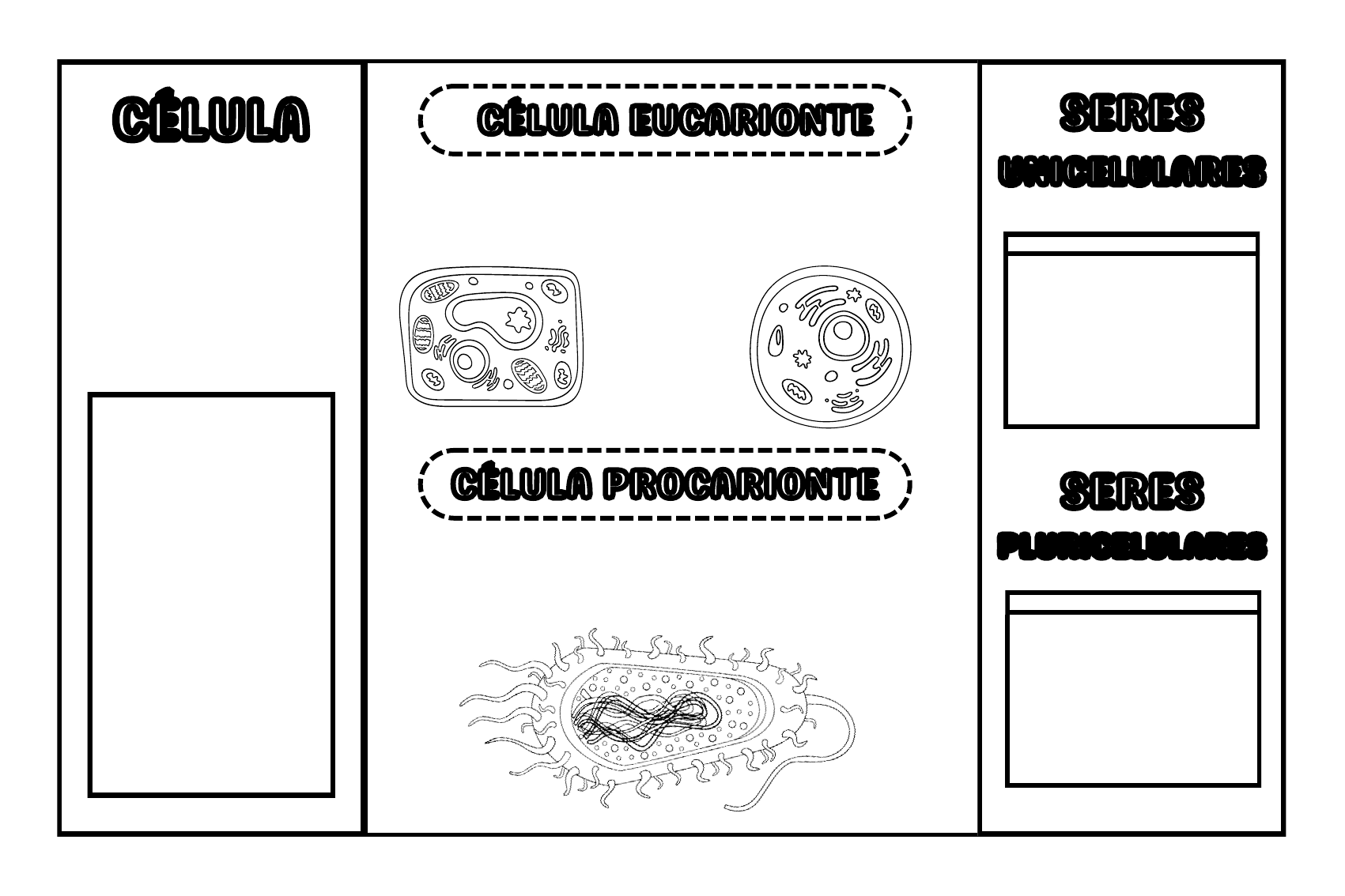 CÉLULA EUCARIONTECÉLULA EUCARIONTECÉLULACÉLULA Uma célula é a menor unidade estrutural e funcional dos organismos vivos. Todo ser vivo é formado por células. As células eucarióticas são complexas e têm um núcleo definido, onde o DNA é armazenado. Elas são encontradas em plantas, animais, fungos e muitos outros organismos multicelulares. CÉLULA PROCARIONTECÉLULA PROCARIONTE As células procarióticas são simples, não possuem membrana nuclear, logo o material genético fica disperso no citoplasma. As bactérias possuem células procariontes. SERES UNICELULARES SERES UNICELULARES SERES PLURICELULARES SERES PLURICELULARES C ÉL U LA C ÉL U LA Escreva os nomes das estruturas da célula eucarionte. PARTES DA CÉLULAPARTES DA CÉLULA A célula possui três partes principais: membrana plasmática, citoplasma e núcleo. Apenas as células eucariontes apresentam núcleo delimitado por membrana. Ele processa, empacota e distribui proteínas e lipídios produzidos pela célula, enviando-os para seus destinos corretos dentro e fora da célula. PlantasPlantas ORGANELASORGANELAS CELULARESCELULARES São responsáveis pela produção de energia da célula, através de um processo chamado respiração celular. MITOCÔNDRIAMITOCÔNDRIA RETÍCULO ENDOPLASMÁTICO RUGOSO RETÍCULO ENDOPLASMÁTICO RUGOSO Organela membranosa que tem ribossomos ligados à sua superfície e está envolvido na síntese de proteínas. RETÍCULO ENDOPLASMÁTICO LISO RETÍCULO ENDOPLASMÁTICO LISO Organela membranosa que está envolvido na síntese de lipídios e na desintoxicação celular. As organelas citoplasmáticas são estruturas encontradas dentro do citoplasma das células eucarióticas. Elas desempenham funções específicas essenciais para a vida da célula. COMPLEXO DE GOLGI COMPLEXO DE GOLGI LISOSSOMOSLISOSSOMOS São vesículas que contêm enzimas digestivas especializadas que quebram macromoléculas, em moléculas menores que podem ser utilizadas pela célula. CENTRÍOLOCENTRÍOLO São estruturas envolvidas na formação dos cílios, flagelos e no processo de divisão celular, ajudando na organização dos microtúbulos durante a mitose e a meiose. São seres vivos formados por uma única célula que desempenha todas as funções necessárias à vida, como metabolismo e reprodução. BactériasBactérias ProtozoáriosProtozoários Os seres pluricelulares são organismos compostos por múltiplas células organizadas em tecidos, órgãos e sistemas. AnimaisAnimais