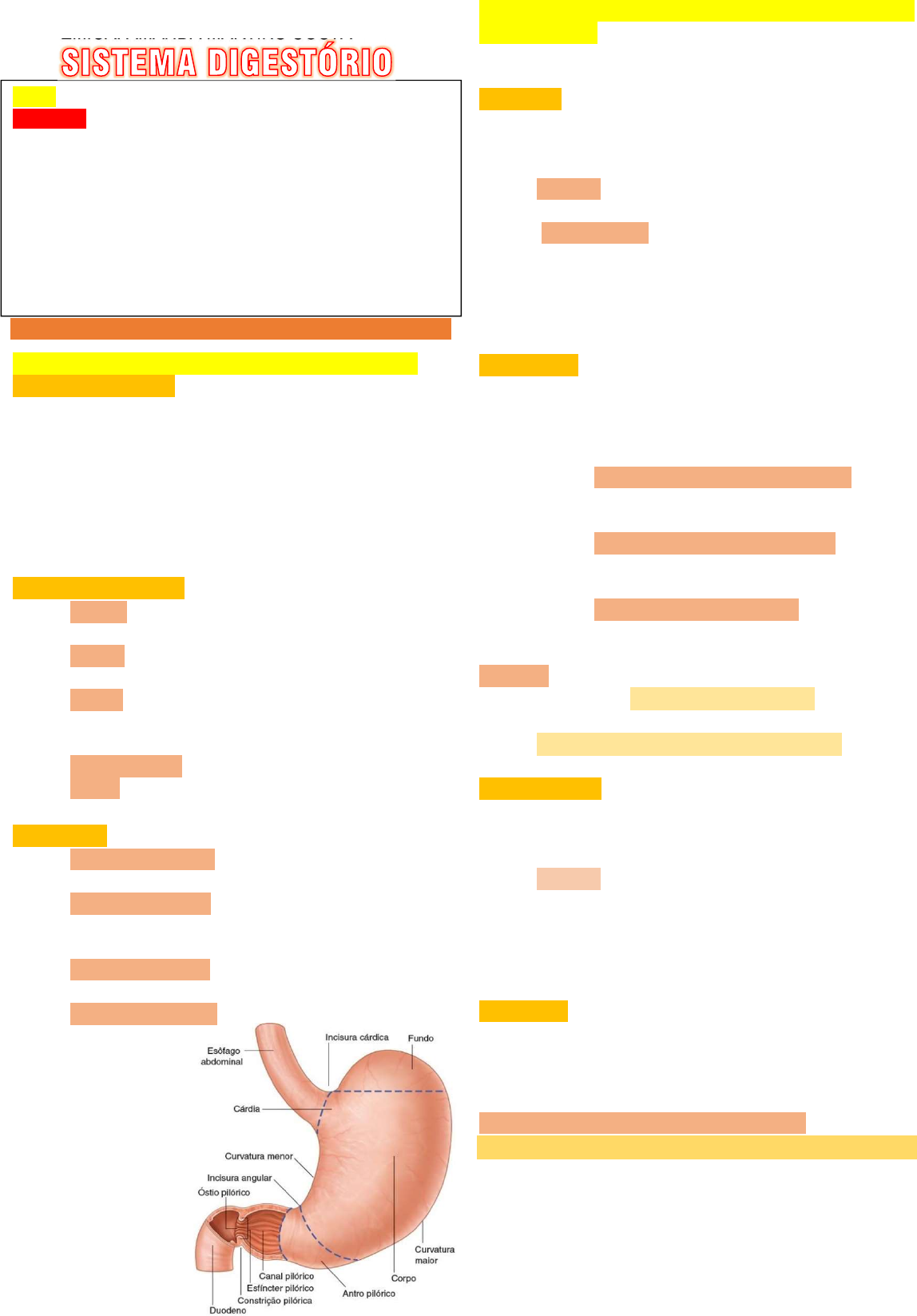 APG 4º PERÍODO ACADÊMICA: AMANDA MARTINS COSTA 2. Camadas da Parede Gástrica (Morfologia Microscópica) O estômago possui 4 camadas histológicas principais (de fora para dentro): 1. Serosa: Camada externa de tecido conjuntivo frouxo coberta por mesotélio (epitélio simples pavimentoso). Função: reveste o estômago e o protege contra atrito com outros órgãos. Composição: Fibras colágenas e elásticas. Vasos sanguíneos, linfáticos e nervos. Faz parte do peritônio visceral (membrana serosa), permitindo mobilidade e fixação ao peritônio parietal. 2. Muscular: Formada por três camadas de músculo liso, permitindo movimentos de mistura (triturar e agitar o alimento). (único órgão digestivo com três camadas): Camada longitudinal externa: fibras orientadas ao longo do eixo maior do estômago. Camada circular média: fibras dispostas em anel; espessada no piloro para formar o esfíncter pilórico. Camada oblíqua interna: exclusiva do estômago, auxilia nos movimentos intensos de mistura e trituração. Função: Promover peristaltismo gástrico (mistura e propulsão do conteúdo). Controlar o esvaziamento gástrico através do esfíncter pilórico. 3. Submucosa: Tecido conjuntivo denso não modelado, rico em fibras colágenas, que contém vasos sanguíneos, linfáticos e nervos. Função: serve de suporte para os vasos sanguíneos, linfáticos e nervos que irrigam e inervam a mucosa. Contém o plexo submucoso de Meissner, parte do sistema nervoso entérico, que regula secreção e fluxo sanguíneo. 4. Mucosa: Camada mais interna, com invaginações formando as glândulas gástricas. Altamente especializada, é onde ocorre a secreção de enzimas, ácido e muco. A mucosa apresenta três subcamadas: a) Epitélio de revestimento Epitélio colunar simples, composto por células mucosas superficiais. Forma invaginações chamadas fóveas gástricas (ou criptas). Responsável pela produção de muco protetor contra o HCl. MORFOFISIOLÓGIA DO ETÔMAGO 1. Anatomia Macroscópica (Morfologia Externa) Posição anatômica: Localiza-se na parte superior do abdome, principalmente no hipocôndrio esquerdo e epigástrio. Está situado anterior ao pâncreas, aos vasos esplênicos e ao rim esquerdo. A face anterior do estômago relaciona-se com a parede abdominal anterior e com o lobo inferior esquerdo do fígado. Partes do estômago: Cárdia: região de transição entre o esôfago e o estômago. Fundo: parte superior, em forma de cúpula, acima da junção cárdica. Corpo: porção central e maior, responsável por grande parte da digestão química e mecânica. Antro pilórico: porção final do estômago. Piloro: esfíncter que regula a passagem do conteúdo gástrico para o duodeno. Curvaturas: Curvatura menor: localizada no lado medial, que é o ponto de fixação do omento menor. Curvatura maior: localizada no lado lateral, que é o ponto de fixação do ligamento gastresplênico e do omento maior; Incisura cárdica: que é o ângulo superior criado quando o esôfago entra no estômago; Incisura angular: que é uma curva na pequena curvatura. S2P2: GATRITE E HELICOBACTER-PYLORI Objetivos Rever a morfofisiológia do estômago. Entender a epidemiologia, etiologia, fatores de risco, fisiopatologia, manifestações clínicas, diagnóstico e tratamento da gastrite aguda e crônica. Estudar a microbiologia da bactéria H.Pylori. Compreender contagio, diagnóstico e tratamento (esquema) da H.pylori. Entender a evolução da úlcera péptica. APG 4º PERÍODO ACADÊMICA: AMANDA MARTINS COSTA 2. EPIDEMIOLOGIA Gastrite Aguda: Mais comum em adultos submetidos a fatores agudos (AINEs, álcool, estresse). Incidência significativa em pacientes hospitalizados com doenças graves (gastrite de estresse). Associada a internações por sangramento digestivo alto. Gastrite Crônica: Altamente prevalente mundialmente. Estima-se que 2/3 da população mundial seja colonizada por Helicobacter pylori (H. pylori). A prevalência varia conforme: Nível socioeconômico: maior em países em desenvolvimento. Idade: infecção mais comum em idosos. Etnias: maior em afro-americanos e hispânicos nos EUA. 2. ETIOLOGIA Gastrite Aguda Medicamentos: anti-inflamatórios não esteroides (AINEs), corticosteroides. Substâncias irritantes: álcool, cafeína, alimentos condimentados. Estresse fisiológico intenso: queimaduras graves (úlcera de Curling), traumatismos, sepse, cirurgias. Infecções: principalmente H. pylori, mas também vírus, fungos ou bactérias em pacientes imunocomprometidos. Refluxo biliar. Gastrite Crônica Tipo A (autoimune): Anticorpos contra células parietais e fator intrínseco. Associada à anemia perniciosa e deficiência de vitamina B12. Tipo B (bacteriana): Infecção crônica por Helicobacter pylori, que leva à inflamação e eventual atrofia da mucosa. Tipo C (química): Causada por refluxo biliar, uso crônico de AINEs ou álcool. Outros: gastrite eosinofílica, linfocítica, granulomatosa, radiação. 3. FATORES DE RISCO 1. Uso de AINEs (Anti-inflamatórios não esteroides) Exemplos: ibuprofeno, naproxeno, diclofenaco, aspirina. Mecanismo: Inibem as enzimas ciclooxigenases (COX-1 e COX-2). A COX-1 é responsável pela produção de prostaglandinas protetoras da mucosa gástrica (aumentam secreção de muco, bicarbonato e fluxo sanguíneo mucoso). b) Lâmina própria Tecido conjuntivo frouxo localizado entre as glândulas gástricas. Contém: Glândulas gástricas: presentes em diferentes regiões (fundo, corpo, antro). Células imunológicas e capilares sanguíneos. Tipos celulares principais nas glândulas: Célula Localização Secreção/Função Células mucosas do pescoço fundo das fóveas Produzem muco menos viscoso Células principais base das glândulas Secretam pepsinogênio (precursor da pepsina) Células parietais (oxínticas) corpo/fundo das glândulas Produzem HCl e fator intrínseco Células enteroendócrinas (ex: G) principalmente no antro Secretam gastrina e outros 