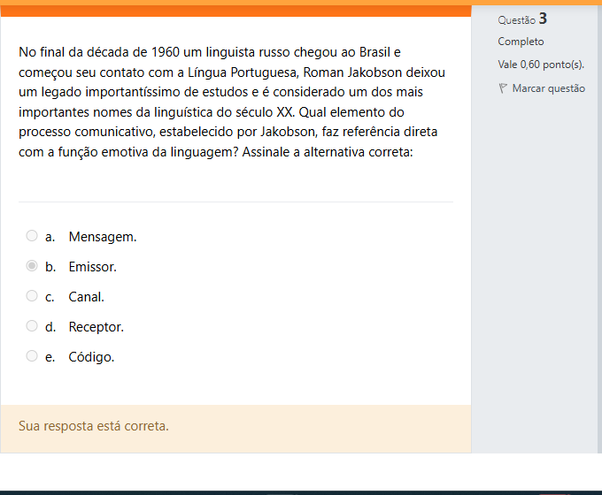 Questão 3 Completo No final da década de 1960 um linguista russo chegou ao Brasil e Vale 0,60 ponto(s). começou seu contato com a Língua Portuguesa, Roman Jakobson deixou um legado de estudos e é considerado um dos mais Marcar questão importantes nomes da linguística do século XX. Qual elemento do processo comunicativo, estabelecido por Jakobson, faz referência direta com a função emotiva da linguagem? Assinale a alternativa correta: a. Mensagem. b. Emissor. C. Canal. d. Receptor. e. Código. Sua resposta correta.