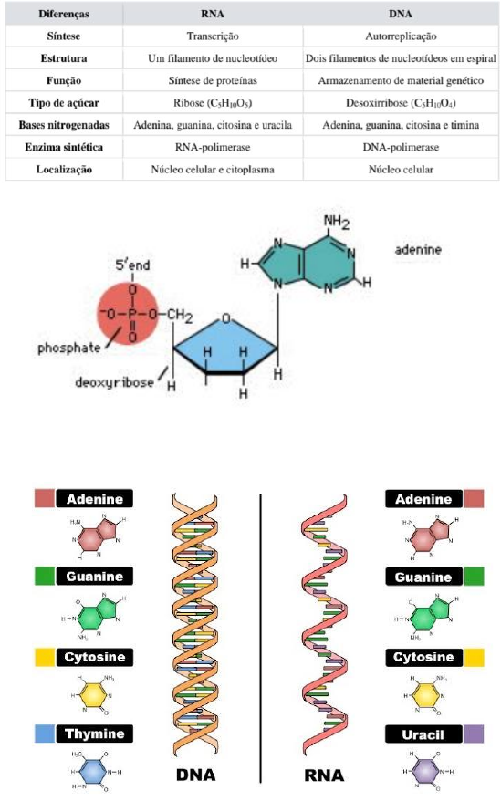 • Ácidos Nucleicos São polímeros, constituídos por moléculas chamadas de nucleotídeos. E Estão envolvidos no armazenamento, transmissão e processamento de informações genéticas de uma célula. Exemplos; - Ácido desoxirribonucleico (DNA), portador das informações genéticas. Contém instruções para o desenvolvimento e funcionamento dos organismos; - Ácido ribonucleico (RNA), desempenha papéis na célula como a síntese de proteínas e a regulação da expressão gênica; • Nucleotídeos São subunidades do DNA e RNA, compostas por um grupo fosfato, bases nitrogenadas e uma pentose ( açúcar). Esses nucleotídeos estão ligados um ao outro por ligações fosfodiéster estabelecidas entre o açúcar e um fosfato do outro nucleotídeo. A ligação fosfodiéster forma uma cadeia com uma extremidade 5’ e a outra 3’. Pentose: são a desoxirribose (C5H10O4) e a ribose (C5H10O6); Bases Nitrogenadas: - Purinas: possui um anel com seis átomos e fusionado com um de 5 átomos. DNA: adenina e guanina; RNA: adenina e guanina; - Pirimidinas: possui um anel com 6 átomos. DNA: citocinas e timina; RNA: citocina e uracila; Grupo fosfato: origina-se de ácido fosfórico. • Diferenças entre o DNA e RNA • Tipos de RNA mRNA: carrega a informação genética do DNA para os ribossomos; tRNA: transporta os aminoácidos para o ribossomo durante a síntese de proteínas; rRNA: componente funcional e estrutural dos ribossomos; Algumas definições Genes: pequenos trechos presentes no percurso do DNA que orientarão a formação de uma proteína; São compostos por uma molécula de DNA. Genoma: conjunto de todos os genes presentes nas moléculas de DNA de uma determinada espécies; É constituído de uma ou mais moléculas de DNA extremamente longas agrupadas em estruturas denominadas cromossomos. Cromatina: filamento desespiralizado formado pela associação de 1 molécula de DNA a histonas. Histona: proteína que auxilia na organização e condensação de DNA. Cromossomo: cromatina espiralizada condensada. • Dogma Central da Biologia O DNA pode se replicar e dar origem a novas moléculas de DNA, pode ainda ser transcrito em RNA, e este por sua vez traduz o código genético em proteínas. DNA ---- RNA ------ PROTEINA • Ciclo Celular Composto por duas fases principais: a interfase e a divisão celular. O ciclo celular pode ser entendido como uma como uma série de eventos que culminam na distribuição do material celular duplicado entre as células-filhas. o Interfase Possui três partes: Fase G1: - Marcado pelo reinicio da síntese de RNA; - Produção de novas organelas; - Crescimento da célula; - Fase na qual a célula decide se continuará a se proliferar ou entrara em um estado de repouso conhecido como G0; - G0: quiescentes ( especializadas), células que não se dividem mais, como neurônios e adipócitos; - A G1 possui um mecanismo de controle que pode interromper o ciclo celular em casos de danos ao DNA. A proteína p53 possui um papel fundamental nesse processo, regulando o ciclo celular e levando a célula a apoptose. A perda de função da p53, leva ao acúmulo de mutações e a instabilidade genética, o que contribui para a multiplicação desordenada de células. Fase S: - Nessa fase ocorre a replicação do DNA; - A célula duplica seu conteúdo (92 cromossomos para depois se dividir em duas células filhas de 46 cromossomos na mitose). Fase G2: - Prepara a célula para a mitose, garantindo que a replicação do DNA esteja completa e que qualquer da seja reparado antes da célula prosseguir. o Mitose ( fase M) - Divisão equacional: - Processo que forma duas células-filhas idênticas a célula-mãe e com o mesmo número de cromossomos ( 2n = 2n); - Está presente somente em células somáticas - Responsável pelo desenvolvimento e renovação tecidual no organismo; - Fundamental para a cicatrização e regeneração de órgãos após lesões; Etapas da mitose: - Prófase: Cromossomos começam a condensar; Fuso mitótico começa a se formar; Nucléolo já desaparecido; - Metáfise: Máxima condensação dos cromossomos; Formação da placa equatorial (metafisica); Centríolos no polo - Anáfase: Separação das cromátides irmãs: - Telófase: Descondensação cromossômica; Formação de novos núcleos; Citocinese: e dividido em dois por um anel contrátil, dividendo a célula em duas filhas; Fuso mitótico: estrutura responsável por mover e separar os cromossomos durante a mitose; Centríolos: são estruturas celulares em forma de cilindro, compostas principalmente por microtúbulos. Durante a divisão celular, eles migram para os polos da célula. Cinetócoro: local do cromossomo no qual o fuso mitótico se liga;
