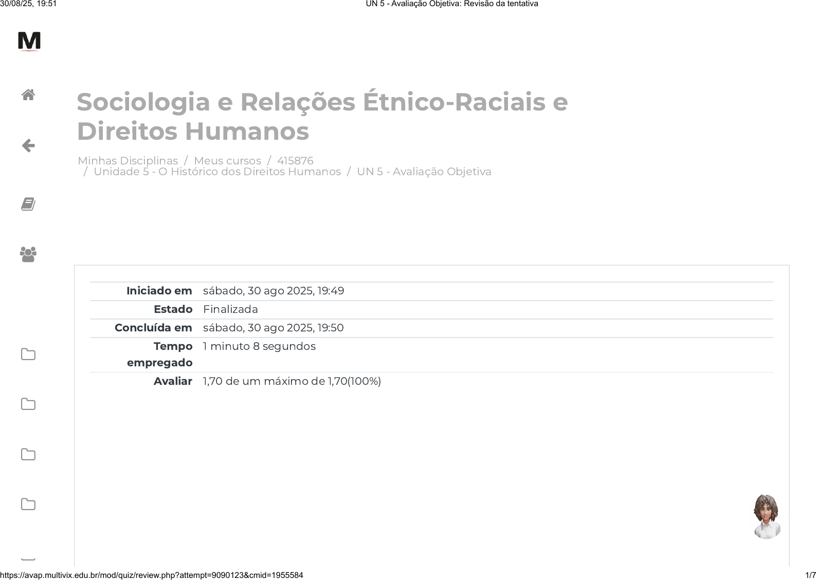 Minhas Disciplinas / Meus cursos / 415876 / Unidade 5 - O Histórico dos Direitos Humanos / UN 5 - Avaliação Objetiva Sociologia e Relações Étnico-Raciais e Direitos Humanos Iniciado em sábado, 30 ago 2025, 19:49 Estado Finalizada Concluída em sábado, 30 ago 2025, 19:50 Tempo empregado 1 minuto 8 segundos Avaliar 1,70 de um máximo de 1,70(100%) 30/08/25, 19:51 UN 5 - Avaliação Objetiva: Revisão da tentativa https://avap.multivix.edu.br/mod/quiz/review.php?attempt=9090123&cmid=1955584 1/7 https://avap.multivix.edu.br/my/ https://avap.multivix.edu.br/course/view.php?id=36019 https://avap.multivix.edu.br/course/view.php?id=36019§ion=6 https://avap.multivix.edu.br/mod/quiz/view.php?id=1955584 https://avap.multivix.edu.br/my/ https://avap.multivix.edu.br/course/view.php?id=36019 https://avap.multivix.edu.br/user/index.php?id=36019 https://avap.multivix.edu.br/course/view.php?id=36019§ion=1 https://avap.multivix.edu.br/course/view.php?id=36019§ion=2 https://avap.multivix.edu.br/course/view.php?id=36019§ion=3 https://avap.multivix.edu.br/course/view.php?id=36019§ion=4 https://avap.multivix.edu.br/course/view.php?id=36019§ion=5 https://avap.multivix.edu.br/ https://avap.multivix.edu.br/ https://avap.multivix.edu.br/ https://avap.multivix.edu.br/ https://avap.multivix.edu.br/ https://avap.multivix.edu.br/ https://avap.multivix.edu.br/ https://avap.multivix.edu.br/ Questão 1 Correto Atingiu 0,34 de 0,34 A Declaração Universal dos Direitos Humanos (DUDH) é um documento marco na história dos direitos humanos. Elaborada por representantes de diferentes origens jurídicas e culturais de todas as regiões do mundo, a Declaração foi proclamada pela Assembleia Geral das Nações Unidas em Paris, em 10 de dezembro de 1948, por meio da Resolução 217 A (III) da Assembleia Geral como uma norma comum a ser alcançada por todos os povos e nações. Ela estabelece, pela primeira vez, a proteção universal dos direitos humanos. Fonte: https://nacoesunidas.org/direitoshumanos/declaracao/ Considerando a DUDH, avalie as afirmações a seguir. I. Foi elaborada no contexto de pós guerra. II. Estabelece direitos universais a todos os seres humanos III. Reconhece que todos os seres humanos devam ter acesso a trabalho, educação e saúde. IV. Compreende que homens e mulheres tem direitos iguais V. Obriga todas as nações do mundo a seguir os direitos universais. É correto apenas o que se afirma em Escolha uma opção: a. I, II, IV e V. b. II e V. c. I e IV. 30/08/25, 19:51 UN 5 - Avaliação Objetiva: Revisão da tentativa https://avap.multivix.edu.br/mod/quiz/review.php?attempt=9090123&cmid=1955584 2/7 https://nacoesunidas.org/direitoshumanos/declaracao/ https://avap.multivix.edu.br/ https://avap.multivix.edu.br/ https://avap.multivix.edu.br/ https://avap.multivix.edu.br/ https://avap.multivix.edu.br/ https://avap.multivix.edu.br/ https://avap.multivix.edu.br/ https://avap.multivix.edu.br/ Questão 2 Correto Atingiu 0,34 de 0,34 d. III, IV e V. e. I, II, III e IV. Podemos dizer que a consolidação dos Direitos Humanos no Brasil se dá com a promulgação da Constituição de 1988, que garante direitos invioláveis aos cidadãos da nação brasileira. Nossa Carta Magna foi construída a partir de uma intensa mobilização social e política, o que possibilitou que estivesse de acordo com os critérios internacionais no que tange á garantia dos Diretos Humanos. Por qual motivo, A Constituição brasileira recebe o título de constituição cidadã? Escolha uma opção: a. Por possibilitar que homens e mulheres tenham os mesmos direitos. b. Por ser fruto de uma elaboração dentro do congresso nacional. c. Pelo seu caráter social, atendendo aos anseios da população. d. Por ter sido construída após uma ditadura militar. e. Pela sua organização baseada na aristocracia. 30/08/25, 19:51 UN 5 - Avaliação Objetiva: Revisão da tentativa https://avap.multivix.edu.br/mod/quiz/review.php?attempt=9090123&cmid=1955584 3/7 https://avap.multivix.edu.br/ https://avap.multivix.edu.br/ https://avap.multivix.edu.br/ https://avap.multivix.edu.br/ https://avap.multivix.edu.br/ https://avap.multivix.edu.br/ https://avap.multivix.edu.br/ https://avap.multivix.edu.br/ Questão 3 Correto Atingiu 0,34 de 0,34 O Plano Nacional de Educação em Direitos Humanos (PNEDH) é fruto do compromisso do Estado com a concretização dos direitos humanos e de uma construção histórica da sociedade civil organizada. Fonte: http://portal.mec.gov.br/index.php?option=com_docman&view=download&alias=2191-plano- nacional-pdf&Itemid=30192 ; Considerando o PNDE, avalie as afirmações a seguir. I. Busca o desenvolvimento dos direitos humanos. II. Tem o intuito de promover um processo educativo baseado nos direitos humanos. III. Não trata sobre a questão da segurança. IV. O direito a memória é uma das suas pautas. V. Foi homologado junto com a Constituição Federal. É correto apenas o que se afirma em Escolha uma opção: a. II e III. b. I, II e IV. c. I e IV. 30/08/25, 19:51 UN 5 - Avaliação Objetiva: Revisão da tentativa https://avap.multivix.edu.br/mod/quiz/review.php?attempt=9090123&cmid=1955584 4/7 http://portal.mec.gov.br/index.php?option=com_docman&view=download&alias=2191-plano-nacional-pdf&Itemid=30192%C2%A0 http://portal.mec.gov.br/index.php?option=com_docman&view=download&alias=2191-plano-nacional-pdf&Itemid=30192%C2%A0 https://avap.multivix.edu.br/ https://avap.multivix.edu.br/ https://avap.multivix.edu.br/ https://avap.multivix.edu.br/ https://avap.multivix.edu.br/ https://avap.multivix.edu.br/ https://avap.multivix.edu.br/ https://avap.multivix.edu.br/ Questão 4 Correto Atingiu 0,34 de 0,34 d. I, II, III e IV. e. III, IV e V. Um dos objetivos dos direitos humanos é promover uma sociedade onde homens e mulheres possam ter os mesmos direitos e viverem em uma sociedade justa, livre e igualitária. Diante desse cenário foi estabelecido no Brasil a Lei Maria da Penha com o intuito de proteger a mulher
