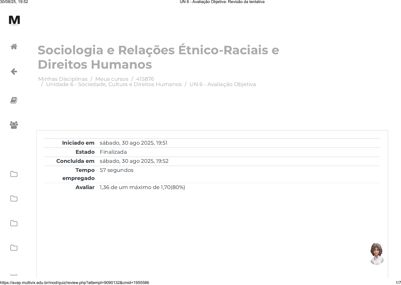 Minhas Disciplinas / Meus cursos / 415876 / Unidade 6 - Sociedade, Cultura e Direitos Humanos / UN 6 - Avaliação Objetiva Sociologia e Relações Étnico-Raciais e Direitos Humanos Iniciado em sábado, 30 ago 2025, 19:51 Estado Finalizada Concluída em sábado, 30 ago 2025, 19:52 Tempo empregado 57 segundos Avaliar 1,36 de um máximo de 1,70(80%) 30/08/25, 19:52 UN 6 - Avaliação Objetiva: Revisão da tentativa https://avap.multivix.edu.br/mod/quiz/review.php?attempt=9090132&cmid=1955586 1/7 https://avap.multivix.edu.br/my/ https://avap.multivix.edu.br/course/view.php?id=36019 https://avap.multivix.edu.br/course/view.php?id=36019§ion=7 https://avap.multivix.edu.br/mod/quiz/view.php?id=1955586 https://avap.multivix.edu.br/my/ https://avap.multivix.edu.br/course/view.php?id=36019 https://avap.multivix.edu.br/user/index.php?id=36019 https://avap.multivix.edu.br/course/view.php?id=36019§ion=1 https://avap.multivix.edu.br/course/view.php?id=36019§ion=2 https://avap.multivix.edu.br/course/view.php?id=36019§ion=3 https://avap.multivix.edu.br/course/view.php?id=36019§ion=4 https://avap.multivix.edu.br/course/view.php?id=36019§ion=5 https://avap.multivix.edu.br/ https://avap.multivix.edu.br/ https://avap.multivix.edu.br/ https://avap.multivix.edu.br/ https://avap.multivix.edu.br/ https://avap.multivix.edu.br/ https://avap.multivix.edu.br/ https://avap.multivix.edu.br/ Questão 1 Correto Atingiu 0,34 de 0,34 O Plano Nacional em Direitos Humanos traz um amplo debate sobre o desenvolvimento das sociedades, destacando o papel do Estado na promoção e garantia das oportunidades necessárias ao desenvolvimento das nações. Diante dessa concepção o PNDH compreende que: “O desenvolvimento pode ser garantido se as pessoas forem protagonistas do processo, pressupondo a garantia de acesso de todos os indivíduos aos direitos econômicos, sociais, culturais e ambientais, e incorporando a preocupação com a preservação e a sustentabilidade como eixos estruturantes de proposta renovada de progresso. Esses direitos têm como foco a distribuição da riqueza, dos bens e serviços. (BRASIL. Plano Nacional de Direitos Humanos – PNDH. Brasília: SDH/PR, 2010, p. 35). Diante desses apontamentos, é correto afirmar que o PNDH atua Escolha uma opção: a. na busca pela garantia da promoção dos Direitos Humanos. b. fiscalizando a distribuição das riquezas, multando ações de exploração. c. na defesa de pessoas que cometeram algum tipo de crime. d. promovendo a distribuição de renda através de programas sociais. e. no atendimento à pessoas especiais. 30/08/25, 19:52 UN 6 - Avaliação Objetiva: Revisão da tentativa https://avap.multivix.edu.br/mod/quiz/review.php?attempt=9090132&cmid=1955586 2/7 https://avap.multivix.edu.br/ https://avap.multivix.edu.br/ https://avap.multivix.edu.br/ https://avap.multivix.edu.br/ https://avap.multivix.edu.br/ https://avap.multivix.edu.br/ https://avap.multivix.edu.br/ https://avap.multivix.edu.br/ Questão 2 Correto Atingiu 0,34 de 0,34 Considerando os órgãos de segurança pública, avalie as afirmações a seguir. I. Estão acima dos direitos humanos. II. Uma das ações é reprimir e prevenir o tráfico de drogas. III. Estão presentes no âmbito federal, estadual e municipal. IV. Estão submetidos apenas à Constituição. V. Tem como objetivos a manutenção da ordem e cumprimento da lei. É correto o que se afirma em Escolha uma opção: a. II e III, apenas. b. I e IV, apenas. c. III, IV e V apenas. d. II, III e V apenas. e. I, II e IV apenas. 30/08/25, 19:52 UN 6 - Avaliação Objetiva: Revisão da tentativa https://avap.multivix.edu.br/mod/quiz/review.php?attempt=9090132&cmid=1955586 3/7 https://avap.multivix.edu.br/ https://avap.multivix.edu.br/ https://avap.multivix.edu.br/ https://avap.multivix.edu.br/ https://avap.multivix.edu.br/ https://avap.multivix.edu.br/ https://avap.multivix.edu.br/ https://avap.multivix.edu.br/ Questão 3 Correto Atingiu 0,34 de 0,34 O conceito de cultura passou, desde seu desenvolvimento, por inúmeras adaptações, críticas e revisões. Por se tratar de um conceito que se refere a existência humana, é importante considera-lo para uma análise das sociedades. A proteção da cultura como um direito inerente aos seres humanos foi efetivada pós Segunda Guerra Mundial. As atrocidades cometidas ao longo dessa guerra deram destaques aos chamados Direitos Humanos. A internacionalização da garantia e proteção desses direitos chamaram a atenção para a diversidade cultural presente no mundo e a necessidade de garantir o direito de manifestação dessas culturas. A partir desses apontamentos pode-se compreender a cultura como Escolha uma opção: a. todos os Direitos Humanos. b. atividades de lazer da sociedade. c. atividades que atraem um grande número de pessoas. d. toda a diversidade presente em uma dada sociedade. e. resultado das normas e regras de uma nação. 30/08/25, 19:52 UN 6 - Avaliação Objetiva: Revisão da tentativa https://avap.multivix.edu.br/mod/quiz/review.php?attempt=9090132&cmid=1955586 4/7 https://avap.multivix.edu.br/ https://avap.multivix.edu.br/ https://avap.multivix.edu.br/ https://avap.multivix.edu.br/ https://avap.multivix.edu.br/ https://avap.multivix.edu.br/ https://avap.multivix.edu.br/ https://avap.multivix.edu.br/ Questão 4 Correto Atingiu 0,34 de 0,34 Sobre Direitos Humanos e Segurança Pública, avalie as asserções a seguir e a relação proposta entre elas. I – Os Direitos Humanos devem ser garantidos apenas em algumas situações PORQUE II – Em casos cometimento de violência muito extrema o preso pode ser submetido a tortura para compartilhar informações importantes sobre o caso. A respeito dessas asserções assinale a opção correta. Escolha uma opção: a. A asserção I é uma proposição verdadeira, e a II é uma proposição falsa. b. As asserções I e II são proposições falsas. c. As asserções I e II são proposições verdadeiras, mas a II não é uma j