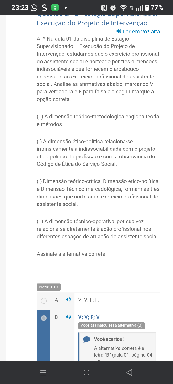 23:23 S Execução do Projeto de Intervenção Ler em voz alta A1* Na aula 01 da disciplina de Estágio Supervisionado - Execução do Projeto de Intervenção, estudamos que exercício profissional do assistente social é norteado por três dimensões, indissociáveis e que fornecem arcabouço necessário ao exercício profissional do assistente social. Analise as afirmativas abaixo, marcando V para verdadeira e F para falsa e a seguir marque a opção correta. A dimensão teórico-metodológica engloba teoria e métodos () A dimensão ético-política relaciona-se intrinsicamente à indissociabilidade com projeto ético político da profissão e com a observância do Código de Ética do Serviço Social. () Dimensão teórico-crítica, Dimensão ético-política e Dimensão formam as três dimensões que norteiam exercício profissional do assistente social. A dimensão técnico-operativa, por sua vez, relaciona-se diretamente à ação profissional nos diferentes espaços de atuação do assistente social. Assinale a alternativa correta Nota: 10.0 A V;V;F;V Você assinalou essa alternativa (B) Você acertou! A alternativa correta é a letra "B" (aula 01, página 04