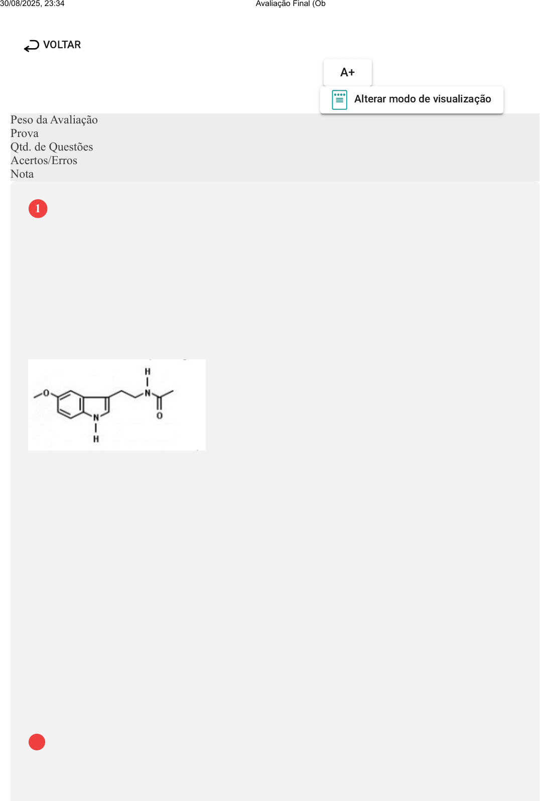 Prova Impressa GABARITO | Avaliação Final (Objetiva) - Individual (Cod.:1025568) Peso da Avaliação 4,00 Prova 97737052 Qtd. de Questões 10 Acertos/Erros 1/9 Nota 1,00 As moléculas orgânicas que contêm grupamentos químicos idênticos exibem propriedades químicas semelhantes e, portanto, são classificadas de acordo com os grupos funcionais presentes na estrutura de um composto orgânico específico. Considere a estrutura do composto orgânico a seguir: Fonte: adaptado de: MCMURRY, J. Química Orgânica. 8. ed. São Paulo: Cengage Learning, 2011. Sobre os grupos funcionais presentes no composto orgânico, analise as afirmativas a seguir: I. A molécula apresenta um anel aromático. II. A molécula apresenta um grupo funcional éter. III. A molécula apresenta um grupo funcional éster. IV. A molécula apresenta um grupo funcional amida. É correto o que se afirma em: A I, apenas. VOLTAR A+ Alterar modo de visualização 1 30/08/2025, 23:34 Avaliação Final (Objetiva) - Individual about:blank 1/10 B II e IV, apenas. C I, II, III e IV. D III e IV, apenas. E I, II e IV, apenas. A OGX Energia, uma subsidiária do grupo EBX, liderado pelo empresário Eike Batista, especializada na exploração de petróleo no Maranhão, descobriu uma vasta reserva de gás natural em Capinzal do Norte, uma cidade situada a 260 km de São Luís. O gás natural é uma mistura de hidrocarbonetos leves, incluindo principalmente etano, propano, isobutano, butano, pentano, isopentano, entre outros. De acordo com a OGX, as reservas contêm entre 10 a 15 trilhões de pés cúbicos de gás, o que equivale a 15 milhões de metros cúbicos por dia - aproximadamente metade do volume diário de gás natural que a Bolívia exporta para o Brasil. Fonte: adaptado de: OGX e MPX identificam nova acumulação de gás na Bacia do Parnaíba. GasNet, nov. 2010. Disponível em: https://www.gasnet.com.br/Conteudo/Detalhe/10358. Acesso em: 4 jun. 2024. Considerando a estrutura dos alcanos e sua reatividade, assinale a alternativa correta: A A alta polaridade entre as ligações químicas nos alcanos explica sua alta reatividade química e a liberação de altas quantidades de energia nas reações de combustão. B Quanto menor a cadeia carbônica do alcano, mais energia é liberada pela reação de combustão. C A combustão dos alcanos é uma reação endotérmica, absorvendo energia do ambiente. D A reação de combustão de um alcano ocorre entre o alcano e o gás oxigênio, sendo exotérmica e gerando como produtos, essencialmente, gás carbônico e água. E Como os alcanos são moléculas com baixa reatividade, eles não sofrem reação de combustão Revisar Conteúdo do Livro 2 Revisar Conteúdo do Livro 30/08/2025, 23:34 Avaliação Final (Objetiva) - Individual about:blank 2/10 Os compostos orgânicos, que constituem a base da química orgânica, são caracterizados por ligações químicas covalentes. Essas ligações covalentes podem ser categorizadas como polares ou apolares, uma distinção que é determinada pela diferença de eletronegatividade entre os átomos envolvidos na ligação. A compreensão da natureza dessas ligações é fundamental para a interpretação das propriedades físicas e químicas dos compostos orgânicos. Considere as estruturas a seguir: Dados: Eletronegatividades relativas: Li=1,0; C=2,5; Br=2,8 e F=4,0 Fonte: adaptado de: https://www.mdpi.com/1420-3049/22/9/1575. Acesso em: 3 jun. 2024. Considerando o contexto apresentado, as estruturas das moléculas e atentando-se à ligação química em destaque, analise as afirmativas a seguir: I. A ligação C-Br é a menos polar dentre as ligações C-Li, C-F e C-Br. II. Na ligação C-F, a densidade parcial negativa está sobre o átomo de flúor. III. A ligação C-F é considerada polar, pois o flúor é mais eletronegativo que o carbono. IV. A ligação C-Li é considerada apolar, pois o carbono nunca é capaz de atrair para si os elétrons de uma ligação química. É correto o que se afirma em: 3 30/08/2025, 23:34 Avaliação Final (Objetiva) - Individual about:blank 3/10 A I e IV, apenas. B II e III, apenas. C III e IV, apenas. D I, II e III, apenas. E II, III e IV, apenas. O conceito de “aromático” foi inicialmente introduzido por August Wilhelm von Hoffmann para designar uma categoria de moléculas que exibiam odores distintos, como o benzaldeído, que possui um aroma reminiscente de amêndoas; e o benzeno, que tem um odor associado ao carvão destilado. Contudo, com a evolução do conhecimento científico, descobriu-se que esses compostos apresentavam estruturas e propriedades químicas que os distinguiam de outros compostos orgânicos. Fonte: adaptado de: https://www.scielo.br/j/qn/a/Q5msxtL66xLr5jPN8Qjs53S. Acesso em: 4 jun. 2024. Sobre os compostos aromáticos, analise as afirmativas a seguir: I. Os compostos aromáticos são caracterizados por apresentarem ressonância em suas estruturas. II. A hibridização dos carbonos no anel benzênico é sp3, contribuindo para a estabilidade do anel. III. Os compostos aromáticos não são necessariamente voláteis, apesar de alguns apresentarem odores característicos. IV. O anel benzênico é um exemplo clássico de estrutura aromática, sendo altamente estável devido à deslocalização dos elétrons pi. É correto o que se afirma em: A I, II e III, apenas. Revisar Conteúdo do Livro 4 30/08/2025, 23:34 Avaliação Final (Objetiva) - Individual about:blank 4/10 B I e IV, apenas. C II e III, apenas. D III e IV, apenas. E I, III e IV, apenas. Uma reação química, independentemente de sua natureza, é um processo que envolve a transformação de uma ou mais substâncias, conhecidas como reagentes, em uma ou mais substâncias diferentes, denominadas produtos. Esse processo ocorre quando duas substâncias distintas colidem com energia suficiente para romper ligações químicas específicas entre seus átomos, permitindo que esses átomos se reorganizem para formar novas ligações e