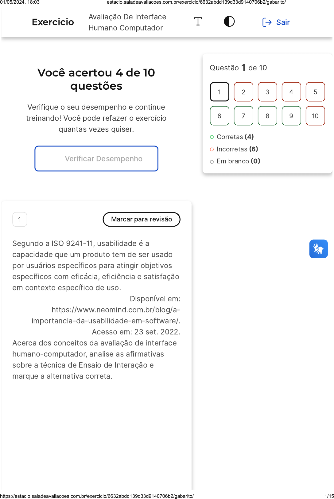 Você acertou 4 de 10 questões Verifique o seu desempenho e continue treinando! Você pode refazer o exercício quantas vezes quiser. Verificar Desempenho 1 Marcar para revisão Segundo a ISO 9241�11, usabilidade é a capacidade que um produto tem de ser usado por usuários específicos para atingir objetivos específicos com eficácia, eficiência e satisfação em contexto específico de uso. Disponível em: https://www.neomind.com.br/blog/a- importancia-da-usabilidade-em-software/. Acesso em: 23 set. 2022. Acerca dos conceitos da avaliação de interface humano-computador, analise as afirmativas sobre a técnica de Ensaio de Interação e marque a alternativa correta. Questão 1 de 10 Corretas �4� Incorretas �6� Em branco �0� 1 2 3 4 5 6 7 8 9 10 Exercicio Avaliação De Interface Humano Computador Sair 01/05/2024, 18:03 estacio.saladeavaliacoes.com.br/exercicio/6632abdd139d33d9140706b2/gabarito/ https://estacio.saladeavaliacoes.com.br/exercicio/6632abdd139d33d9140706b2/gabarito/ 1/15 A B C D E Uma desvantagem de realizar ensaios de interação com uso de software e com a presença de usuários é o baixo custo de investimento necessário. Quanto maior for o número de usuários envolvidos no ensaio de interação, maior o número de problemas de usabilidade que serão encontrados pelo avaliador. Para realizar um ensaio de interação, deve-se somente: planejar o ensaio e coletar os resultados. Uma vantagem de realizar ensaios de interação em ambiente de laboratório é a possibilidade de ocorrerem interferências durante sua execução. Durante uma sessão de ensaios de interação, o comportamento dos usuários pode ser observado e comparado com os outros usuários que realizam uma mesma tarefa. Resposta incorreta Opa! A alternativa correta é a letra E. Confira o gabarito comentado! Gabarito Comentado Na técnica de Ensaio de Interação, os participantes são representantes do público-alvo do sistema, ou seja, seus possíveis usuários. O sistema pode ter tipos diferentes de usuários, com tarefas e formas de pensar diversas. Idealmente, 01/05/2024, 18:03 estacio.saladeavaliacoes.com.br/exercicio/6632abdd139d33d9140706b2/gabarito/ https://estacio.saladeavaliacoes.com.br/exercicio/6632abdd139d33d9140706b2/gabarito/ 2/15 todos devem ser contemplados na avaliação, sendo possível inclusive comparar a forma de interação destes diferentes usuários com o sistema. A alternativa E está correta, pois durante uma sessão de ensaios de interação, o comportamento dos usuários pode ser observado e comparado com os outros usuários que realizam uma mesma tarefa. Isso permite uma visão mais ampla e diversificada sobre a usabilidade do sistema, contribuindo para a identificação e correção de possíveis problemas. 2 Marcar para revisão �FADESP/2019 � Adaptada) Usabilidade é um termo muito utilizado para definir o grau de facilidade que as pessoas têm ao utilizar, por exemplo, ferramentas, sites ou até mesmo produtos. Seu objetivo é entender se o usuário consegue localizar as funções e compreender como tudo funciona rapidamente e, caso seja identificado algum problema, os erros são estudados e corrigidos. Disponível em: https://neilpatel.com/br/blog/usabilidade-o- que-e/. Acesso em: 23 set. 2022. Acerca dos conceitos sobre a avaliação de Interface Humano-Computador, qual técnica de usabilidade consiste em solicitar a usuários a realização de tarefas de teste previamente estabelecidas para a avaliação da interface a ser estudada? 01/05/2024, 18:03 estacio.saladeavaliacoes.com.br/exercicio/6632abdd139d33d9140706b2/gabarito/ https://estacio.saladeavaliacoes.com.br/exercicio/6632abdd139d33d9140706b2/gabarito/ 3/15 A B C D E Avaliação heurística. Ensaios de interação. Uso de guidelines e checklists. Uso de questionários e entrevistas. Etnografia. Resposta incorreta Opa! A alternativa correta é a letra B. Confira o gabarito comentado! Gabarito Comentado A alternativa correta é "Ensaios de interação". Essa técnica de usabilidade envolve a solicitação aos usuários para que realizem tarefas de teste previamente estabelecidas, com o objetivo de avaliar a interface em estudo. Os mecanismos de avaliação mais frequentemente empregados em ensaios de interação são observações, questionários, entrevistas, verbalização de procedimentos, interação construtiva, ensaio retrospectivo, captura automática diretamente da aplicação, discussões em grupo focal e retorno imediato de opiniões do usuário. Dessa forma, é possível identificar e corrigir possíveis problemas na interface, melhorando a usabilidade para o usuário final. 01/05/2024, 18:03 estacio.saladeavaliacoes.com.br/exercicio/6632abdd139d33d9140706b2/gabarito/ https://estacio.saladeavaliacoes.com.br/exercicio/6632abdd139d33d9140706b2/gabarito/ 4/15 A B C D E 3 Marcar para revisão �SELECON/2022 � Adaptada) No que se refere à Interface Homem-Máquina, um termo é definido como a qualidade que um produto apresenta de poder ser utilizado por usuários específicos para atingir determinadas metas com eficiência, eficácia e satisfação num contexto de uso específico. Em resumo, os sistemas devem ser flexíveis e fáceis de usar e aprender. Além disso, devem despertar uma boa atitude nas pessoas. Esse termo é denominado: Design. Usabilidade. Interatividade. Acessibilidade. Facilidade. Resposta incorreta Opa! A alternativa correta é a letra B. Confira o gabarito comentado! Gabarito Comentado O termo descrito no enunciado é a "Usabilidade". Ele se refere à medida de quão fácil é para as pessoas utilizarem uma interface de usuário para alcançar seus 01/05/2024, 18:03 estacio.saladeavaliacoes.com.br/exercicio/6632abdd139d33d9140706b2/gabarito/ https://estacio.saladeavaliacoes.com.br/exercicio/6632abdd139d33d9140706b2/gabarito/ 5/15 A B C objetivos de maneira eficiente, eficaz e satisfatória. Isso engloba a facilidade de aprendizado, a eficiência de uso, a memoriza