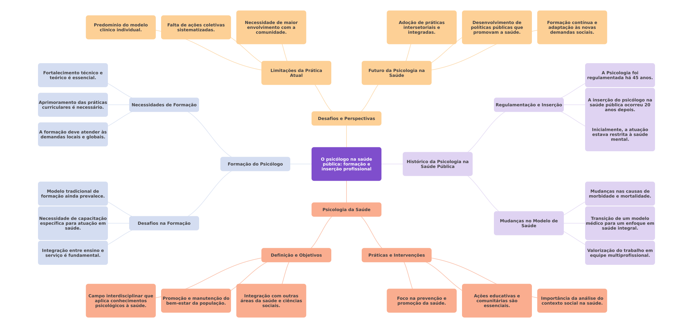 Necessidade de maior Adoção de práticas Desenvolvimento de Predomínio do modelo Falta de ações coletivas Formação contínua e envolvimento com a intersetoriais e clínico individual. sistematizadas. políticas públicas que adaptação às novas comunidade. integradas. promovam a saúde. demandas sociais. Fortalecimento técnico e Limitações da Prática Futuro da Psicologia na A Psicologia foi Atual Saúde teórico é essencial. regulamentada há 45 anos. Aprimoramento das práticas A inserção do psicólogo na curriculares é necessário. Necessidades de Formação Regulamentação e Inserção saúde pública ocorreu 20 anos depois. Desafios e Perspectivas A formação deve atender às Inicialmente, a atuação estava restrita à saúde demandas locais e globais. mental. psicólogo na saúde Formação do Psicólogo pública: formação e Histórico da Psicologia na Saúde Pública inserção profissional Modelo tradicional de Mudanças nas causas de formação ainda prevalece. morbidade e mortalidade. Psicologia da Saúde Necessidade de capacitação Mudanças no Modelo de Transição de um modelo específica para atuação em Desafios na Formação Saúde médico para um enfoque em saúde. saúde integral. Integração entre ensino e Valorização do trabalho em serviço é fundamental. Definição e Objetivos Práticas e Intervenções equipe multiprofissional. Campo interdisciplinar que aplica conhecimentos Promoção e manutenção do Integração com outras áreas da saúde e ciências Foco na prevenção e Ações educativas e comunitárias são Importância da análise do psicológicos à saúde. bem-estar da população. promoção da saúde. contexto social na saúde. sociais. essenciais.