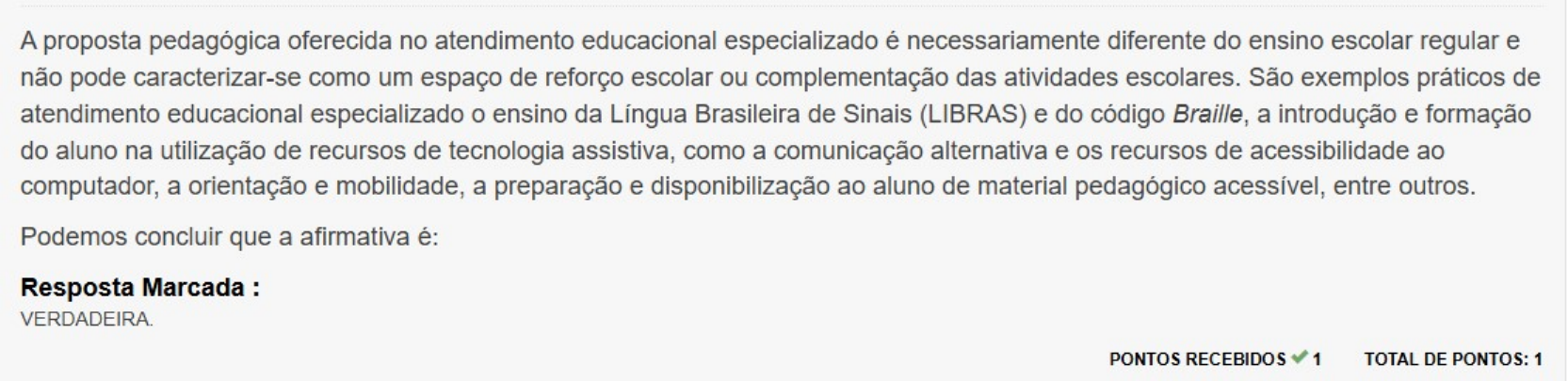 A proposta pedagógica oferecida no atendimento educacional especializado é necessariamente diferente do ensino escolar regular e não pode caracterizar-se como um espaço de reforço escolar ou complementação das atividades escolares. São exemplos práticos de atendimento educacional especializado ensino da Língua Brasileira de Sinais (LIBRAS) e do código Braille, a introdução e formação do aluno na utilização de recursos de tecnologia assistiva, como a comunicação alternativa e os recursos de acessibilidade ao computador, a orientação e mobilidade, a preparação e disponibilização ao aluno de material pedagógico acessível, entre outros. Podemos concluir que a afirmativa é: Resposta Marcada : VERDADEIRA. PONTOS RECEBIDOS 1 TOTAL DE PONTOS: 1