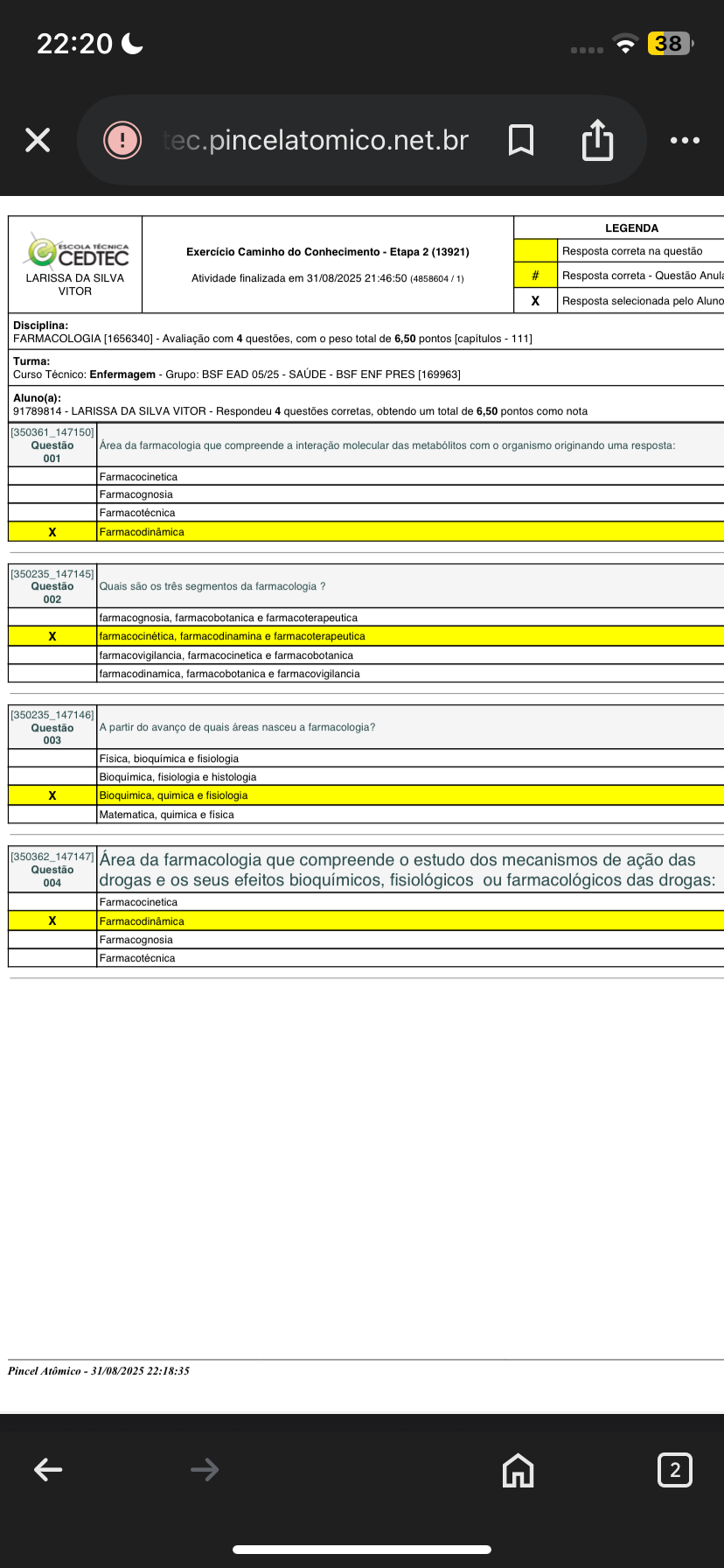 22:20 38 X ! LEGENDA ESCOLA CEDTEC Exercício Caminho do Conhecimento Etapa 2 (13921) Resposta correta na questão LARISSA DA SILVA Atividade finalizada em 31/08/2025 21:46:50 (4858604 / 1) # Resposta correta Questão Anula VITOR X Resposta selecionada pelo Aluno Disciplina: FARMACOLOGIA [1656340] Avaliação com 4 questões, com peso total de 6,50 pontos 111] Turma: Curso Técnico: Enfermagem Grupo: BSF EAD 05/25 SAÚDE BSF ENF PRES [169963] Aluno(a): 91789814 - LARISSA DA SILVA VITOR - Respondeu 4 questões corretas, obtendo um total de 6,50 pontos como nota [350361 Questão Área da farmacologia que compreende a interação molecular das metabólitos com 0 organismo originando uma resposta: 001 Farmacocinetica Farmacognosia Farmacotécnica X Farmacodinâmica [350235_147145] Questão Quais são os três segmentos da farmacologia ? 002 farmacognosia, farmacobotanica e farmacoterapeutica X farmacocinética, farmacodinamina e farmacoterapeutica farmacovigilancia, farmacocinetica e farmacobotanica farmacodinamica, farmacobotanica e farmacovigilancia [350235_147146] Questão A partir do avanço de quais áreas nasceu a farmacologia? 003 e fisiologia Bioquimica, fisiologia e histologia X Bioquimica, quimica e fisiologia Matematica, quimica e fisica [350362_147147] Área da farmacologia que compreende estudo dos mecanismos de ação das Questão 004 drogas e os seus efeitos bioquímicos, fisiológicos ou farmacológicos das drogas: Farmacocinetica X Farmacognosia Farmacotécnica Pincel Atômico 31/08/2025 22:18:35 2
