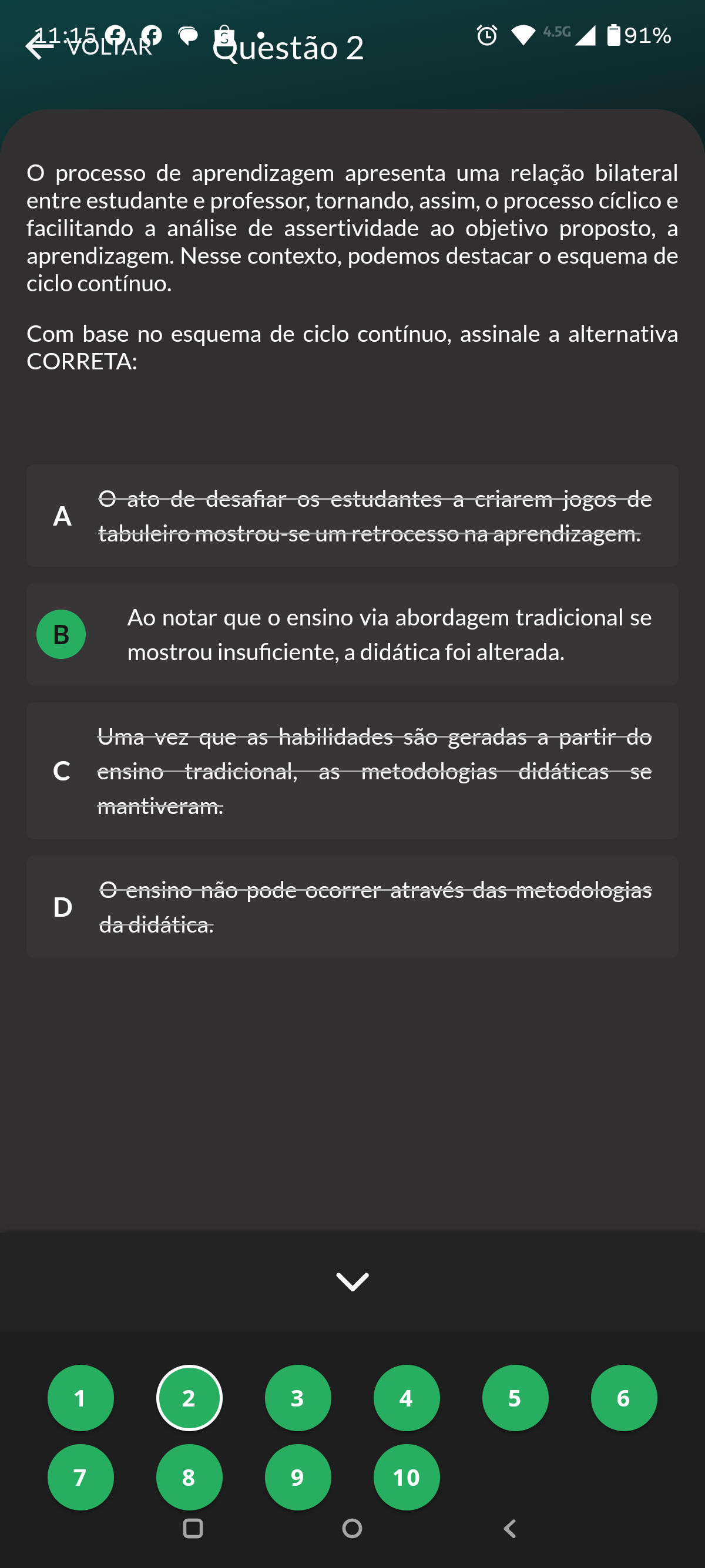 Questão 2 4.5G 91% processo de aprendizagem apresenta uma relação bilateral entre estudante e professor, tornando, assim, processo cíclico e facilitando a análise de assertividade ao objetivo proposto, a aprendizagem. Nesse contexto, podemos destacar esquema de ciclo contínuo. Com base no esquema de ciclo contínuo, assinale a alternativa CORRETA: ato de desafiar os estudantes a criarem jogos de tabuleiro mostrou se um retrocesso na aprendizagem. notar que ensino via abordagem tradicional se mostrou insuficiente, a didática foi alterada. Uma vez que as habilidades são geradas a partir do c ensino tradicional, as metodologias didáticas se mantiveram. ensino não pode ocorrer através das metodologias D da didática. 1 2 3 4 5 6 7 8 9 10