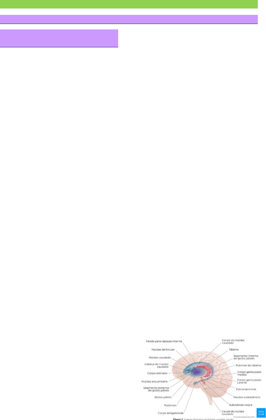 NATHALIA K MELO APG 13 - PARKINSON 1. Relembrar a morfofisiologia dos núcleos da base. Os núcleos da base (NB) são massas de substância cinzenta situadas na base do telencéfalo. Tais estruturas são: claustrum, amígdala, núcleo caudado, putâmen e globo pálido. Também podem ser incluídas mais duas estruturas: o núcleo basal de Meynert, o núcleo accumbens, a substância negra e o núcleo subtalâmico. São estruturas predominantemente motoras, mas também estão envolvidas com várias funções não motoras, relacionadas a processos cognitivos, emocionais e motivacionais. Entretanto, por muito tempo acreditou-se que os núcleos da base teriam somente funções motoras e pertenceriam ao chamado sistema extrapiramidal, o qual que seria a oposição ao sistema piramidal. Esse termo, sistema extrapiramidal, é classicamente utilizado para caracterizar um grupo de estruturas anatômicas, principalmente os núcleos da base, que estariam relacionadas com o controle motor e, quando disfuncionais, provocariam distúrbios dos movimentos. Então, a motricidade seria executada por dois sistemas descendentes eferentes: o sistema piramidal, cujas fibras do trato corticoespinhal (responsável pelo movimento voluntário) que passam pelas pirâmides bulbares, e o sistema extrapiramidal, cujas fibras não passam por essas estruturas (fazem parte da modulação e coordenação do movimento). Entretanto, sabe-se que o planejamento motor, controle motor e a execução do movimento englobam uma série de estruturas, que funcionam de maneira paralela, mas, também, de forma interligada, incluindo o córtex pré-motor, a área motora suplementar, o córtex motor, os gânglios da base, o cerebelo, o tronco encefálico e a medula espinal. Portanto, apesar de ainda ser usual, do ponto de vista funcional, a terminologia de sistema extrapiramidal é ultrapassada. Os núcleos da base são um grupo de núcleos subcorticais localizado, em sua maioria, no nível do telencéfalo. Os componentes dos núcleos da base são as seguintes estruturas: 1. Do telencéfalo: núcleo caudado, putamen, globo pálido e núcleo accumbens; 2. Do mesencéfalo: substância negra (partes compacta e reticular) 3. Do diencéfalo: núcleo subtalâmico. Como estruturas correlatas dos NB, temos ainda: a área tegmentar ventral, núcleo pedúnculo-pontino, e os núcleos da rafe dorsal e as habênulas. Os núcleos da base modulam o os movimentos, participando nos processos de planejamento e controle dos movimentos, e atuam em processos cognitivos, emocionais e motivacionais. Algumas dessas estruturas compõe o núcleo estriado e o núcleo lenticular. O núcleo estriado compreende o núcleo caudado, o putâmen e o núcleo accumbens, que são núcleos com estrutura histológica e anatômica muito semelhantes. Já o núcleo lentiforme compreende o putamen e o globo pálido, que são núcleos funcionalmente semelhantes, como veremos a mais à frente. Núcleo caudado O núcleo caudado é uma estrutura de substância cinzenta do telencéfalo localizada ao lado da parede lateral dos ventrículos laterais. É a estrutura mais alongada ântero-posteriormente, que se inicia na região profunda do lobo frontal e vai até a região posterior do lobo temporal. É uma grande estrutura com muitas funções. Compõe-se de cabeça, corpo e cauda. A cabeça do núcleo caudado está fundida com a parte anterior do putâmen (por isso, em conjunto, são chamados de núcleo estriado, com funções relacionadas à motricidade). Putâmen Um pouco mais abaixo e posterior do núcleo caudado está o putâmen. É o maior componente dos núcleos da base e é o núcleo mais lateral. O putâmen relaciona-se lateralmente com a cápsula externa e medialmente com a lâmina medular lateral do globo pálido, que contém axônios que separam o putâmen do segmento externo do globo pálido. A principal função do putâmen é a de regular os movimentos amplos (grosseiros) e influenciam diversos tipos de aprendizagem, especialmente ao condicionamento. Juntamente com o globo pálido, o putâmen forma o núcleo lentiforme (em azul na figura 3), com tamanho e formato semelhante a uma castanha-do-pará e que se relaciona medialmente com a cápsula interna. O núcleo estriado compreende o núcleo caudado e o putâmen. O núcleo estriado desempenha um papel significativo em várias funções cerebrais, incluindo controle e aprendizado motor, linguagem, recompensa, funcionamento cognitivo e dependência pelas vias neurais funcionais cortico-estriato-talamocortical. O núcleo estriado é formado pelos neurônios espinhosos (neurônios com dendritos coberto com espinhos) e não espinhosos. A maior parte dos neurônios do putâmen é do tipo espinhoso, que são gabaérgicos, contendo o neurotransmissor ácido gama-aminobutírico (GABA). Globo pálido Um dos constituintes do núcleo lentiforme, o globo pálido é a estrutura de menor tamanho e mais medial desse núcleo. O globo pálido está adjacente ao putâmen. É dividido em dois segmentos pela lâmina medular medial: segmentos medial e lateral. Apresenta mais uma divisão no segmento medial, sendo dividido pela lâmina medular acessória em duas porções: uma mais medial (globo pálido interno – GPi) e outra mais lateral (globo pálido externo – GPe). Existem muitas fibras ligando o núcleo caudado e o putâmen ao globo pálido. Essas fibras ao convergir para o globo pálido lhe dão cor mais pálida em preparações não coradas por conta das fibras mielínicas que o atravessam. O globo pálido tem função essencialmente motora. Substância negra A substância negra é uma estrutura que possui coloração escura devido a existência de melanina em seus neurônios. Está localizada no mesencéfalo, entre o tegmento e a base do e pedúnculo, que compõe o pedúnculo cerebral. Apesar de estar localizada no tronco encefálico, a substância negra tem um contato direto e constante com os núcleos da base. É a maior estrutura n