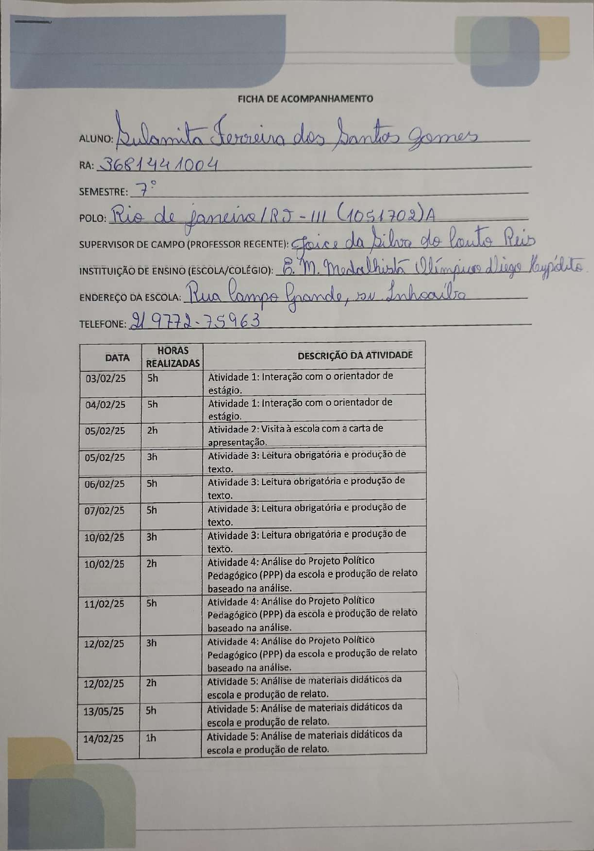 FICHA DE ACOMPANHAMENTO ALUNO: Sulamita dos Santos RA: 3681441004 SEMESTRE: 7° POLO: Rio de 111 (1051702)A SUPERVISOR DE CAMPO (PROFESSOR REGENTE): da Silva do INSTITUIÇÃO DE ENSINO (ESCOLA/COLÉGIO): medalhista ENDEREÇO DA ESCOLA: Rua TELEFONE: HORAS DATA DESCRIÇÃO DA ATIVIDADE REALIZADAS 03/02/25 5h Atividade 1: Interação com o orientador de estágio. 04/02/25 5h Atividade 1: Interação com o orientador de estágio. 05/02/25 2h Atividade 2: Visita à escola com a carta de apresentação. 05/02/25 3h Atividade 3: Leitura obrigatória e produção de texto. 06/02/25 5h Atividade 3: Leitura obrigatória e produção de texto. 07/02/25 5h Atividade 3: Leitura obrigatória e produção de texto. 10/02/25 3h Atividade 3: Leitura obrigatória e produção de texto. 10/02/25 2h Atividade 4: Análise do Projeto Político Pedagógico (PPP) da escola e produção de relato baseado na análise. 11/02/25 5h Atividade 4: Análise do Projeto Político Pedagógico (PPP) da escola e produção de relato baseado na análise. 12/02/25 3h Atividade 4: Análise do Projeto Político Pedagógico (PPP) da escola e produção de relato baseado na análise. 12/02/25 2h Atividade 5: Análise de materiais didáticos da escola e produção de relato. 13/05/25 5h Atividade 5: Análise de materiais didáticos da escola e produção de relato. 14/02/25 1h Atividade 5: Análise de materiais didáticos da escola e produção de relato.14/02/25 4h Atividade 6: Entrevista com professor regente e produção de relato baseado na entrevista conforme respectivo estágio. 17/02/25 5h Atividade 7: Levantamento de materiais de apoio específicos para abordagem dos temas contemporâneos transversais da BNCC meio ambiente, economia, saúde, e civismo, multiculturalismo e ciência e tecnologia) e elaboração de relato. 18/02/25 Atividade 7: Levantamento de materiais de apoio específicos para abordagem dos temas contemporâneos transversais da BNCC meio ambiente, economia, saúde, cidadania e civismo, multiculturalismo e ciência e tecnologia) e elaboração de relato. HORAS DATA DESCRIÇÃO DA ATIVIDADE REALIZADAS 19/02/25 5h Atividade 8: Análise do processo de implementação da BNCC, conforme o campo de estágio e elaboração do relato. 20/02/25 5h Atividade 8: Análise do processo de implementação da BNCC, conforme o campo de estágio e elaboração do relato 21/02/25 5h Atividade 9: Análise dos instrumentos avaliativos utilizados pelo professor da disciplina conforme respectivo estágio, e elaboração de texto referente à análise. 24/02/25 5h Atividade 9: Análise dos instrumentos avaliativos utilizados pelo professor da disciplina conforme respectivo estágio, e elaboração de texto referente à análise. 25/02/25 1h Atividade 9: Análise dos instrumentos avaliativos utilizados pelo professor da disciplina conforme respectivo estágio, e elaboração de texto referente à análise. 25/02/25 4h Atividade 10: Análise da atuação da equipe pedagógica no acompanhamento do desenvolvimento da disciplina, conforme respectivo estágio, e elaboração do texto referente à análise. 26/02/25 5h Atividade 10: Análise da atuação da equipe pedagógica no acompanhamento do desenvolvimento da disciplina, conforme respectivo estágio, e elaboração do texto referente à análise.27/02/25 Atividade 10: Análise da atuação da equipe pedagógica no acompanhamento do desenvolvimento da disciplina, conforme respectivo estágio, e elaboração do texto referente à análise. 28/02/25 Atividade 11: Observação e participação em aulas, conforme respectivo estágio. 06/03/25 5h Atividade 11: Observação e participação em aulas, conforme respectivo estágio. 07/03/25 5h Atividade 11: Observação e participação em aulas, conforme respectivo estágio. 10/03/25 1h Atividade 11: Observação e participação em aulas, conforme o respectivo estágio. 10/03/25 4h Atividade 12: Elaboração do relato da observação. 11/03/25 5h Atividade 12: Elaboração do relato da observação. 12/03/25 5h Atividade 12: Elaboração do relato da observação. 13/03/25 2h Atividade 12: Elaboração do relato da observação. 13/03/25 3h Atividade 13: Elaboração de um plano para cada aula para uma mesma série/ turma, conforme o campo de Atividade estágio. 13: Elaboração de um plano para cada 14/03/25 5h aula para uma mesma série/ turma, conforme campo de estágio. 17/03/25 5h Atividade 13: Elaboração de um plano para cada aula para uma mesma série/ turma, conforme o campo de estágio. 18/03/25 3h Atividade 13: Elaboração de um plano para cada aula para uma mesma série/ turma, conforme campo de estágio. 2h Atividade 14: Apresentação dos planos de aula 18/03/25 para o professor regente e elaboração do relato. 19/03/25 5h Atividade 14: Apresentação dos planos de aula para o professor regente e elaboração do relato. 20/03/25 1h Atividade 14: Apresentação dos planos de aula para o professor regente e elaboração do relato 4h Atividade 15: Regência ( em uma das turmas em 20/03/25 que realizou as observações e participações), conforme respectivo estágio. 21/03/25 5h Atividade 16: Relato da regência. 24/03/24 5h Atividade 16: Relato da regência. 25/03/25 5h Atividade 16: Relato da regência. 26/03/25 1h Atividade 16: Relato da regência 26/03/25 2h Atividade 17: Produção do relatório de estágio. 26/03/25 2h Atividade 18: Validação do relatório de estágio.Assinatura do Supervisor de Campo Elen P. Assinatura Polo de Apoio Presencial Elen Cardoso das Chagas Agapito Coordenadora de Estágio RG 24.057.399-8