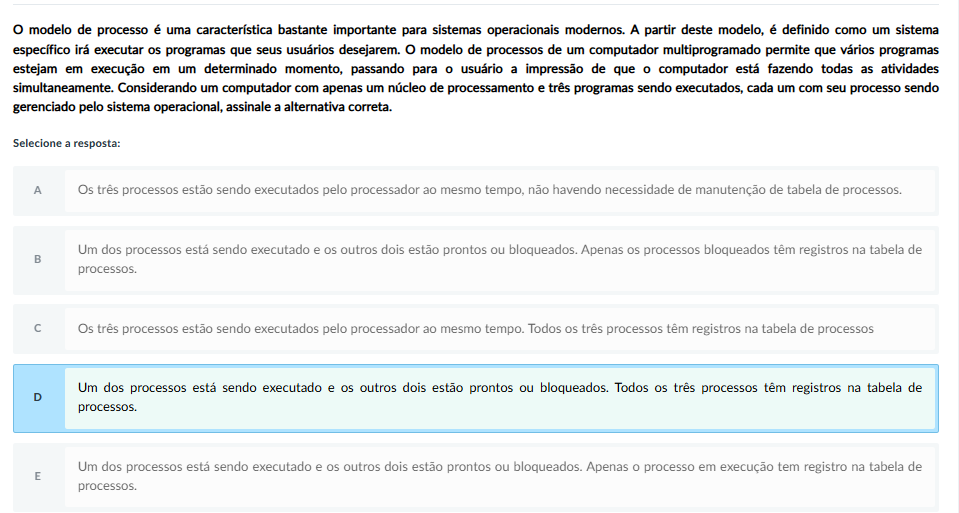 O modelo de processo é uma característica bastante importante para sistemas operacionais modernos. A partir deste modelo, é definido como um sistema específico irá executar os programas que seus usuários desejarem. O modelo de processos de um computador multiprogramado permite que vários programas estejam em execução em um determinado momento, passando para 0 usuário a impressão de que 0 computador está fazendo todas as atividades simultaneamente. Considerando um computador com apenas um núcleo de processamento e três programas sendo executados, cada um com seu processo sendo gerenciado pelo sistema operacional, assinale a alternativa correta. Selecione a resposta: A Os três processos estão sendo executados pelo processador ao mesmo tempo, não havendo necessidade de manutenção de tabela de processos. Um dos processos sendo executado e os outros dois estão prontos ou bloqueados. Apenas os processos bloqueados têm registros na tabela de B processos. C Os três processos estão sendo executados pelo processador ao mesmo tempo. Todos os três processos têm registros na tabela de processos Um dos processos está sendo executado e outros dois estão prontos ou bloqueados. Todos processos têm registros na tabela de D processos. Um dos processos está sendo executado e outros dois estão prontos ou bloqueados. Apenas 0 processo em execução tem registro na tabela de E processos.