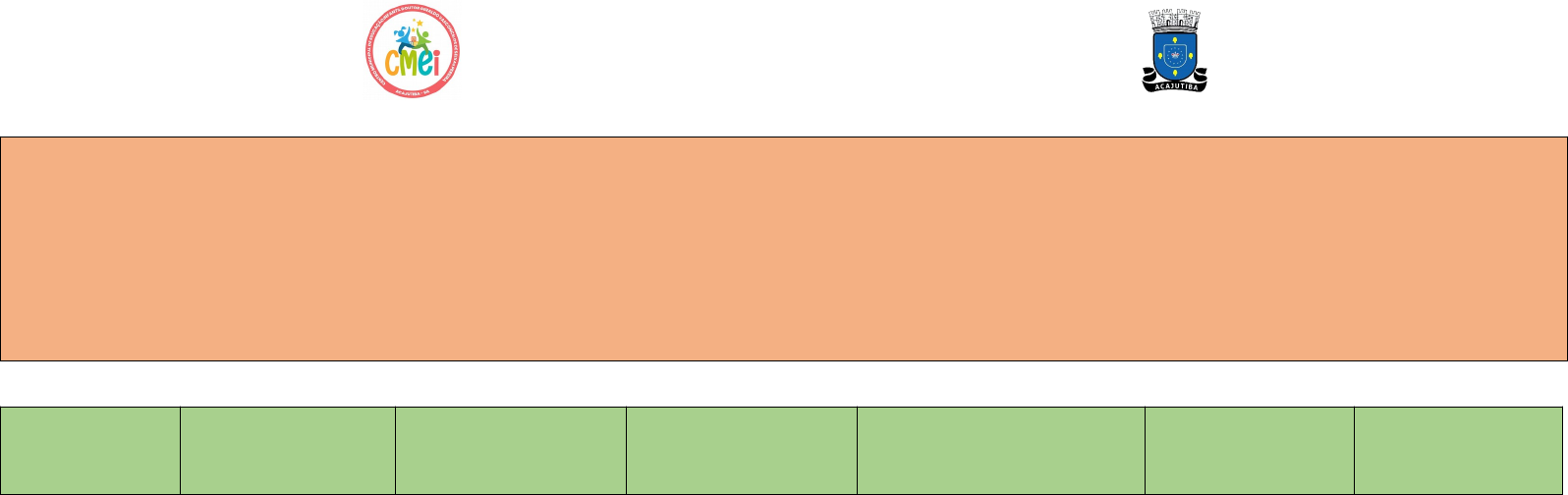 CENTRO MUNICIPAL DE EDUCAÇÃO INFANTIL - CMEI DOUTOR GERALDO VASCONCELOS DE SEIXAS PEREIRA Praça Ruy Barbosa, Centro – Acajutiba/BA Centro Municipal de Educação Infantil Dr. Geraldo Vasconcelos de Seixas Pereira Gestor: Joselita Coordenadora: Maria Dilma Neres Farias Professora:---------------------------------------------------------------- Supervisora: Turno: Integral Oficineira ------------------------------------------------------- Faixa Etária: Crianças pequenas 4 anos à 5 anos e 11 meses Período: De / a / /2025 Turma:______ PLANO DE AULA DIÁRIO/SEMANAL Dia/Data Campo de experiência Situação Didática Expectativa de Aprendizagem e Desenvolvimento Desenvolvimento Recursos Avaliação 01/09/2025 PLANEJAMENTO PLANEJAMENTO PLANEJAMENTO Dia/Data Campo de experiência Eixo Temáticos/conteúdos Objetivos e códigos da Base Metodologia Recursos Avaliação 02/09/2025 O EU, O OUTRO E NÓS ESCUTA, FALA, PENSAMENTOS E A IMAGINAÇÃO Identidade nacional e símbolos nacionais Leitura e escrita convencional e espontânea (EI03EO06) Manifestar interesse e respeito por diferentes culturas e modos de vida. (EI03EF09) levantar hipótese em relação a linguagem escrita, realizando registro de palavras e textos por meio de escrita espontânea. Dia/Data Campo de experiência Eixo Temáticos/conteúdos Objetivos e códigos da Base Metodologia Recursos Avaliação 03/09/2025 Traços, sons, cores e formas Espaços, tempos, quantidades, relações e transformações Explorando as cores nacionais (verde, amarelo, azul e branco) Linguagem matemática: contagem oral e escrita. (EI03TS02) (EI03ET07) Dia/Data Campo de experiência Situação Didática Expectativa de Aprendizagem e Desenvolvimento Desenvolvimento Recursos Avaliação 04/09/2025 ESPAÇOS, TEMPOS, RELAÇÕES E TRANSFORMAÇÕES ESCUTA, FALA, PENSAMENTO E IMAGINAÇÃO A natureza Brasileira Nome e sobrenome. (EI03ET03) (EI03EF09) Dia/Data Campo de experiência Eixo Temáticos/conteúdos Objetivos e códigos da Base Metodologia Recursos Avaliação 05/09/2025 CORPO, GESTOS E MOVIMENTOS TRAÇOS, SONS CORES E FORMAS. Expressões artísticas e corporais Confecção coletiva da bandeira do Brasil (EI03CG01) (EI03TS02) image1.jpg image2.png