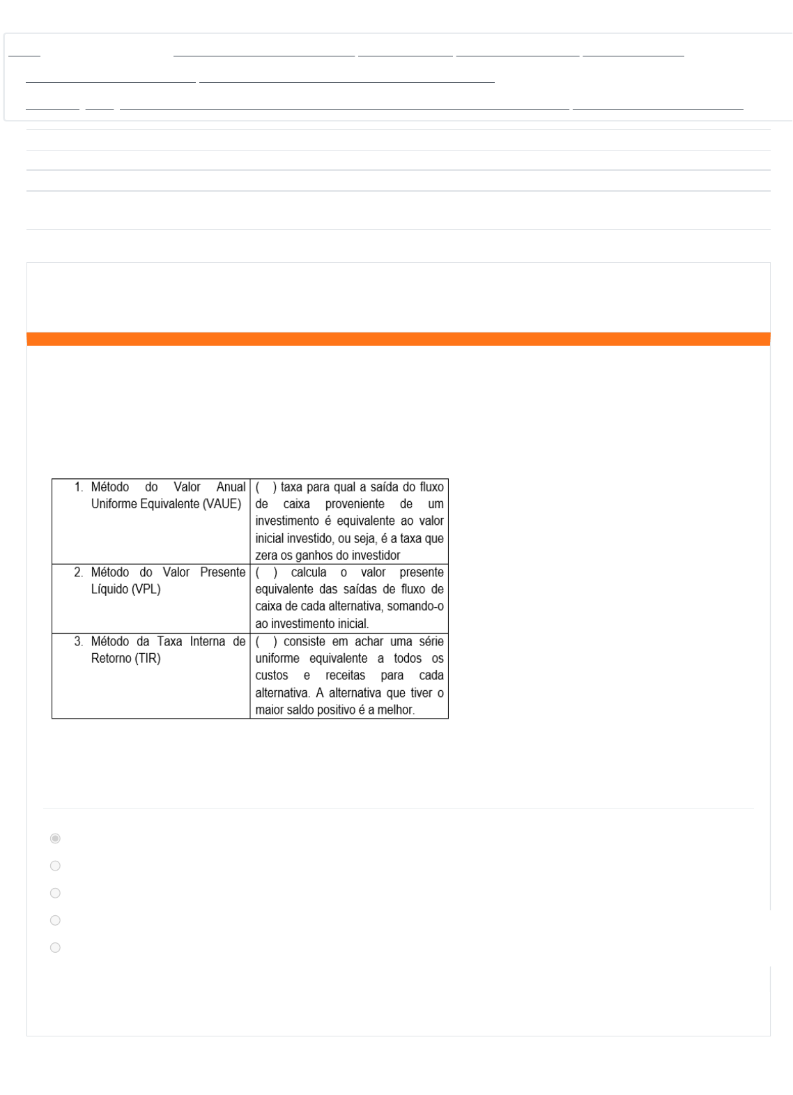 Iniciado em segunda, 1 set 2025, 17:18 Estado Finalizada Concluída em segunda, 1 set 2025, 18:24 Tempo empregado 1 hora 5 minutos Avaliar 5,40 de um máximo de 6,00(90%) Questão 1 Completo Atingiu 0,60 de 0,60 Diversas pessoas que lidam com projetos de investimentos se deparam com a escolha de alternativas que envolvem estudos econômicos. E o pior, é muito comum vermos essas pessoas fazerem suas escolhas sem que o custo do capital empregado seja considerado de maneira correta. Somente um estudo econômico pode confirmar a viabilidade de projetos tecnicamente corretos. Neste sentido, relacione a coluna da direita com a da esquerda: Assinale a alternativa correta: a. 3, 2, 1. b. 3, 1, 2. c. 2, 1, 3. d. 2, 3, 1. e. 1, 2, 3. Sua resposta está correta. Painel / Minhas Disciplinas / BACHARELADO EM ADMINISTRAÇÃO - 2ª GRADUAÇÃO-disc. 0325 - FINANÇAS CORPORATIVAS / PROVA CURRICULAR - REALIZAÇÃO DIA 29/08/2025 A 01/09/2025 - VALOR 6,0 PONTOS / AA4 - CLIQUE AQUI PARA REALIZAR A PROVA CURRICULAR - DIA 29/08/2025 A 01/09/2025 - VALOR 6,0 PONTOS - 1ª OPORTUNIDADE https://www.eadunifatecie.com.br/course/view.php?id=74275 https://www.eadunifatecie.com.br/my/ https://www.eadunifatecie.com.br/course/view.php?id=74275 https://www.eadunifatecie.com.br/course/view.php?id=74275#section-11 https://www.eadunifatecie.com.br/mod/quiz/view.php?id=2436171 Questão 2 Completo Atingiu 0,60 de 0,60 Considere a situação hipotética abaixo: Você realizou uma prova importante para um concurso público e, ao sair o gabarito, você certificou que conseguiu acertar 30 questões de um total de 50 questões que compunham a prova. Analise as afirmações abaixo: I. O principal (ou seja, o valor de grandeza do qual se calcula a percentagem) corresponde a 50. II. A percentagem de acerto corresponde a 30%. III. As 30 questões acertadas correspondem a 60% da prova. IV. O principal (ou seja, o valor de grandeza do qual se calcula a percentagem) corresponde a 20. Assinale a alternativa correta: a. Apenas II, III e IV estão corretas. b. Apenas I e IV estão corretas. c. Apenas IV está correta. d. Apenas I e III estão corretas. e. Todas as alternativas estão corretas. Sua resposta está correta. Questão 3 Completo Atingiu 0,60 de 0,60 De acordo com Samanez (2009), como na projeção dos fluxos de caixa de um projeto geralmente temos que trabalhar com grande quantidade de variáveis ou fatores, torna-se importante identificar quais deles têm um peso maior na determinação de tais fluxos. Assim, analise as afirmações abaixo: I. Custo de capital ou Taxa mínima de atratividade representa o retorno mínimo exigido para um projeto de investimento. II. Na análise de cenários, ao invés da variação de um parâmetro por vez, podemos fazer variar um conjunto destes, formando assim os cenários. III. A análise das alternativas de investimento é apenas um passo de um processo de solução de um problema. De nada adianta boa técnica de análise de alternativas se estas não forem adequadamente geradas. IV. Análise unidimensional: quando medimos os efeitos de cada variável separadamente. Já a análise multidimensional: quando analisamos os efeitos das variáveis ao mesmo tempo. Assinale a alternativa correta: a. Apenas II, III e IV estão corretas. b. As afirmativas I, II, III e IV estão corretas. c. Apenas I e IV estão corretas. d. Apenas I, II e V estão corretas. e. Apenas II está correta. Sua resposta está correta. Questão 4 Completo Atingiu 0,00 de 0,60 Questão 5 Completo Atingiu 0,60 de 0,60 […] É o valor que representa a quantidade de unidades tomadas em cada 100. Tal afirmação corresponde à definição de? Assinale a alternativa correta: a. Principal. b. Taxa. c. Montante. d. Percentagem. e. Juros. Sua resposta está incorreta. De acordo com Samanez (2009), a Árvore de decisão consiste num meio de mostrar a anatomia de uma decisão de investimento, assim como a interação entre decisão presente, eventos possíveis, atitudes de competidores e possíveis decisões futuras e suas consequências. Analise as afirmativas abaixo quanto os ramos de uma árvore de decisão devem ser levados em conta: I. As probabilidades após os nós de incerteza. II. Os retornos no final dos ramos. III. Os valores de investimentos nos nós de decisão. IV. O valor aplicado, visto que quanto mais valor aplicado em um projeto, mais chances de retorno. Assinale a alternativa correta: a. Apenas IV está correta. b. Apenas I e IV estão corretas. c. Apenas II, III e IV estão corretas. d. As afirmativas I, II, III e IV estão corretas. e. Apenas I, II e III estão corretas. Sua resposta está correta. Questão 6 Completo Atingiu 0,60 de 0,60 Questão 7 Completo Atingiu 0,60 de 0,60 O principal, a percentagem e a taxa são os elementos do cálculo percentual. Neste sentido, relacione a coluna da direita com a da esquerda: Assinale a alternativa correta: a. 3, 2, 1. b. 1, 3, 2. c. 2, 1, 3. d. 3, 1, 2. e. 1, 2, 3. Sua resposta está correta. É a perda do valor dos bens imateriais em razão do tempo. Essa afirmação se refere a: Assinale a alternativa correta: a. Imobilização. b. Amortização. c. Montante. d. Depreciação. e. Juros. Sua resposta está correta. Questão 8 Completo Atingiu 0,60 de 0,60 Depreciação é a diminuição do valor dos bens corpóreos em decorrência de desgaste ou perda de utilidade pelo uso, ação da natureza ou obsolescência. Expressa a perda de valor que os valores imobilizados de utilização sofrem no tempo, por força de seu emprego na gestão. Deste modo, analise as afirmações que correspondem a bens que não sofrem depreciação: I. Veículos. II. Móveis e Utensílios. III. Bens que normalmente aumentam de valor com o tempo, como obra de arte. IV. Terrenos, salvo em melhoramentos ou construções. Assinale a alternativa correta quanto aos bens que não sofrem depreciação: a. Apenas I e IV estão corretas. b. Apenas III e IV estão corretas. c. As afirmativas I, II, III e I