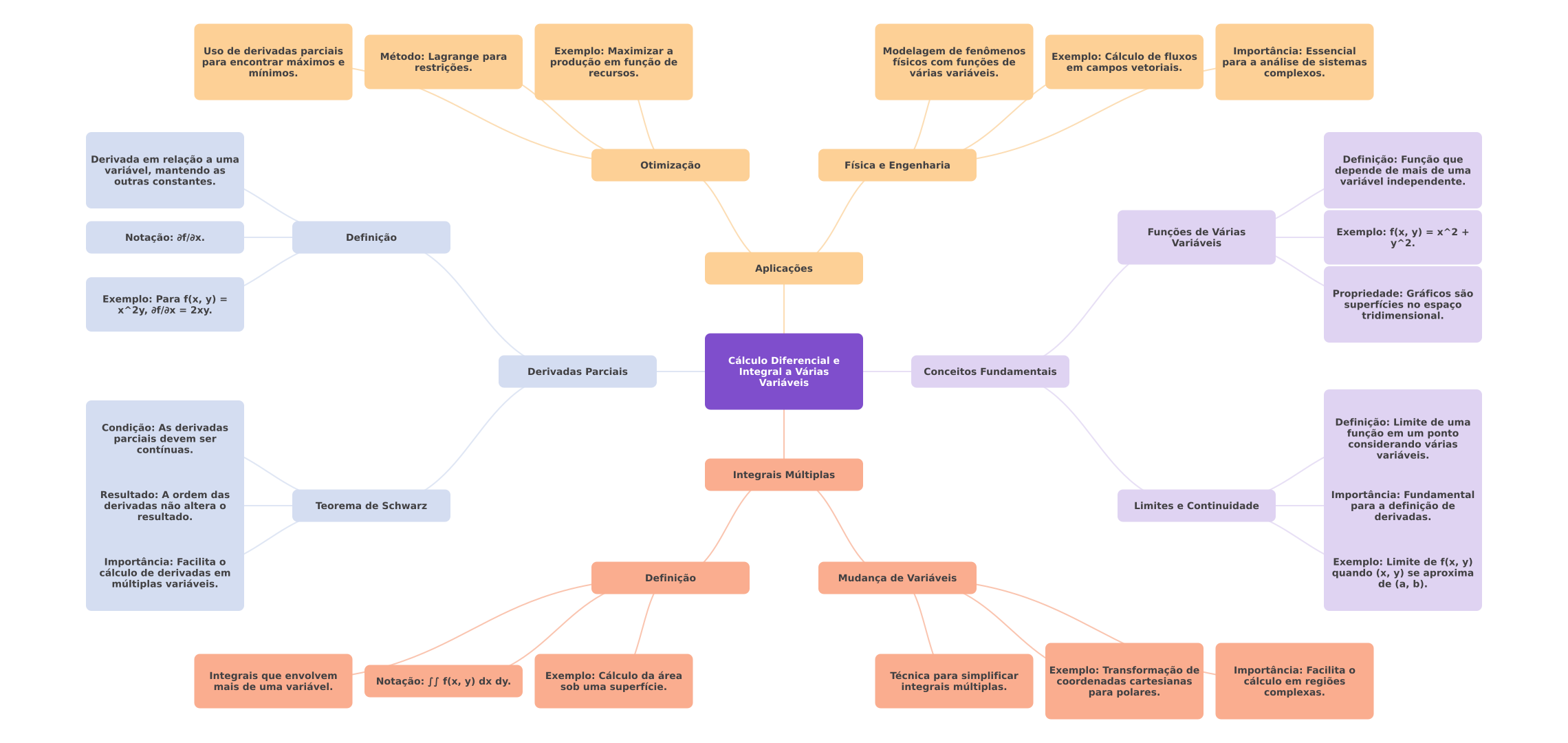 Uso de derivadas parciais Método: Lagrange para Exemplo: Maximizar a Modelagem de fenômenos físicos com funções de Exemplo: Cálculo de fluxos Importância: Essencial para encontrar máximos e mínimos. restrições. produção em função de em campos vetoriais. para a análise de sistemas recursos. várias variáveis. complexos. Derivada em relação a uma Definição: Função que variável, mantendo as Otimização Física e Engenharia depende de mais de uma outras constantes. variável independente. Funções de Várias Notação: af/ax. Definição Exemplo: f(x, y) = + Variáveis y^2. Aplicações Exemplo: Para f(x, y) = Propriedade: Gráficos são x^2y, af/ax = 2xy. superfícies no espaço tridimensional. Cálculo Diferencial e Derivadas Parciais Integral a Várias Conceitos Fundamentais Variáveis Definição: Limite de uma Condição: As derivadas parciais devem ser função em um ponto considerando várias contínuas. variáveis. Integrais Múltiplas Resultado: A ordem das Importância: Fundamental derivadas não altera Teorema de Schwarz Limites e Continuidade para a definição de resultado. derivadas. Importância: Facilita Exemplo: Limite de f(x, y) cálculo de derivadas em Definição Mudança de Variáveis quando (x, y) se aproxima múltiplas variáveis. de b). Integrais que envolvem Notação: f(x, y) dx dy. Exemplo: Cálculo da área Técnica para simplificar Exemplo: Transformação de Importância: Facilita coordenadas cartesianas mais de uma variável. sob uma superfície. integrais múltiplas. cálculo em regiões para polares. complexas.
