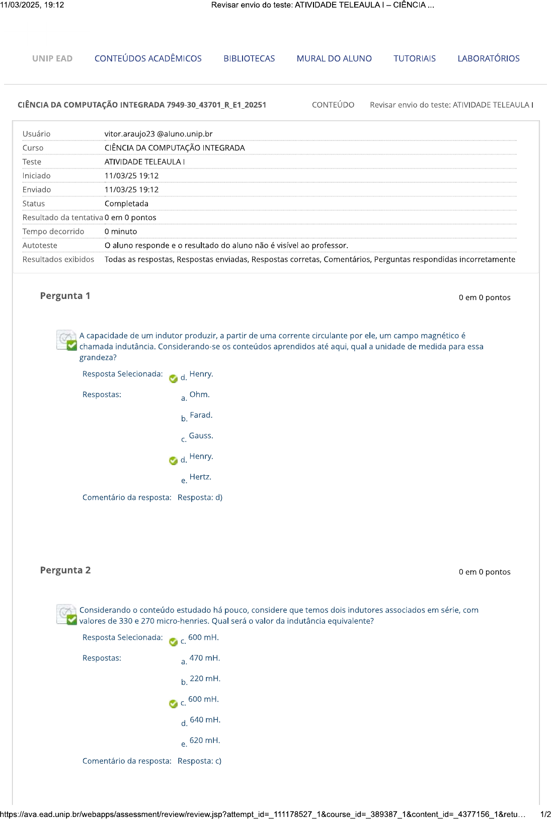 11/03/2025, 19:12 Revisar envio do teste: ATIVIDADE TELEAULA UNIP EAD CONTEÚDOS ACADÊMICOS BIBLIOTECAS MURAL DO ALUNO TUTORIAIS LABORATÓRIOS CIÊNCIA DA COMPUTAÇÃO INTEGRADA 7949-30_43701_R_E1_20251 CONTEÚDO Revisar envio do teste: ATIVIDADE TELEAULA Usuário vitor.araujo23 @aluno.unip.br Curso CIÊNCIA DA COMPUTAÇÃO INTEGRADA Teste ATIVIDADE Iniciado 11/03/25 19:12 Enviado 11/03/25 19:12 Status Completada Resultado da tentativa 0 em 0 pontos Tempo decorrido 0 minuto Autoteste aluno responde e o resultado do aluno não é visível ao professor. Resultados exibidos Todas as respostas, Respostas enviadas, Respostas corretas, Comentários, Perguntas respondidas incorretamente Pergunta 1 0 em 0 pontos A capacidade de um indutor produzir, a partir de uma corrente circulante por ele, um campo magnético é chamada indutância. Considerando-se os conteúdos aprendidos até aqui, qual a unidade de medida para essa grandeza? Resposta Selecionada: d. Henry. Respostas: a. Ohm. b. Farad. C. Gauss. d. Henry. e. Hertz. Comentário da resposta: Resposta: d) Pergunta 2 0 em 0 pontos Considerando conteúdo estudado há pouco, considere que temos dois indutores associados em série, com valores de 330 e 270 micro-henries. Qual será valor da indutância equivalente? Resposta Selecionada: 600 mH. C. Respostas: a. 470 mH. b. 220 mH. 600 mH. d. 640 mH. e. 620 mH. Comentário da resposta: Resposta: c) 1/211/03/2025, 19:12 Revisar envio do teste: ATIVIDADE TELEAULA CIÊNCIA... Pergunta 3 0 em 0 pontos A respeito dos filtros, os valores de quais componentes determinam os parâmetros das frequências que serão atenuadas ou destacadas? Resposta Selecionada: a. Dos capacitores e dos indutores. Respostas: a. Dos capacitores e dos indutores. b. Apenas dos capacitores. Apenas dos indutores. d. Dos indutores e dos resistores. e. Apenas dos resistores. Comentário da resposta: Resposta: a) Pergunta 4 0 em 0 pontos Considere um relê com um par de contatos tipo normalmente fechado e normalmente aberto, além do contato comum. Se a bobina estiver energizada, qual será contato que estará ligado ao comum? Resposta Selecionada: b. Normalmente aberto. Respostas: Normalmente fechado. a. b. Normalmente aberto. C. Ambos. d. Nenhum contato. e. A bobina precisa estar desligada para que haja conexão com contato comum. Comentário da resposta: Resposta: b) Terça-feira, 11 de Março de 2025 19h12min50s GMT-03:00 OK 2/2