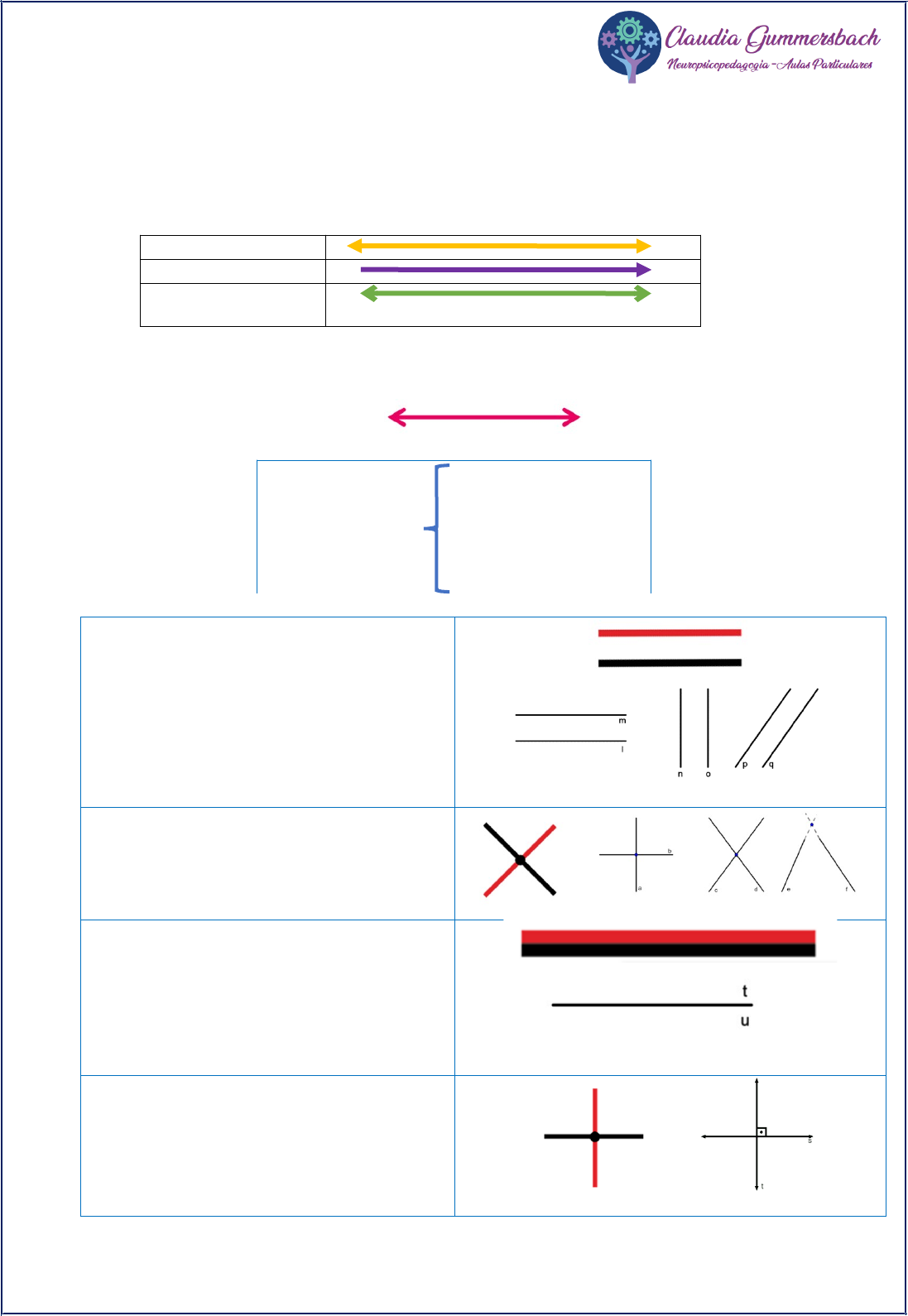 RETAS – SEMIRRETAS – SEGMENTOS DE RETA 1) RETAS Retas Semirretas Segmentos de reta · Uma reta é uma linha formada por infinitos pontos alinhados, ou seja, uma reta é uma linha que não tem início e não tem fim. Tipos de Retas · Paralelas · Concorrentes · Coincidentes · Perpendiculares · Transversais a) Retas paralelas: · são retas que não possuem nenhum ponto em comum – nunca se cruzam. · podem estar na horizontal, na vertical ou até mesmo inclinadas: b) Retas concorrentes: · Apresentam um único ponto em comum. · São retas que se cruzam em algum momento. c) Retas coincidentes: · Duas retas que ocupam a mesma posição em um plano. d) Perpendiculares: · Quando as retas se cruzam em um ponto e formam um ângulo reto (ângulo de 90°). e) Transversais: · Quando ela se cruza com outras duas retas em pontos diferentes. 2) SEMIRRETAS · Uma semirreta é uma parte de uma reta, ela possui um ponto de início (ou fim), sendo infinita apenas em um dos lados. · Semirreta com início no ponto A e que PASSA pelo ponto B. · Observe que a semirreta do exemplo apenas passa pelo ponto B, ela não termina nele. 3) SEGMENTO DE RETA · Um segmento de reta é uma parte da reta, ele tem início e fim. · Segundo a posição que ocupam no plano, os segmentos de reta são classificados em: Tipos de Segmentos de Retas · Consecutivos · Colineares · Adjacentes · Congruentes · Transversais a) Segmentos Consecutivos: quando possuem um ponto em comum. Na figura abaixo o ponto em comum é o D. b) Segmentos Colineares: quando os pontos pertencem à mesma reta. Ou seja, quando dois ou mais pontos distintos compartilham a mesma reta. c) Segmentos Adjacentes: quando são consecutivos e colineares ao mesmo tempo. d) Segmentos Congruentes: quando dois segmentos apresentam a mesma medida. Na figura abaixo AB~CD (Lê-se: o segmento AB é congruente ao segmento CD). EXERCÍCIOS 1) Classifique as retas em Paralelas, Concorrentes e Perpendiculares: 2) Observe a figura abaixo: 3) Classifique as figuras abaixo em Retas, Semirretas, Segmento de retas: ÂNGULOS Ângulos são duas semirretas que têm a mesma origem, no vértice, e são medidos em grau (º) ou em radiano (rad), de acordo com o Sistema Internacional. Tipos de Ângulos Conforme as suas medidas, os ângulos são classificados em agudo, reto, obtuso e raso. Agudo O ângulo agudo mede menos do que 90º (