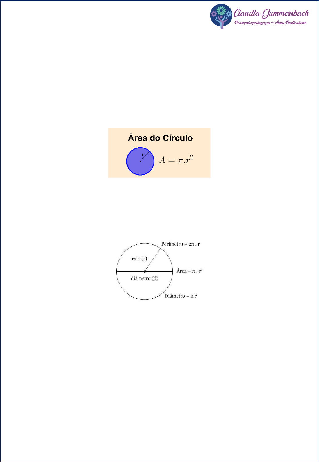 ÁREA DE UM CÍRCULO Área da Coroa do Círculo A área do círculo corresponde ao valor da superfície dessa figura, levando em conta a medida de seu raio (r). Fórmula: Cálculo da Área do Círculo Para calcular a área do círculo devemos utilizar a seguinte fórmula: π: constante Pi (3,14) r: raio · Raio: (r) corresponde a distância entre o centro e a extremidade do círculo. · Diâmetro é um segmento de reta que passa pelo centro do círculo, dividindo-o em duas metades iguais. Dito isso, o diâmetro equivale duas vezes o raio (2r). EXERCÍCIOS 1) Considere um círculo com raio de 3 m. Calcule a sua área. 2) Um prefeito construiu um chafariz circular numa praça da cidade. Ele solicitou ao engenheiro que o chafariz tivesse um diâmetro de 10 m. Calcule a área deste chafariz. 3) Uma piscina circular foi construída com uma área de 50 m². Qual o diâmetro da piscina e o raio? 4) Calcule a área do círculo que tem diâmetro igual a 20cm. 1256 cm2 5) Determine quantos metros quadrados de grama são necessários para preencher uma praça circular com raio de 20 metros. 1256 m2 6) Qual a área de um círculo de raio igual a 10m? 314 m2 4 7) Calcule a área de um círculo cujo raio mede 3m. 28,26 m2 8) Sabendo que o raio de um círculo mede 6cm, calcule a área desse círculo. 113,04 cm2 9) Utilize a fórmula da área do círculo para calcular a área de um círculo de raio 4cm. 50,24 cm2 10) Se o raio de um círculo mede 20cm, então sua área mede quantos cm²? 1256 cm2 11) Qual é a metade da área do círculo cujo diâmetro mede 45 metros? 794,8125 m2 image1.png image2.jpeg image3.png