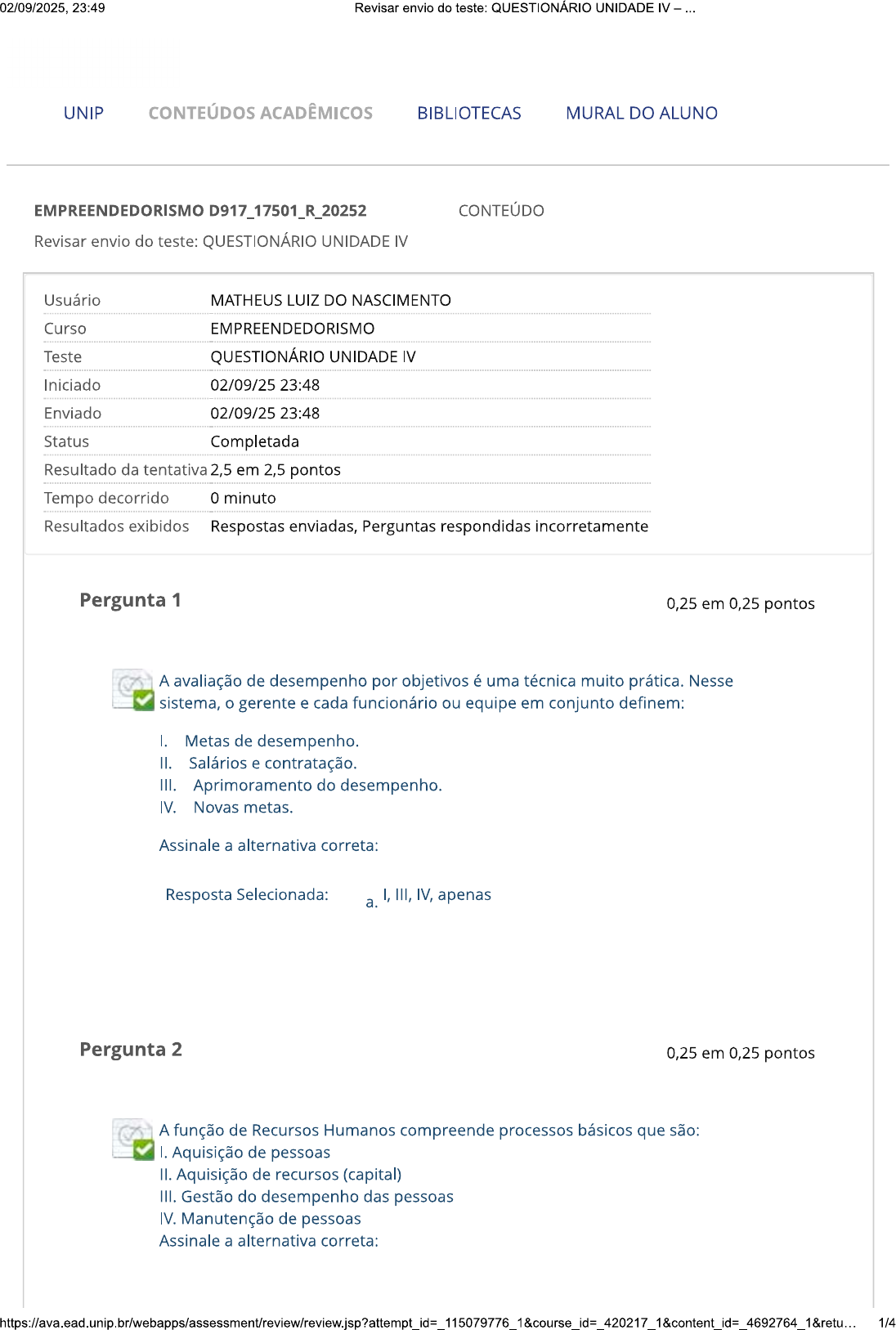 02/09/2025, 23:49 Revisar envio do teste: QUESTIONÁRIO UNIDADE IV UNIP CONTEÚDOS ACADÊMICOS BIBLIOTECAS MURAL DO ALUNO EMPREENDEDORISMO D917_17501_R_20252 CONTEÚDO Revisar envio do teste: QUESTIONÁRIO UNIDADE IV Usuário MATHEUS LUIZ DO NASCIMENTO Curso EMPREENDEDORISMO Teste QUESTIONÁRIO UNIDADE IV Iniciado 02/09/25 23:48 Enviado 02/09/25 23:48 Status Completada Resultado da tentativa 2,5 em 2,5 pontos Tempo decorrido 0 minuto Resultados exibidos Respostas enviadas, Perguntas respondidas incorretamente Pergunta 1 0,25 em 0,25 pontos A avaliação de desempenho por objetivos é uma técnica muito prática. Nesse sistema, gerente e cada funcionário ou equipe em conjunto definem: I. Metas de desempenho. II. Salários e contratação. III. Aprimoramento do desempenho. IV. Novas metas. Assinale a alternativa correta: Resposta Selecionada: I, III, IV, apenas a. Pergunta 2 0,25 em 0,25 pontos A função de Recursos Humanos compreende processos básicos que são: I. Aquisição de pessoas II. Aquisição de recursos (capital) III. Gestão do desempenho das pessoas IV. Manutenção de pessoas Assinale a alternativa correta: 1/402/09/2025, 23:49 Revisar envio do teste: QUESTIONÁRIO UNIDADE IV Resposta Selecionada: a. I, III, IV Pergunta 3 0,25 em 0,25 pontos Brainstorming, conhecido como "tempestade de ideias", baseia-se no fato de as pessoas serem estimuladas a gerar novas ideias quando estão em grupo. Brainstorming é executado conforme algumas regras. Assinale abaixo a alternativa incorreta: Resposta a. Selecionada: Deve haver críticas mútuas no grupo sobre as ideias que vêm à tona. Pergunta 4 0,25 em 0,25 pontos cargo é uma coleção de responsabilidades e tarefas que 0 funcionário deverá desempenhar e executar. Além disso, uma descrição de cargo contém quais informações? I. Posição do cargo na hierarquia. II. Qualificações obrigatórias, como diploma ou habilitações profissionais. III. Condições de trabalho, como riscos ou necessidades de usar equipamentos especializados. IV. Classe salarial. Assinale a alternativa correta: Resposta Selecionada: d. I, II, III, IV Pergunta 5 0,25 em 0,25 pontos Os autores falam "...que a composição do corpo do plano de negócios começa por uma descrição da empresa, que explicitará nível de organização do negócio, a história, a constituição jurídica, a situação atual e os projetos futuros, tanto para pesquisa e desenvolvimento como para atividades operacionais e financeiras". Estamos falando de quais autores? Assinale a alternativa correta: Resposta Selecionada: d. Dornellas (2008) e Biagio (2005) 2/402/09/2025, 23:49 Revisar envio do teste: QUESTIONÁRIO UNIDADE IV Pergunta 6 0,25 em 0,25 pontos Por meio do Marketing, a empresa demonstra sua capacidade em tornar produto conhecido pelos clientes. De acordo com Biagio (2006): I. É a forma que a empresa tem de divulgar seus produtos para cliente. II. Despertará em seus clientes a necessidade de adquirir produtos. III. A forma como a empresa se comunicará com seus consumidores. Está correto em afirmar: Resposta Selecionada: I, II, III Pergunta 7 0,25 em 0,25 pontos Produção é como a empresa produz seus produtos ou presta seus serviços. A produção e a instalação de processos que afetarão diretamente a produção devem ser identificadas, planejadas e conduzidas sob condições controladas. Quais são essas condições? Resposta Selecionada: Todas as alternativas estão corretas. e. Pergunta 8 0,25 em 0,25 pontos Segundo Chiavenato (2008), "...O empreendedor que deseja desenvolver um produto ou um novo negócio deverá levar em consideração primeiramente qual etapa"? Assinale a alternativa correta: Resposta Selecionada: b. Oportunidade e ideia Pergunta 9 0,25 em 0,25 pontos Segundo o autor "...Mercado é um grupo de consumidores que têm necessidades e interesses similares." Estamos falando de qual autor? 3/402/09/2025, 23:49 Revisar envio do teste: QUESTIONÁRIO UNIDADE IV Resposta Selecionada: C. Maximiano (2006) Pergunta 10 0,25 em 0,25 pontos Tomada de decisões é uma constante na rotina de um empreendedor, como por exemplo, comprar ou alugar equipamentos e instalações, fixar preços e controlar estoques, entre outros. Estamos falando de? Resposta Selecionada: Plano financeiro C. OK Terça-feira, 2 de Setembro de 2025 23h49min46s GMT-03:00 4/4