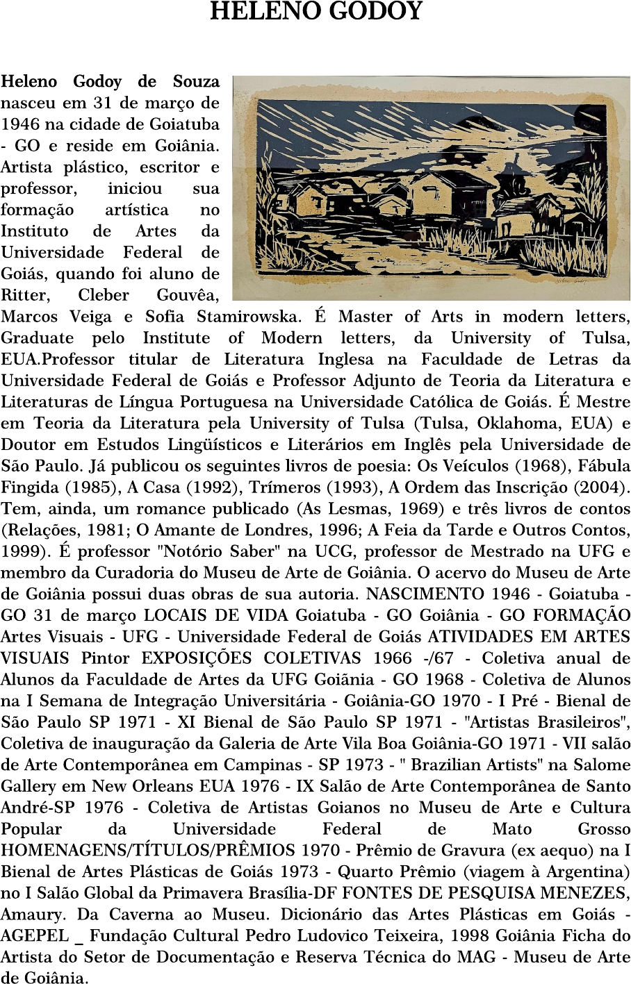 HELENO GODOY Heleno Godoy de Souza nasceu em 31 de março de 1946 na cidade de Goiatuba GO e reside em Goiânia. Artista plástico, escritor e professor, iniciou sua formação artística no Instituto de Artes da Universidade Federal de Goiás, quando foi aluno de Ritter, Cleber Gouvêa, Marcos Veiga e Sofia Stamirowska. É Master of Arts in modern letters, Graduate pelo Institute of Modern letters, da University of Tulsa, EUA.Professor titular de Literatura Inglesa na Faculdade de Letras da Universidade Federal de Goiás e Professor Adjunto de Teoria da Literatura e Literaturas de Língua Portuguesa na Universidade Católica de Goiás. É Mestre em Teoria da Literatura pela University of Tulsa (Tulsa, Oklahoma, EUA) e Doutor em Estudos Lingüísticos e Literários em Inglês pela Universidade de São Paulo. Já publicou os seguintes livros de poesia: Os Veículos (1968), Fábula Fingida (1985), A Casa (1992), Trímeros (1993), A Ordem das Inscrição (2004). Tem, ainda, um romance publicado (As Lesmas, 1969) e três livros de contos (Relações, 1981; Amante de Londres, 1996; A Feia da Tarde e Outros Contos, 1999). É professor "Notório Saber" na UCG, professor de Mestrado na UFG e membro da Curadoria do Museu de Arte de Goiânia. acervo do Museu de Arte de Goiânia possui duas obras de sua autoria. NASCIMENTO 1946 Goiatuba GO 31 de março LOCAIS DE VIDA Goiatuba GO Goiânia GO FORMAÇÃO Artes Visuais UFG Universidade Federal de Goiás ATIVIDADES EM ARTES VISUAIS Pintor EXPOSIÇÕES COLETIVAS 1966 -/67 Coletiva anual de Alunos da Faculdade de Artes da UFG GO 1968 Coletiva de Alunos na I Semana de Integração Universitária Goiânia-GO 1970 I Pré Bienal de São Paulo SP 1971 XI Bienal de São Paulo SP 1971 "Artistas Brasileiros", Coletiva de inauguração da Galeria de Arte Vila Boa Goiânia-GO 1971 VII salão de Arte Contemporânea em Campinas SP 1973 Brazilian Artists" na Salome Gallery em New Orleans EUA 1976 IX Salão de Arte Contemporânea de Santo André-SP 1976 Coletiva de Artistas Goianos no Museu de Arte e Cultura Popular da Universidade Federal de Mato Grosso 1970 Prêmio de Gravura (ex aequo) na I Bienal de Artes Plásticas de Goiás 1973 Quarto Prêmio (viagem à Argentina) no I Salão Global da Primavera Brasília-DF FONTES DE PESQUISA MENEZES, Amaury. Da Caverna ao Museu. Dicionário das Artes Plásticas em Goiás AGEPEL Fundação Cultural Pedro Ludovico Teixeira, 1998 Goiânia Ficha do Artista do Setor de Documentação e Reserva Técnica do MAG Museu de Arte de Goiânia.