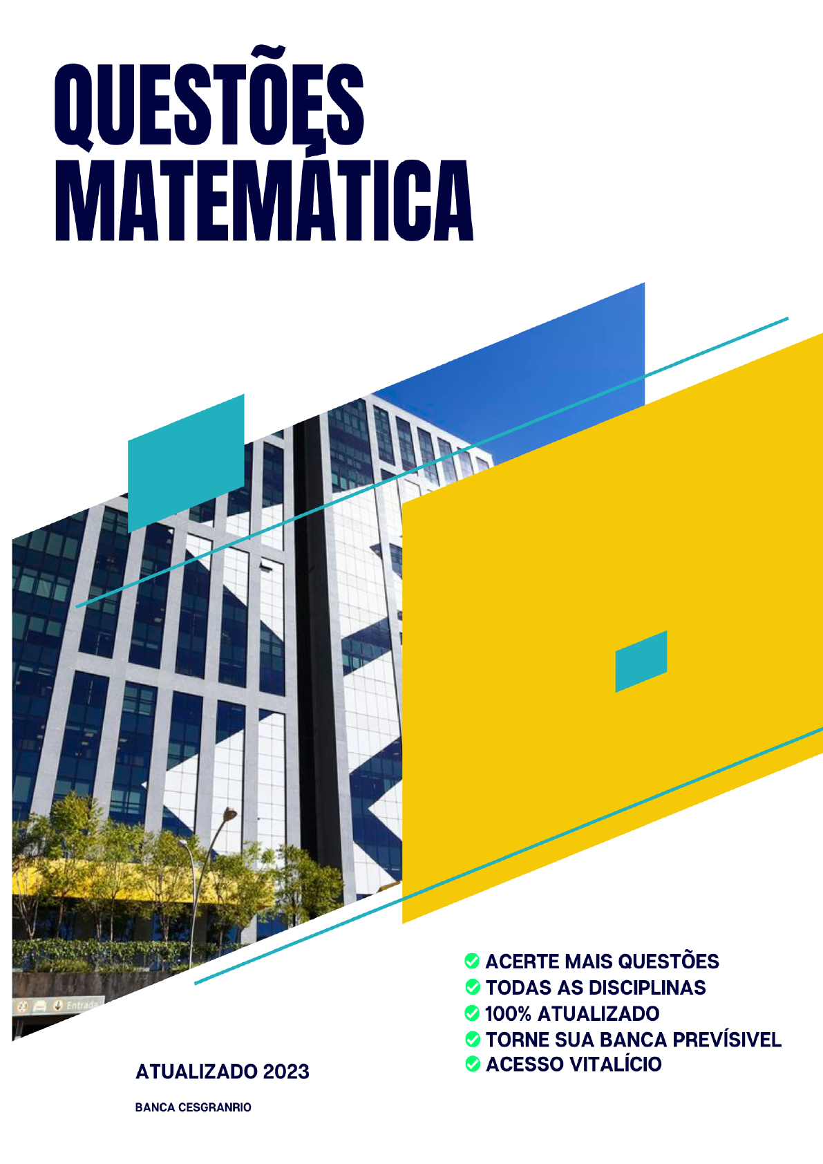 <p>MATEMÁTICA</p><p>Questão 1</p><p>Assunto: Definição, subconjuntos, inclusão e</p><p>pertinência, operações, conjunto das partes</p><p>Os conjuntos P e Q têm p e q elementos,</p><p>respectivamente, com p + q = 13.</p><p>Sabendo-se que a razão entre o número de</p><p>subconjuntos de P e o número de</p><p>subconjuntos de Q é 32, quanto vale o produto</p><p>pq?</p><p>a) 16</p><p>b) 32</p><p>c) 36</p><p>d) 42</p><p>e) 46</p><p>Questão 2</p><p>Assunto: Número de elementos da união, da</p><p>intersecção, do complemento e da diferença</p><p>Em uma central de telemarketing com 42</p><p>funcionários, todos são atenciosos ou</p><p>pacientes. Sabe-se que apenas 10% dos</p><p>funcionários atenciosos são pacientes e que</p><p>apenas 20% dos funcionários pacientes são</p><p>atenciosos.</p><p>Quantos funcionários são atenciosos e</p><p>pacientes?</p><p>a) 1</p><p>b) 3</p><p>c) 9</p><p>d) 12</p><p>e) 27</p><p>Questão 3</p><p>Assunto: Adição, subtração, multiplicação e</p><p>divisão de números naturais</p><p>A capacidade máxima de carga de um</p><p>caminhão é de 2,670 toneladas (t). Duas</p><p>cargas de grãos estão destinadas a esse</p><p>caminhão: a primeira, de 2,500 t e, a segunda,</p><p>de 0,720 t.</p><p>A soma das massas das duas cargas</p><p>destinadas ao caminhão excede a sua</p><p>capacidade máxima em</p><p>a) 0,100 t</p><p>b) 0,550 t</p><p>c) 0,593 t</p><p>d) 1,450 t</p><p>e) 1,648 t</p><p>Questão 4</p><p>Assunto: Adição, subtração, multiplicação e</p><p>divisão de números naturais</p><p>Pouca gente sabe, mas uma volta completa no</p><p>planeta Terra, no perímetro do Equador,</p><p>corresponde a cerca de 40.000 km.</p><p>Observe, na imagem, a quilometragem</p><p>indicada no hodômetro de um veículo.</p><p>Considerando-se os dados do texto e a</p><p>imagem acima, quantos quilômetros esse</p><p>veículo ainda terá que percorrer para</p><p>2</p><p>completar o equivalente a três voltas no</p><p>perímetro do Equador da Terra?</p><p>a) 51.308</p><p>b) 38.602</p><p>c) 31.308</p><p>d) 28.692</p><p>e) 28.620</p><p>Questão 5</p><p>Assunto: Adição, subtração, multiplicação e</p><p>divisão de números naturais</p><p>Considere cinco punhados idênticos de feijões,</p><p>ou seja, com a mesma quantidade de feijão.</p><p>Tais punhados estão enfileirados e numerados</p><p>do primeiro ao quinto. Uma pessoa retira de</p><p>cada punhado, exceto do terceiro, três feijões</p><p>e os coloca no terceiro punhado. Em seguida,</p><p>essa pessoa retira do terceiro punhado tantos</p><p>feijões quantos restaram no segundo e os</p><p>coloca no primeiro punhado.</p><p>Após os procedimentos realizados por essa</p><p>pessoa, quantos feijões sobraram no terceiro</p><p>punhado?</p><p>a) 7</p><p>b) 15</p><p>c) 9</p><p>d) 12</p><p>e) 10</p><p>Questão 6</p><p>Assunto: Adição, subtração, multiplicação e</p><p>divisão de números naturais</p><p>A Figura a seguir mostra as flores de um</p><p>canteiro, e o número abaixo de cada flor</p><p>representa a quantidade, em mg, de pólen de</p><p>cada uma das flores.</p><p>Uma abelha visita esse canteiro para colher</p><p>pólen, mas consegue carregar, no máximo, 8</p><p>mg de pólen por viagem. Sabe-se ainda que,</p><p>em cada viagem, a abelha colhe o pólen de</p><p>uma única flor, que pode ser revisitada em</p><p>outras viagens.</p><p>Qual a quantidade máxima de pólen, em mg,</p><p>que essa abelha consegue colher em 24</p><p>viagens?</p><p>a) 180</p><p>b) 192</p><p>c) 184</p><p>d) 191</p><p>e) 190</p><p>Questão 7</p><p>Assunto: Adição, subtração, multiplicação e</p><p>divisão de números naturais</p><p>Observe a adição:</p><p>Sendo E e U dois algarismos não nulos e</p><p>distintos, a soma E + U é igual a</p><p>a) 13</p><p>b) 14</p><p>3</p><p>c) 15</p><p>d) 16</p><p>e) 17</p><p>Questão 8</p><p>Assunto: Adição, subtração, multiplicação e</p><p>divisão de números naturais</p><p>Na multiplicação por 2 mostrada abaixo, que</p><p>foi feita corretamente, cada letra representa</p><p>um algarismo; letras iguais representam o</p><p>mesmo algarismo e letras diferentes</p><p>representam algarismos diferentes. A palavra</p><p>GENTE representa um número de 5 algarismos</p><p>e IBGE representa um número de 4</p><p>algarismos. G e I, portanto, são diferentes de</p><p>zero.</p><p>I B G E</p><p>×2</p><p>--------------------</p><p>GENTE</p><p>O valor da expressão G+E+I+T⋅B−N é</p><p>a) 6</p><p>b) 8</p><p>c) 13</p><p>d) 18</p><p>e) 21</p><p>Questão 9</p><p>Assunto: Adição, subtração, multiplicação e</p><p>divisão de números naturais</p><p>Durante 185 dias úteis, 5 funcionários de uma</p><p>agência bancária participaram de um rodízio.</p><p>Nesse rodízio, a cada dia, exatamente 4 dos 5</p><p>funcionários foram designados para trabalhar</p><p>no setor X, e cada um dos 5 funcionários</p><p>trabalhou no setor X o mesmo número N de</p><p>dias úteis.</p><p>O resto de N na divisão por 5 é</p><p>a) 4</p><p>b) 3</p><p>c) 0</p><p>d) 1</p><p>e) 2</p><p>Questão 10</p><p>Assunto: Adição, subtração, multiplicação e</p><p>divisão de números naturais</p><p>Apenas três equipes participaram de uma</p><p>olimpíada estudantil: as equipes X, Y e Z.</p><p>A Tabela a seguir apresenta o número de</p><p>medalhas de ouro, de prata e de bronze</p><p>obtidas por essas equipes.</p><p>ouro prata bronze total</p><p>Equipe X 3 4 2 9</p><p>Equipe Y 1 6 8 15</p><p>Equipe Z 0 9 5 14</p><p>De acordo com os critérios adotados nessa</p><p>competição, cada medalha dá a equipe uma</p><p>pontuação diferente: 4 pontos por cada</p><p>medalha de ouro, 3 pontos por cada medalha</p><p>de prata e 1 ponto por cada medalha de</p><p>bronze. A classificação final das equipes é dada</p><p>pela ordem decrescente da soma dos pontos</p><p>de cada equipe, e a equipe que somar mais</p><p>pontos ocupa o primeiro lugar.</p><p>Qual foi a diferença entre as pontuações</p><p>obtidas pelas equipes que ficaram