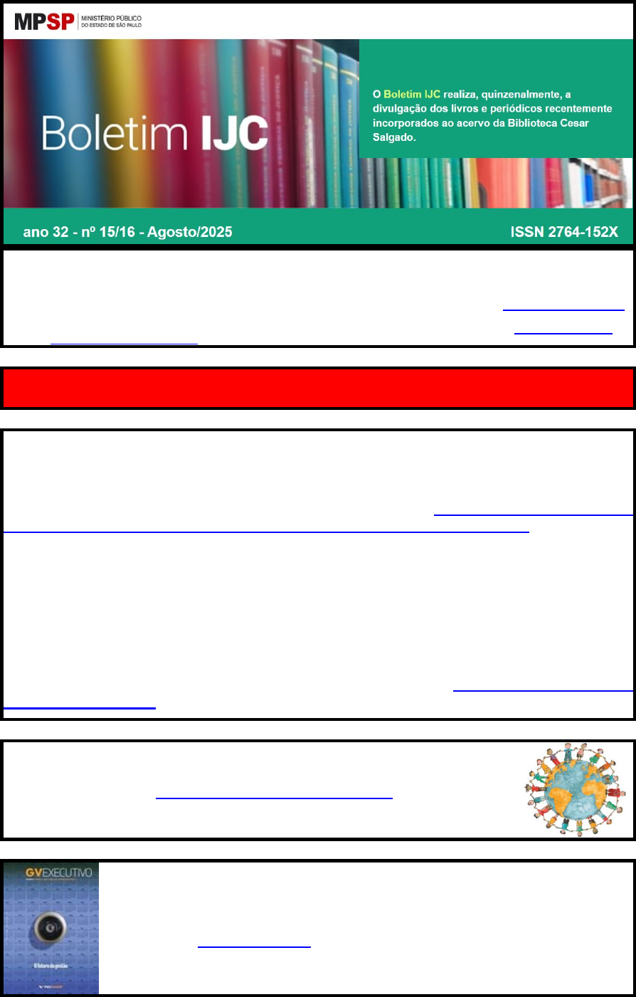 BOLETIM IJC, ano 32, no 15/16, ago. 2025 - ISSN 2764-152X. Página 1 Ministério Público do Estado de São Paulo Diretoria-Geral Centro de Documentação e Biblioteca Biblioteca "Cesar Salgado" - Setor de Divulgação bibliotecário responsável: João Evangelista de Souza Lima Neto e-mail: bibliomp@mpsp.mp.br Números anteriores Sobre o Boletim Fique por dentro do IJC CONHEÇA OS VENCEDORES DO 5º PRÊMIO DE RECONHECIMENTO ACADÊMICO EM DIREITOS HUMANOS O Instituto Vladimir Herzog e a Diretoria Executiva de Direitos Humanos (DeDH) da Unicamp divulgaram a lista de vencedores da 5ª edição do Prêmio de Reconhecimento Acadêmico em Direitos Humanos Unicamp-Instituto Vladimir Herzog (Pradh), que contempla pesquisas acadêmicas de graduação, mestrado e doutorado que contribuam para a proteção e defesa do direito à vida, dignidade humana e justiça social e sejam exemplo de defesa da liberdade e responsabilidade científica para a melhoria da humanidade. Em sua 5ª edição, foram escolhidas pesquisas encerradas no ano de 2024 em instituições públicas de ensino e pesquisa sediadas no Estado de São Paulo (municipais, estaduais e federais), distribuídas nas seguintes áreas: ciências exatas, engenharia e tecnologia; ciências biológicas e da saúde; ciências humanas, sociais e econômicas; artes, comunicação e linguagem; educação. Confira aqui a lista de pesquisas premiadas. DIREITOS HUMANOS Veja a mais recente doutrina sobre Direitos Humanos incorporada à Biblioteca Digital do MP-SP. O FUTURO DA GESTÃO Nesta edição do Boletim IJC está disponível a versão digital do volume 24, número 2 da GV-EXECUTIVO com o seguinte Caderno Especial: “O futuro da gestão”. mailto:bibliomp@mpsp.mp.br https://mpspbr.sharepoint.com/:b:/s/bibliotecadigitalmpsp/EdV2dXEkPvlGjas46TYQgwkBYEsiTZ2z6_eDbOdS4dRCOg?e=14kE0f https://mpspbr.sharepoint.com/:i:/s/bibliotecadigitalmpsp/ERZlSPlaOxFLtJ0RahN6RasBA4yrYRSuapnxnrlGeGUAlw?e=UWJ0E7 https://nam02.safelinks.protection.outlook.com/?url=https%3A%2F%2F6kg1l.r.ag.d.sendibm3.com%2Fmk%2Fcl%2Ff%2Fsh%2F1t6Af4OiGsE8LIlz22u8SQHvEhaenb%2FNUCuCa5Rv555&data=05%7C02%7Cjoaoeslneto%40mpsp.mp.br%7C9f1ac4615f174612014b08ddde91ecb5%7C2dbd8499508d4b76a31dca39cb3d8f1d%7C0%7C0%7C638911440546025849%7CUnknown%7CTWFpbGZsb3d8eyJFbXB0eU1hcGkiOnRydWUsIlYiOiIwLjAuMDAwMCIsIlAiOiJXaW4zMiIsIkFOIjoiTWFpbCIsIldUIjoyfQ%3D%3D%7C0%7C%7C%7C&sdata=Bwg%2F3v4Grr%2B9Lv3eV7Upm0WDbDl6IM%2F8gnqa9EMDHFw%3D&reserved=0 https://nam02.safelinks.protection.outlook.com/?url=https%3A%2F%2F6kg1l.r.ag.d.sendibm3.com%2Fmk%2Fcl%2Ff%2Fsh%2F1t6Af4OiGsE8LIlz22u8SQHvEhaenb%2FNUCuCa5Rv555&data=05%7C02%7Cjoaoeslneto%40mpsp.mp.br%7C9f1ac4615f174612014b08ddde91ecb5%7C2dbd8499508d4b76a31dca39cb3d8f1d%7C0%7C0%7C638911440546025849%7CUnknown%7CTWFpbGZsb3d8eyJFbXB0eU1hcGkiOnRydWUsIlYiOiIwLjAuMDAwMCIsIlAiOiJXaW4zMiIsIkFOIjoiTWFpbCIsIldUIjoyfQ%3D%3D%7C0%7C%7C%7C&sdata=Bwg%2F3v4Grr%2B9Lv3eV7Upm0WDbDl6IM%2F8gnqa9EMDHFw%3D&reserved=0 https://mpspbr.sharepoint.com/:b:/s/bibliotecadigitalmpsp/EZ46uOdam8tBkF3CDEmzO-gBGx1SbZZUt4R39YDV5HHK5A?e=HdVau0 https://mpspbr.sharepoint.com/:b:/s/bibliotecadigitalmpsp/EZ46uOdam8tBkF3CDEmzO-gBGx1SbZZUt4R39YDV5HHK5A?e=HdVau0 https://mpspbr.sharepoint.com/:b:/s/bibliotecadigitalmpsp/EUSlYWtuuR5PrLxXH2Jq2cIBMfCVn1RRaMlV3fC3wrwvsQ?e=Zf9Ptl https://mpspbr.sharepoint.com/:b:/s/bibliotecadigitalmpsp/EeH4chp5-VFAoKd4fRA8mkUB3MqvvlO8C8vwbm6z9srMLA?e=UTpCCa BOLETIM IJC, ano 32, no 15/16, ago. 2025 - ISSN 2764-152X. Página 2 PODER JUDICIÁRIO E CONFLITOS FUNDIÁRIOS NO CAMPO E NA CIDADE Nesta edição do Boletim IJC está disponível a versão digital do volume 11, número 1 da INSURGÊNCIA com o seguinte Dossiê: “Poder Judiciário e conflitos fundiários no campo e na cidade”. BOLSONARISMO EM FOCO Nesta edição do Boletim IJC está disponível a versão digital do número 122 da LUA NOVA com o seguinte Tema: “Bolsonarismo em foco”. NOVAS PERSPECTIVAS PARA A ADVOCACIA PÚBLICA Nesta edição do Boletim IJC está disponível a versão digital do volume 16, número 03 da PUBLICAÇÕES DA ESCOLA DA AGU com o seguinte Tema: “Novas Perspectivas para a Advocacia Pública”. DIVERSIDADES NA EXECUÇÃO PENAL Nesta edição do Boletim IJC está disponível a versão digital do volume 5, número 2 da REVISTA BRASILEIRA DE EXECUÇÃO PENAL com o seguinte Tema: “Diversidades na execução penal”. REFORMA DO CÓDIGO CIVIL Nesta edição do Boletim IJC está disponível a versão digital do número 47 da REVISTA CIENTÍFICA VIRTUAL com o seguinte Tema: “Reforma do Código Civil”. VALIDADE E EFICÁCIA DA ASSINATURA DIGITAL EM CONTRATOS ELETRÔNICOS Nesta edição do Boletim IJC está disponível a versão digital do volume 4, número 7 da REVISTA DA ESMAPE ONLINE com o seguinte Tema: “Validade e eficácia da assinatura digital em contratos eletrônicos: uma análise da manifestação de vontade no ambiente virtual”. https://mpspbr.sharepoint.com/:b:/s/bibliotecadigitalmpsp/EftJe_CGoLtDh_Sk7wZ5PlsB9QXvUsdeGFIiuhKOBNvMbg?e=OJkJEb https://mpspbr.sharepoint.com/:b:/s/bibliotecadigitalmpsp/EVmEuyewcqpPtD8qcFWhAjUBi9EFOcn1DC1K2C5Yn25DNw?e=mt39Lv https://mpspbr.sharepoint.com/:b:/s/bibliotecadigitalmpsp/Eapp8s96wHtPl6hZyvWnWsMBPxTDQWzwct7ZwFJvCI0u9A?e=XOuclx https://mpspbr.sharepoint.com/:b:/s/bibliotecadigitalmpsp/EYh7wJZUyzhOgp1SQTcENCEBtLQ_eBsTkvdpoKACPBNRtw?e=iyUtWy https://mpspbr.sharepoint.com/:b:/s/bibliotecadigitalmpsp/EUuOGxnoq8lKmMyhhsUNBOEB0dt4T0mBlmBbZ0ef6uQszw?e=2H4TAM https://mpspbr.sharepoint.com/:b:/s/bibliotecadigitalmpsp/EQHPa-kdxbtFo2HD0YnKOzEBtYsedtR9kh18CcVm1WB_Eg?e=TRw8l6 BOLETIM IJC, ano 32, no 15/16, ago. 2025 - ISSN 2764-152X. Página 3 ARTIGOS EM DESTAQUE Veja alguns dos artigos apresentados pelas revistas incluídas neste Boletim IJC: “DA REALIDADE SOCIAL DE CRIANÇAS ABANDONADAS À UTOPIA: a adoção intuitu personae, o Cadastro Nacional de Adotantes e o surgimento da família socioafetiva”, na REVISTA DOS TRIBUNAIS. “O PARADIGMA DO RISCO E A EXPANSÃO 