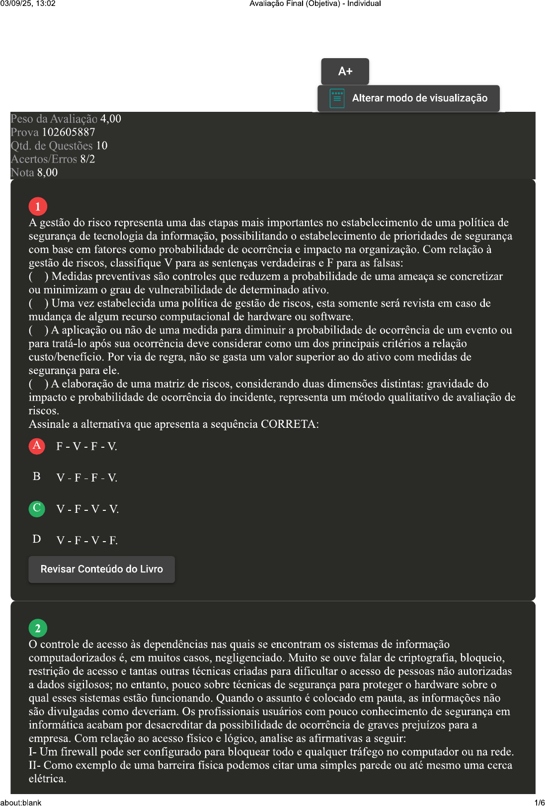03/09/25, 13:02 Avaliação Final (Objetiva) Individual A+ Alterar modo de visualização Peso da Avaliação 4,00 Prova 102605887 Qtd. de Questões 10 Acertos/Erros 8/2 Nota 8,00 1 A gestão do risco representa uma das etapas mais importantes no estabelecimento de uma política de segurança de tecnologia da informação, possibilitando o estabelecimento de prioridades de segurança com base em fatores como probabilidade de ocorrência e impacto na organização. Com relação à gestão de riscos, classifique V para as sentenças verdadeiras e F para as falsas: ( ) Medidas preventivas são controles que reduzem a probabilidade de uma ameaça se concretizar ou minimizam o grau de vulnerabilidade de determinado ativo. Uma vez estabelecida uma política de gestão de riscos, esta somente será revista em caso de mudança de algum recurso computacional de hardware ou software. A aplicação ou não de uma medida para diminuir a probabilidade de ocorrência de um evento ou para tratá-lo após sua ocorrência deve considerar como um dos principais critérios a relação Por via de regra, não se gasta um valor superior ao do ativo com medidas de segurança para ele. A elaboração de uma matriz de riscos, considerando duas dimensões distintas: gravidade do impacto e probabilidade de ocorrência do incidente, representa um método qualitativo de avaliação de riscos. Assinale a alternativa que apresenta a sequência CORRETA: A F-V-F-V. B V-F-F-V. V-F-V-V. D V-F-V-F. Revisar Conteúdo do Livro 2 controle de acesso às dependências nas quais se encontram os sistemas de informação computadorizados é, em muitos casos, negligenciado. Muito se ouve falar de criptografia, bloqueio, restrição de acesso e tantas outras técnicas criadas para dificultar o acesso de pessoas não autorizadas a dados sigilosos; no entanto, pouco sobre técnicas de segurança para proteger o hardware sobre o qual esses sistemas estão funcionando. Quando o assunto é colocado em pauta, as informações não são divulgadas como deveriam. Os profissionais usuários com pouco conhecimento de segurança em informática acabam por desacreditar da possibilidade de ocorrência de graves prejuízos para a empresa. Com relação ao acesso físico e lógico, analise as afirmativas a seguir: I- Um firewall pode ser configurado para bloquear todo e qualquer tráfego no computador ou na rede. II- Como exemplo de uma barreira física podemos citar uma simples parede ou até mesmo uma cerca elétrica. about:blank 1/603/09/25, 13:02 Avaliação Final (Objetiva) Individual III- Um exemplo de barreira física que limita o acesso seria uma sala-cofre ou catracas de controle de acesso físico. IV- Quando a empresa define um acesso físico restrito, a segurança lógica acaba sendo desnecessária. Assinale a alternativa CORRETA: FONTE: SILVA, G. F.; SCHIMIGUEL, J. Segurança em ambiente de TI: segurança física da informação em pequenas empresas e estudo de caso em Jundiaí/SP. Revista Observatorio de la Economía Latinoamericana, Brasil, mar. 2017. A As afirmativas I e IV estão corretas. B As afirmativas II e IV estão corretas. As afirmativa I, II e III estão corretas. D Somente a afirmativa I está correta. 3 As ameaças a que se sujeitam informação e ativos de informação podem ser classificadas como: ambientais, técnicas, lógicas e humanas. A respeito disso, associe os itens, utilizando o código a seguir: I- Ambientais. II- Técnicas. III- Lógicas. IV- Humanas. ( ) Fraudes e sabotagens. ( ) Códigos maliciosos, invasões de sistema. ( ) Configurações incorretas, falhas de software. ( ) Climatização, fenômenos da natureza. Assinale a alternativa que apresenta a sequência CORRETA: A II I IV - III. B IV III II I. III - IV - II I. D II III - IV I. 4 Os sistemas operacionais são elementos fundamentais para o funcionamento de praticamente qualquer sistema de computação, dos minúsculos sistemas embarcados e telefones celulares aos gigantescos centros de processamento de dados das grandes empresas. Considerando as funções de um sistema operacional, associe os itens, utilizando o código a seguir: I- Gestão do processador. II- Gestão da memória RAM. III- Gestão das entradas/saídas. IV- Gestão da execução dos aplicativos. sistema operacional unifica e controla o acesso dos programas aos recursos materiais através dos drivers (também chamados de gerenciadores de periféricos ou gerenciadores de entrada/saída). about:blank 2/603/09/25, 13:02 Avaliação Final (Objetiva) Individual sistema operacional é responsável pela boa execução dos aplicativos, atribuindo-lhes os recursos necessários ao seu funcionamento. Dessa maneira, ele também permite eliminar um aplicativo que não responde corretamente. ( ) sistema operacional se encarrega de gerenciar o subsídio do processador entre os diversos programas, graças a um algoritmo de escalonamento. tipo de programador é totalmente dependente do sistema operacional em função do objetivo visado. ( ) sistema operacional se encarrega de gerenciar o espaço de memória atribuído a cada aplicativo e, se for o caso, a cada usuário. No caso de insuficiência de memória física, o sistema operacional pode criar uma área de memória no disco rígido, chamada de memória virtual. Ela faz funcionar aplicativos que necessitam de mais memória do que a memória RAM tem disponível no sistema. Por outro lado, essa memória é muito mais lenta. Assinale a alternativa que apresenta a sequência CORRETA: FONTE: MAZIERO, Carlos Sistemas operacionais: Conceitos e mecanismos. Disponível em: http://wiki.inf.ufpr. br/maziero/lib/exe/fetch.php. Acesso em: 19 out. 2021. A I II III - IV. B III IV I II. IV II III I. D I III IV II. 5 Entende-se por informação baseada em Tecnologia da Informação, "a informação residente em base de dados, arquivos informatizados, mídias magnéticas ou outras que exijam soluções de informática para acessá-las" (BEAL, 2008, 33). Sobre os