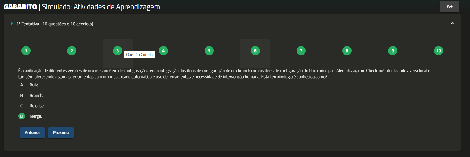 GABARITO Simulado: Atividades de Aprendizagem A+ Tentativa 10 questões e 10 acerto(s) 1 2 3 4 5 6 7 8 9 10 Questão Correta É a unificação de diferentes versões de um mesmo item de configuração, tendo integração dos itens de configuração de um branch com itens de configuração do fluxo principal. Além disso, com Check-out atualizando a area local e também oferecendo algumas ferramentas com um mecanismo automático e de ferramentas e necessidade de intervenção humana. Esta terminologia é conhecida como? A Build. B Branch. C Release. D Merge. Anterior Próxima