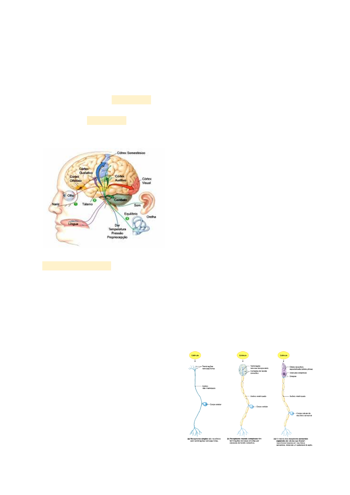 Fisiologia Sensorial Introdução à Fisiologia Sensorial O sistema sensorial é responsável por captar informações do meio externo (visão, audição, olfato, paladar, tato, equilíbrio) e do meio interno (temperatura, pressão, dor, níveis de gases e pH). Esses estímulos são detectados por receptores específicos, que transformam energia do ambiente (luz, som, pressão, substâncias químicas) em impulsos nervosos. O SNC interpreta esses impulsos e constrói a percepção da realidade. Exemplo: o que chamamos de “ver” uma maçã vermelha é apenas a interpretação que o cérebro faz da luz captada pelos fotorreceptores. Tipos de Receptores Sensoriais Mecanorreceptores: detectam pressão, vibração e movimento. Estão na pele (tato), no ouvido interno (equilíbrio e audição). Proprioceptores: informam posição e movimento do corpo, localizados em músculos, tendões e articulações. Termorreceptores: captam mudanças de temperatura (quente e frio). Quimiorreceptores: respondem a substâncias químicas, como papilas gustativas (paladar) e células olfatórias (olfato). Fotorreceptores: cones e bastonetes da retina que captam luz e cores (visão). Nociceptores: detectam estímulos potencialmente lesivos, gerando dor. Integração prática: No experimento do equilíbrio, as células ciliadas do labirinto (mecanorreceptores) continuaram sendo estimuladas pela endolinfa mesmo após parar de girar → sensação de tontura. Discriminação Tátil A pele não tem a mesma densidade de receptores em todas as regiões. Ponta dos dedos, língua e lábios → alta concentração de receptores → alta sensibilidade. Costas, braços e pernas → baixa concentração → menor precisão. Dor e Nocicepção Dor (IASP): experiência sensorial e emocional desagradável, associada a lesão real ou potencial. Nocicepção: é a detecção neural do estímulo nocivo pelos nociceptores, antes mesmo da dor ser interpretada pelo cérebro. Importância fisiológica: a dor é um mecanismo protetor, funcionando como alarme → sem dor, lesões poderiam evoluir sem que percebêssemos (ex.: em diabéticos com neuropatia). Tipos de Fibras Nervosas Aα e Aβ: fibras grandes e mielinizadas → transmitem rápido → tato e propriocepção. Aδ: finas, pouco mielinizadas → transmitem dor aguda, rápida e bem localizada. C: muito finas, amielínicas → transmitem dor lenta, difusa e mal localizada (ex.: dor profunda, queimadura). Vias da Dor A dor é conduzida até o cérebro por vias ascendentes: Neoespinotalâmica: conduzida por fibras Aδ → dor rápida, aguda, bem localizada (ex.: dor de dente). Paleoespinotalâmica: conduzida por fibras C → dor lenta, difusa, de difícil localização, associada a emoção (ex.: dor visceral). O corpo possui também vias descendentes inibitórias, que controlam a dor: Origem: substância cinzenta periaquedutal (mesencéfalo). Neurotransmissores envolvidos: encefalinas, serotonina, noradrenalina. Essas vias podem reduzir a transmissão do estímulo doloroso na medula. Teoria do portão (Gate Control): Estímulos não dolorosos (como massagem ou pressão) ativam interneurônios inibitórios que “fecham o portão” na medula, reduzindo a passagem dos impulsos dolorosos. Explica por que esfregar o local de uma pancada alivia a dor. Substâncias que sensibilizam terminações nervosas Lesões nos tecidos liberam mediadores químicos que tornam os nociceptores mais sensíveis: Prostaglandinas, bradicinina, histamina, serotonina, íons K⁺ e H⁺. Esses mediadores explicam por que áreas inflamadas ficam mais doloridas ao toque. Dor Irradiada e Dor Referida Dor irradiada: se espalha a partir da origem por conexões nervosas (ex.: dor na coluna que desce para a perna – ciática). Dor referida: percebida em região diferente da real origem (ex.: dor no braço esquerdo em infarto, dor de ouvido em inflamação dentária). Dor Orofacial A dor orofacial pode atingir tecidos moles (mucosa, músculos, articulações) e tecidos duros (ossos, dentes). Principais causas: odontalgia, periodontite, disfunção da ATM, otite, sinusite. Categorias: Somática: dor causada por lesão real nos tecidos inervados. Neurogênica: gerada por alterações no próprio sistema nervoso. Psicogênica: modulada ou amplificada por fatores emocionais. Tratamento Farmacológico da Dor Orofacial Anti-inflamatórios: reduzem inflamação e sensibilização dos nociceptores. Opioides: ativam receptores opioides centrais → reduzem a percepção da dor. Antidepressivos tricíclicos / anticonvulsivantes: usados em dores crônicas ou neuropáticas. Anestésicos locais: bloqueiam a condução nervosa no local da aplicação. Outros moduladores: antagonistas NMDA, agonistas adrenérgicos e 5HT1. Estudo Dirigido 1. Quais são os sentidos especiais e os somáticos? Especiais: visão, audição, paladar, olfato, equilíbrio. Somáticos: tato, pressão, temperatura, dor, propriocepção. 2. Como os sentidos são percebidos pelo SNC? Por receptores específicos que transformam estímulos em sinais elétricos levados ao cérebro, onde são interpretados. 3. O que é dor e o que é nocicepção? Qual a importância fisiológica da dor? Dor: experiência sensorial e emocional desagradável associada a lesão real/potencial. Nocicepção: detecção neural do estímulo nocivo. Importância: mecanismo de proteção, alerta contra danos. 4. Quais as características das fibras Aα, Aβ, Aδ e C? Aα e Aβ: rápidas, mielinizadas, propriocepção e tato leve. Aδ: dor aguda, rápida e localizada. C: dor lenta, difusa e prolongada. 5. Quais substâncias endógenas sensibilizam terminações nervosas? Prostaglandinas, bradicinina, histamina, serotonina, íons K⁺ e H⁺. 6. Quais são as vias ascendentes da dor e suas características? Neoespinotalâmica: dor rápida e bem localizada (fibras Aδ). Paleoespinotalâmica: dor lenta, difusa e associada a emoção (fibras C). 7. Qual a via descendente inibitória d