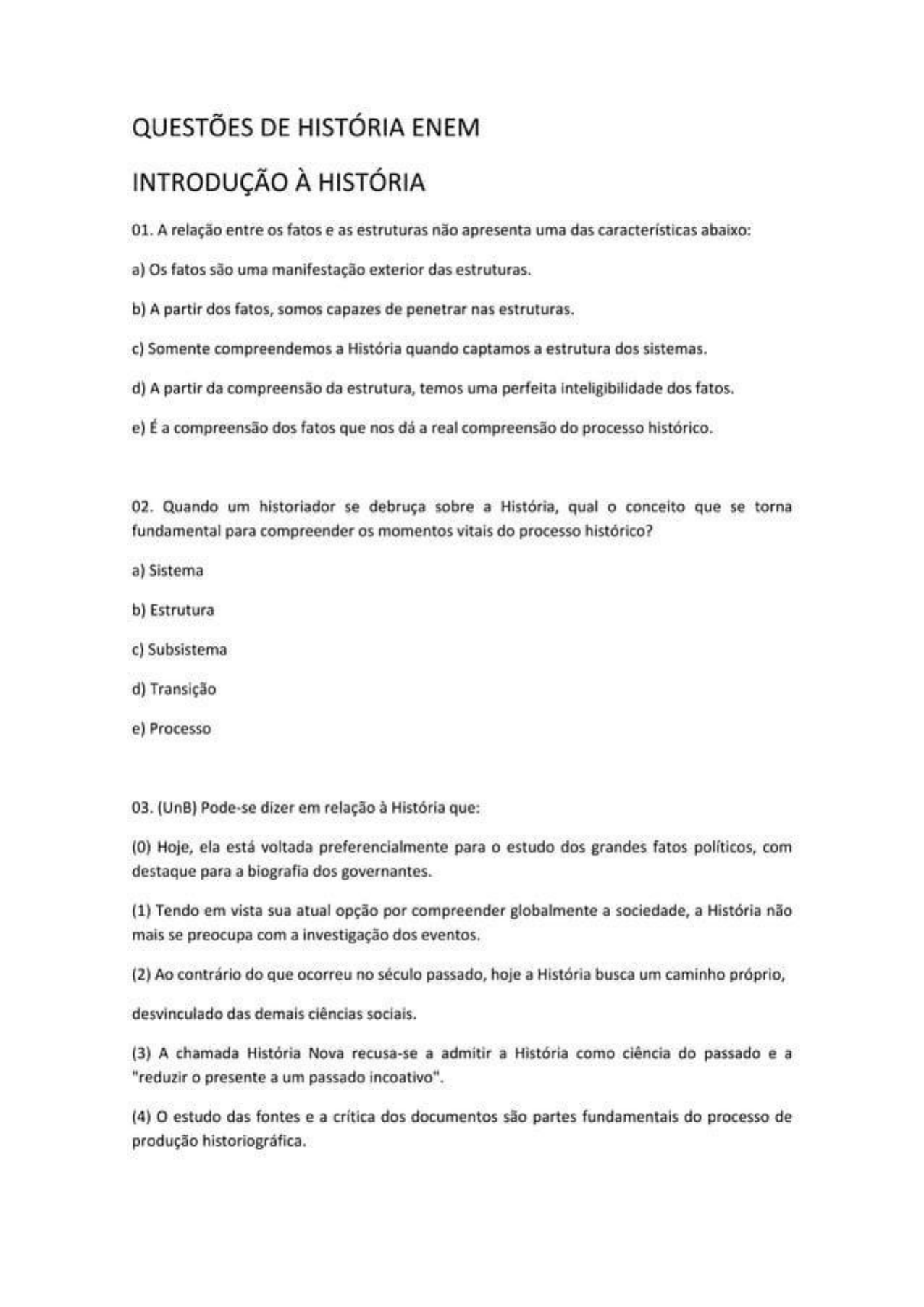 QUESTÕES DE HISTÓRIA ENEM INTRODUÇÃO À HISTÓRIA 01. A relação entre os fatos e as estruturas não apresenta uma das características abaixo: a) Os fatos são uma manifestação exterior das estruturas. b) A partir dos fatos, somos capazes de penetrar nas estruturas. c) Somente compreendemos a História quando captamos a estrutura dos sistemas. d) A partir da compreensão da estrutura, temos uma perfeita dos fatos. e) É a compreensão dos fatos que nos dá a real compreensão do processo histórico. 02. Quando um historiador se debruça sobre a História, qual o conceito que se torna fundamental para compreender os momentos vitais do processo histórico? a) Sistema b) Estrutura c) Subsistema d) Transição e) Processo 03. (UnB) Pode-se dizer em relação à História que: (0) Hoje, ela está voltada preferencialmente para o estudo dos grandes fatos políticos, com destaque para a biografia dos governantes. (1) Tendo em vista sua atual opção por compreender globalmente a sociedade, a História não mais se preocupa com a investigação dos eventos. (2) Ao contrário do que ocorreu no século passado, hoje a História busca um caminho próprio, desvinculado das demais ciências sociais. (3) A chamada História Nova recusa-se a admitir a História como ciência do passado e a "reduzir presente a um passado (4) 0 estudo das fontes e a crítica dos documentos são partes fundamentais do processo de produção historiográfica.04. (OSEC) "Se o conhecimento da História nos apresenta uma importância prática, é porque nela aprendemos conhecer os homens que, em condições diferentes e com meios diferentes, no mais das vezes inaplicáveis à nossa época, lutaram por valores e ideais análogos, idênticos ou opostos aos que possuímos hoje; o que nos dá consciência de fazer parte de um todo que nos transcende, a que no presente damos continuidade e que os homens vindos depois de nós continuarão no porvir.A consciência histórica existe apenas para uma atitude que ultrapassa o eu individualista; ela é precisamente um dos principais meios para realizar essa superação." Lucien Goldman De acordo com o texto, podemos afirmar que: a) a História é importante porque fornece à atualidade os meios de resolver seus problemas; b) o estudo da História mostra a universalidade e a identidade dos valores e ideais humanos; c) tem consciência o homem que conhece os fatos históricos de sua época; d) a consciência histórica existe na medida em que o homem é capaz de se reconhecer no processo histórico; e) a importância prática da História se relaciona com o estudo e o conhecimento do presente. 05. Na reconstrução do processo social: a) o historiador deve limitar-se a transcrever os documentos, submetendo-os à crítica da veracidade; b) compete ao pesquisador selecionar nos documentos, mediante técnicas específicas, os fatos históricos mais importantes; c) a elaboração de conceitos constitui uma etapa no processo de apreensão do real; d) a formulação da hipótese de trabalho deve anteceder qualquer contato com a realidade a ser estudada; e) n.d.a. 6-Pode-se dizer que a "nova" História Econômica apresenta três aspectos. Na sua forma mais simples, pouco mais é do que a classificação e processamento do material primário e secundário existente.Mais sofisticados são os projetos que impõem "a reconstrução de medidas que podiam ter existido no passado mas que não existem mais", muitas vezes com a ajuda da Teoria Econômica e da Estatística. Em terceiro lugar, e mais ambicioso, temos o emprego do conceito contrafactual condicional, começando com a premissa de que só podemos compreender o significado daquilo que aconteceu se o compararmos com aquilo que poderia ter acontecido, continuando com a quantificação "daquilo que poderia ter (A Nova História Econômica, ou História Contrafactual, E. H. Hunt) Com base no texto anterior, responda as questõesmarcando E para as frases erradas e para as frases certas. ( ) A História Econômica visa em segunda instância reconstruir as medidas existentes no passado. ( ) Num terceiro momento, a História Econômica visa à compreensão do passado através de uma análise por absurdo, supondo condições que não ocorreram para analisar as que efetivamente aconteceram. ( ) De uma maneira geral, a História Econômica tem por objetivo a apreensão do processo histórico nos seus momentos cruciais, isto é, nos momentos de transição. 07. Assinale as afirmações corretas: Os principais conceitos a serem dominados pelo historiador ou estudioso da História, a fim de poder com maior profundidade, são os seguintes: (0) Por processo histórico entende-se a sequência dos principais sistemas ocorridos na História, desde a Antiguidade até a atualidade. (1) Pela ordem, os principais sistemas ocorridos na História foram: sistema primitivo, asiático, escravista, feudal, capitalista e socialista. (2) sistema é por um conjunto de partes que estão integralmente relacionadas, tais como economia, sociedade, política, religião e cultura. (3) A cada uma das partes de um sistema costumamos dar o nome de subsistema; e é exatamente a somatória dessas partes que constitui um sistema. (4) A estreita relação existente entre as partes de um sistema e que dá mais profunda compreensão da História constitui a estrutura de um sistema. (5) Quando da passagem de um sistema para outro, rompe-se a estrutura do sistema, quebra- se sua estabilidade, ocorrendo então uma transição, momento privilegiado porque revela a realidade histórica em sua profundidade.08. "Do ponto de vista da ação sobre o pensamento as diferentes perspectivas e ideologias não se situam no mesmo plano. Certos juízos de valor permitem maior compreensão da realidade do que outros." Com esta afirmação, Lucien Goldman: a) nega o fenômeno da determinação social do conhecimento; b) admite que todo conhecimento e, em última instância, subjetivo; c) propõe que a 