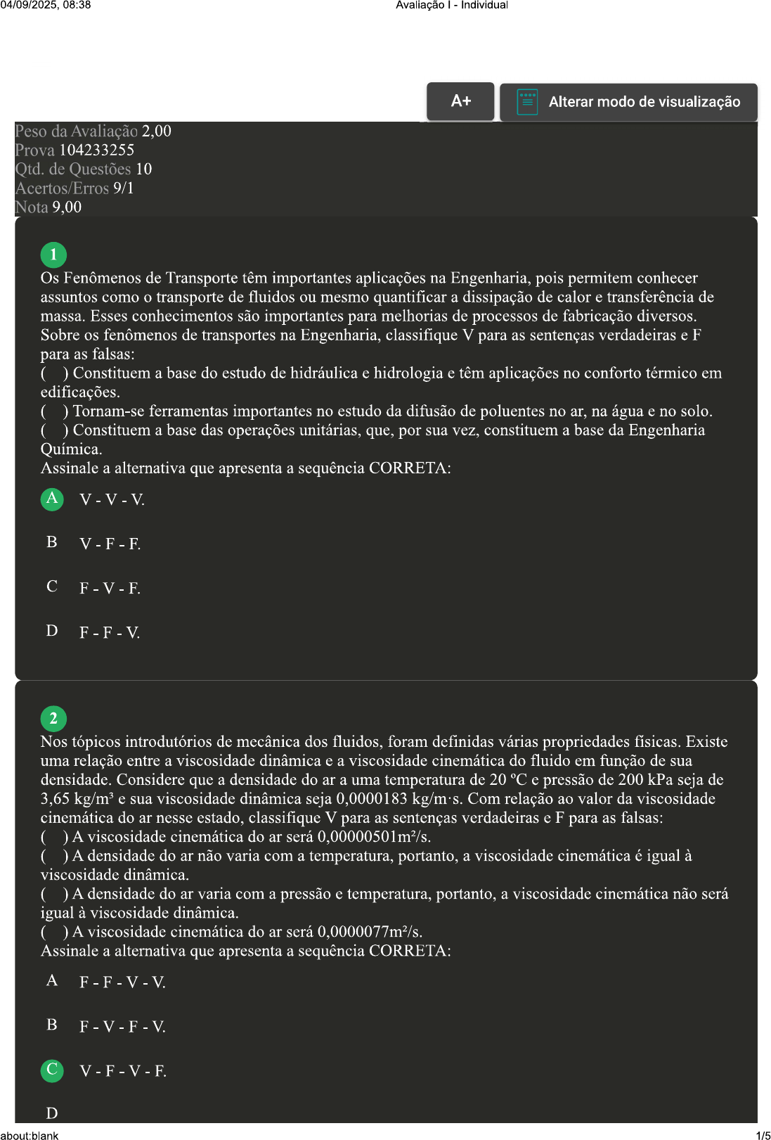 04/09/2025, 08:38 Avaliação - Individual A+ Alterar modo de visualização Peso da Avaliação 2,00 Prova 104233255 Qtd. de Questões 10 Acertos/Erros 9/1 Nota 9,00 1 Os Fenômenos de Transporte têm importantes aplicações na Engenharia, pois permitem conhecer assuntos como o transporte de fluidos ou mesmo quantificar a dissipação de calor e transferência de massa. Esses conhecimentos são importantes para melhorias de processos de fabricação diversos. Sobre os fenômenos de transportes na Engenharia, classifique V para as sentenças verdadeiras e F para as falsas: Constituem a base do estudo de hidráulica e hidrologia e têm aplicações no conforto térmico em edificações. ( ) Tornam-se ferramentas importantes no estudo da difusão de poluentes no ar, na água e no solo. ( ) Constituem a base das operações unitárias, que, por sua vez, constituem a base da Engenharia Química. Assinale a alternativa que apresenta a sequência CORRETA: A D 2 Nos tópicos introdutórios de mecânica dos fluidos, foram definidas várias propriedades físicas. Existe uma relação entre a viscosidade dinâmica e a viscosidade cinemática do fluido em função de sua densidade. Considere que a densidade do ar a uma temperatura de 20 °C e pressão de 200 kPa seja de 3,65 e sua viscosidade dinâmica seja 0,0000183 Com relação ao valor da viscosidade cinemática do ar nesse estado, classifique V para as sentenças verdadeiras e F para as falsas: A viscosidade cinemática do ar será 0,00000501m²/s. A densidade do ar não varia com a temperatura, portanto, a viscosidade cinemática é igual à viscosidade dinâmica. A densidade do ar varia com a pressão e temperatura, portanto, a viscosidade cinemática não será igual à viscosidade dinâmica. A viscosidade cinemática do ar será 0,0000077m²/s. Assinale a alternativa que apresenta a sequência CORRETA: A F-F-V-V. B F-V-F-V. V-F-V-F. D about:blank 1/504/09/2025, 08:38 Avaliação I - Individual V-V-F-F. 3 A cinemática dos fluidos estuda o comportamento de fluidos em escoamento. Seus fundamentos são importantes para acoplar o estudo de balanços de massa e energia que caracterizam a dinâmica dos fluidos. Sobre a classificação dos escoamentos, analise as sentenças a seguir: I- A classificação dos escoamentos depende da velocidade, mas também depende da forma como este ocorre. II- regime de escoamento depende das relações entre o diâmetro do duto, velocidade média de escoamento no duto, viscosidade do fluido e massa específica do fluido. III- A transferência de calor é mais eficiente no escoamento laminar que no escoamento turbulento. IV- A camada limite é a região onde o escoamento não é influenciado pela presença da superfície sólida com o qual está em contato o fluido. Assinale a alternativa CORRETA: A As sentenças II e IV estão corretas. As sentenças I e IV estão corretas. As sentenças I e II estão corretas. D As sentenças I, II e III estão corretas. 4 A viscosidade é uma propriedade intrínseca dos fluidos e pode ser usada para caracterizar os líquidos e gases, além de ser utilizada no projeto de sistemas de escoamentos de fluidos em tubulações. Com relação à viscosidade, classifique V para as sentenças verdadeiras e F para as falsas: A viscosidade está associada à resistência que o fluido oferece à deformação por cisalhamento, ou seja, corresponde ao atrito interno nos fluidos devido às interações intermoleculares, normalmente em função da temperatura. Os fluidos reais possuem viscosidade, em maior ou menor intensidade, de forma que, quando em escoamento com gradientes de velocidade, apresentam fenômenos de atrito viscoso. A viscosidade é causada fundamentalmente pela coesão intermolecular e pela transferência do momento linear através do fluido. A viscosidade é a propriedade do fluido que determina a velocidade com que os líquidos se moldam aos recipientes que os contêm. A água se molda rapidamente a um recipiente, enquanto que a glicerina possui um processo mais lento. A viscosidade da glicerina é muito maior que a da água, ou seja, a glicerina oferece uma resistência menor à deformação por cisalhamento. A viscosidade depende da temperatura, e verificam-se efeitos similares sobre a viscosidade de gases e de líquidos em função da variação da temperatura. As tensões cisalhantes e a viscosidade dependem da intensidade das forças de coesão intermoleculares, que diminuem com o acréscimo de temperatura, de maneira que a viscosidade dos líquidos diminui com o aumento da temperatura. Assinale a alternativa que apresenta a sequência CORRETA: A V-V-F-F-V. B F-V-V-F-F. V-F-F-V-V. about:blank 2/504/09/2025, 08:38 Avaliação I - Individual D F-F-V-V-F. Revisar Conteúdo do Livro 5 Com relação à viscosidade, os fluidos podem ser classificados em newtonianos e não newtonianos, dependendo do comportamento linear ou não linear no que diz respeito à relação entre a tensão de cisalhamento e o gradiente local de velocidade. Com relação às características dos fluidos newtonianos e não newtonianos, assinale a alternativa CORRETA: A Para um fluido não newtoniano, a relação entre a taxa de deformação e a tensão de cisalhamento é constante. B Os fluidos viscoelásticos, quando submetidos a uma tensão de cisalhamento, sofrem uma deformação; quando esta cessa, a deformação sofrida permanece. Os fluidos não newtonianos têm o comportamento totalmente dependente do tempo. D Um fluido que se comporta como newtoniano somente após uma tensão mínima ser excedida é denominado plástico de Bingham. 6 A unidade Poise (P) é frequentemente usada para expressar valores de viscosidade dinâmica de fluidos. Qual a sua relação com a unidade de viscosidade dinâmica no SI, que é o Pascal-segundo (Pa·s)? A 10 10 Pa·s. 10 0,1 Pa·s. D 7 Quando um fluido se move em relação a um sólido ou quando dois fluidos se movem um em relação ao outro, temos a influência d
