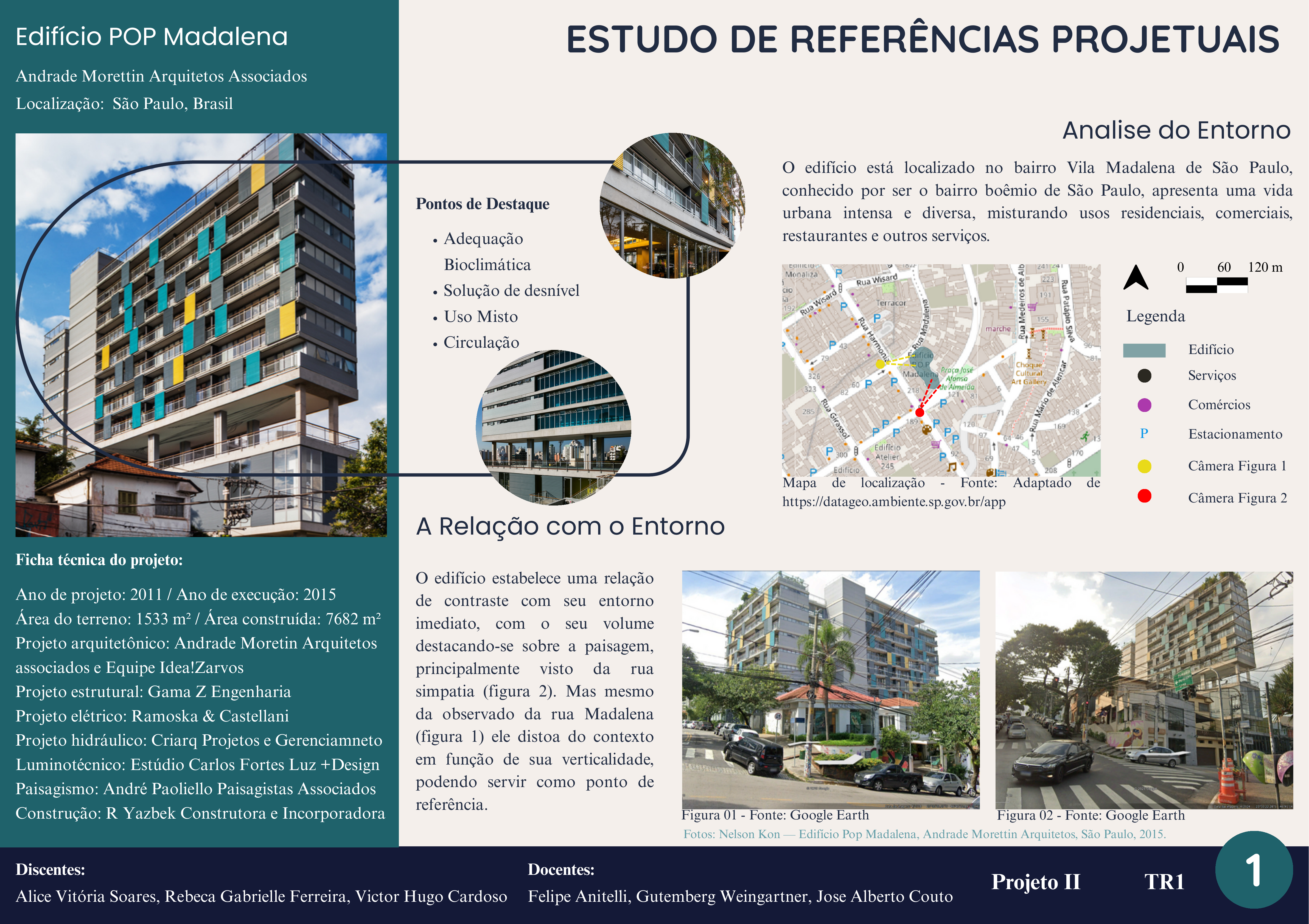 1 0 60 120 m Legenda Alice Vitória Soares, Rebeca Gabrielle Ferreira, Victor Hugo Cardoso Discentes: Felipe Anitelli, Gutemberg Weingartner, Jose Alberto Couto Docentes: TR1Projeto II ESTUDO DE REFERÊNCIAS PROJETUAIS Edifício POP Madalena Andrade Morettin Arquitetos Associados Localização: São Paulo, Brasil Pontos de Destaque Adequação Bioclimática Solução de desnível Uso Misto Circulação Ficha técnica do projeto: Ano de projeto: 2011 / Ano de execução: 2015 Área do terreno: 1533 m² / Área construída: 7682 m² Projeto arquitetônico: Andrade Moretin Arquitetos associados e Equipe Idea!Zarvos Projeto estrutural: Gama Z Engenharia Projeto elétrico: Ramoska & Castellani Projeto hidráulico: Criarq Projetos e Gerenciamneto Luminotécnico: Estúdio Carlos Fortes Luz +Design Paisagismo: André Paoliello Paisagistas Associados Construção: R Yazbek Construtora e Incorporadora Analise do Entorno O edifício está localizado no bairro Vila Madalena de São Paulo, conhecido por ser o bairro boêmio de São Paulo, apresenta uma vida urbana intensa e diversa, misturando usos residenciais, comerciais, restaurantes e outros serviços. A Relação com o Entorno Edifício Serviços Comércios P Estacionamento Câmera Figura 1 Câmera Figura 2 O edifício estabelece uma relação de contraste com seu entorno imediato, com o seu volume destacando-se sobre a paisagem, principalmente visto da rua simpatia (figura 2). Mas mesmo da observado da rua Madalena (figura 1) ele distoa do contexto em função de sua verticalidade, podendo servir como ponto de referência. Figura 01 - Fonte: Google Earth Figura 02 - Fonte: Google Earth Mapa de localização - Fonte: Adaptado de https://datageo.ambiente.sp.gov.br/app Fotos: Nelson Kon — Edifício Pop Madalena, Andrade Morettin Arquitetos, São Paulo, 2015. 2 Alice Vitória Soares, Rebeca Gabrielle Ferreira, Victor Hugo Cardoso Discentes: Felipe Anitelli, Gutemberg Weingartner, Jose Alberto Couto Docentes: TR1Projeto II R ua M ad al en a R ua d a Si m pa tia Rua Harmonia Sentido Via Trajetória solar LegendaAcesso principal Rua MadalenaRua Simpatia 18 m Legenda III III IV A Implantação Outra característica do terreno que foi incorporada ao projeto é o formato. Assim, a planta possui uma parte retangular e outra em L interligadas por uma forma irregular. Outra característica perceptível é a ocupação do edifício estar próxima ao centro do terreno, o que possibilita a inserção de áreas verdes em todos os lados da edificação. ESTUDO DE REFERÊNCIAS PROJETUAIS Edifício POP Madalena A Topografia Uma das particularidades dessa obra é que seu terreno possui uma diferença de nível de aproximadamente 18 metros e o projeto tirou partido disso, e assim, optou-se utilizar a cota mais alta (adjacente a rua Madalena) como nível térreo e assim, o programa foi dividido em mais 3 pavimentos inferiores e 7 pavimentos superiores. A solução adotada possibilita a valorização das vistas, elevando o observador em relação ao entorno, mas ao mesmo tempo faz com que o volume avance abruptamente sobre a paisagem na visão do pedestre A Concepção da Forma A forma predominante do edifício é o retângulo, derivado de um paralelepípedo em L (I). Para resolver o desnível do terreno, adotou-se uma solução que poderia causar grande impacto na paisagem; para suavizá-lo, a volumetria foi fragmentada em dois blocos sobrepostos (II), dividindo o programa entre eles. Os blocos foram conectados por pilotis (III), o que garante permeabilidade visual, trazendo leveza pro conjunto,além de criar, no térreo, a possibilidade de um mirante. Por fim, foi adicionado um terceiro volume, atravessando os dois blocos: a circulação vertical (IV), que, assim como os pilotis, articula as partes do conjunto. Andrade Morettin Arquitetos Associados Forma simplificada Cheios e Vazios na Planta Cheios Vazios Legenda Circulação vertical Forma simplificada Fotos: Nelson Kon — Edifício Pop Madalena, Andrade Morettin Arquitetos, São Paulo, 2015. Desenhos: ANDRADE MORETTIN ARQUITETOS ASSOCIADOS. Edifício Pop Madalena. São Paulo – SP, 2011-2015./ Adaptado por: Victor Hugo Cardoso Cultural Center & Youth Hostel Grid estrutural Legenda Grid estrutural Legenda 3 Foto s: N els on K on — E di fíc io Pop Madalena, Andrade Morettin Arquitetos, São Paulo, 2015. Alice Vitória Soares, Rebeca Gabrielle Ferreira, Victor Hugo Cardoso Discentes: Felipe Anitelli, Gutemberg Weingartner, Jose Alberto Couto Docentes: TR1Projeto II ESTUDO DE REFERÊNCIAS PROJETUAIS Solução Estrutural O projeto adota o tradicional sistema de pilar e viga, partindo de um grid simples e racional que permite uma ocupação livre, refletindo na flexibilidade de uso dos espaços internos ( o edifício conta com 11 plantas de apartamento). A laje maciça é liberada nas bordas, de tal modo que o elemento estrutural mais marcante na volumetria é ela, sendo o plano horizontal que empilhado é a matriz de composição. Materialidade Tectonicidade Edifício POP Madalena Andrade Morettin Arquitetos Associados A projeto apresenta um alto grau de tectonicidade, uma vez que os principais elementos estruturantes (laje e pilar) não só estão aparentes em suas fachadas não sendo escondidos por revestimentos, como contribuem para a caracterização da forma adotada no edifício. O edifício utiliza como materiais o concreto armado para a sua estrutura, a partir disso a construção seguiu um sistema de montagem seca, utilizando amplamente materiais pré-fabricados e industrializados como caixaria de vidro, painéis de telhas metálicas termo acústicas. Esquadrias em alumínio. Brises deslizantes com requadro em tubo de alumínio e fechamento em tela ondulada perfurada. Desenhos: ANDRADE MORETTIN ARQUITETOS ASSOCIADOS. Edifício Pop Madalena. São Paulo – SP, 2011-2015./ Adaptado por: Victor Hugo Cardoso Estrutura + algumas vedações já marcavam a forma final 4 Alice Vitória Soares, Rebeca Gabrielle