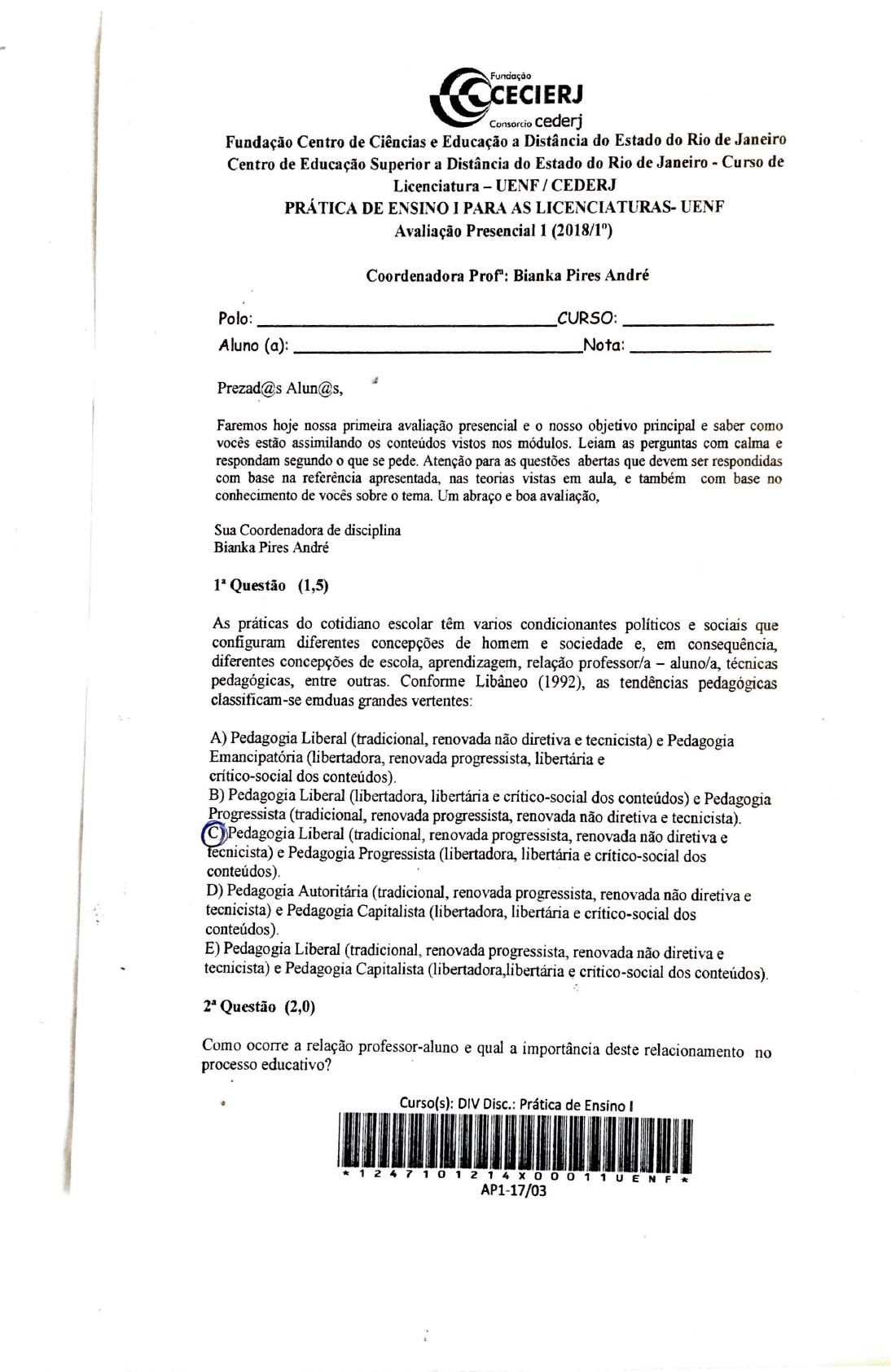 Fundação CECIERJ Consorcio cederj Fundação Centro de Ciências e Educação a Distância do Estado do Rio de Janeiro Centro de Educação Superior a Distância do Estado do Rio de Janeiro Curso de Licenciatura UENF / CEDERJ PRÁTICA DE ENSINO I PARA AS LICENCIATURAS- UENF Avaliação Presencial 1 (2018/1°) Coordenadora Prof: Bianka Pires André Polo: CURSO: Aluno (a): Nota: Prezad@s Alun@s, Faremos hoje nossa primeira avaliação presencial e 0 nosso objetivo principal e saber como vocês estão assimilando os conteúdos vistos nos módulos. Leiam as perguntas com calma e respondam segundo que se pede. Atenção para as questões abertas que devem ser respondidas com base na referência apresentada, nas teorias vistas em aula, e também com base no conhecimento de vocês sobre tema. Um abraço e boa avaliação, Sua Coordenadora de disciplina Bianka Pires André Questão (1,5) As práticas do cotidiano escolar têm varios condicionantes políticos e sociais que configuram diferentes concepções de homem e sociedade e, em consequência, diferentes concepções de escola, aprendizagem, relação professor/a aluno/a, técnicas pedagógicas, entre outras. Conforme Libâneo (1992), as tendências pedagógicas classificam-se emduas grandes vertentes: A) Pedagogia Liberal (tradicional, renovada não diretiva e tecnicista) e Pedagogia Emancipatória (libertadora, renovada progressista, libertária e crítico-social dos conteúdos). B) Pedagogia Liberal (libertadora, libertária e dos conteúdos) e Pedagogia Progressista (tradicional, renovada progressista, renovada não diretiva e tecnicista). C Pedagogia Liberal (tradicional, renovada progressista, renovada não diretiva e tecnicista) e Pedagogia Progressista (libertadora, libertária e dos conteúdos). D) Pedagogia Autoritária (tradicional, renovada progressista, renovada não diretiva e tecnicista) e Pedagogia Capitalista (libertadora, libertária e dos conteúdos). E) Pedagogia Liberal (tradicional, renovada progressista, renovada não diretiva e tecnicista) e Pedagogia Capitalista (libertadora, libertária e critico-social dos conteúdos). Questão (2,0) Como ocorre a relação professor-aluno e qual a importância deste relacionamento no processo educativo? Curso(s): DIV Disc.: Prática de Ensino I * 1 2 4 7 1 1 2 1 4 0 0 0 1 1 U E N F * AP1-17/03