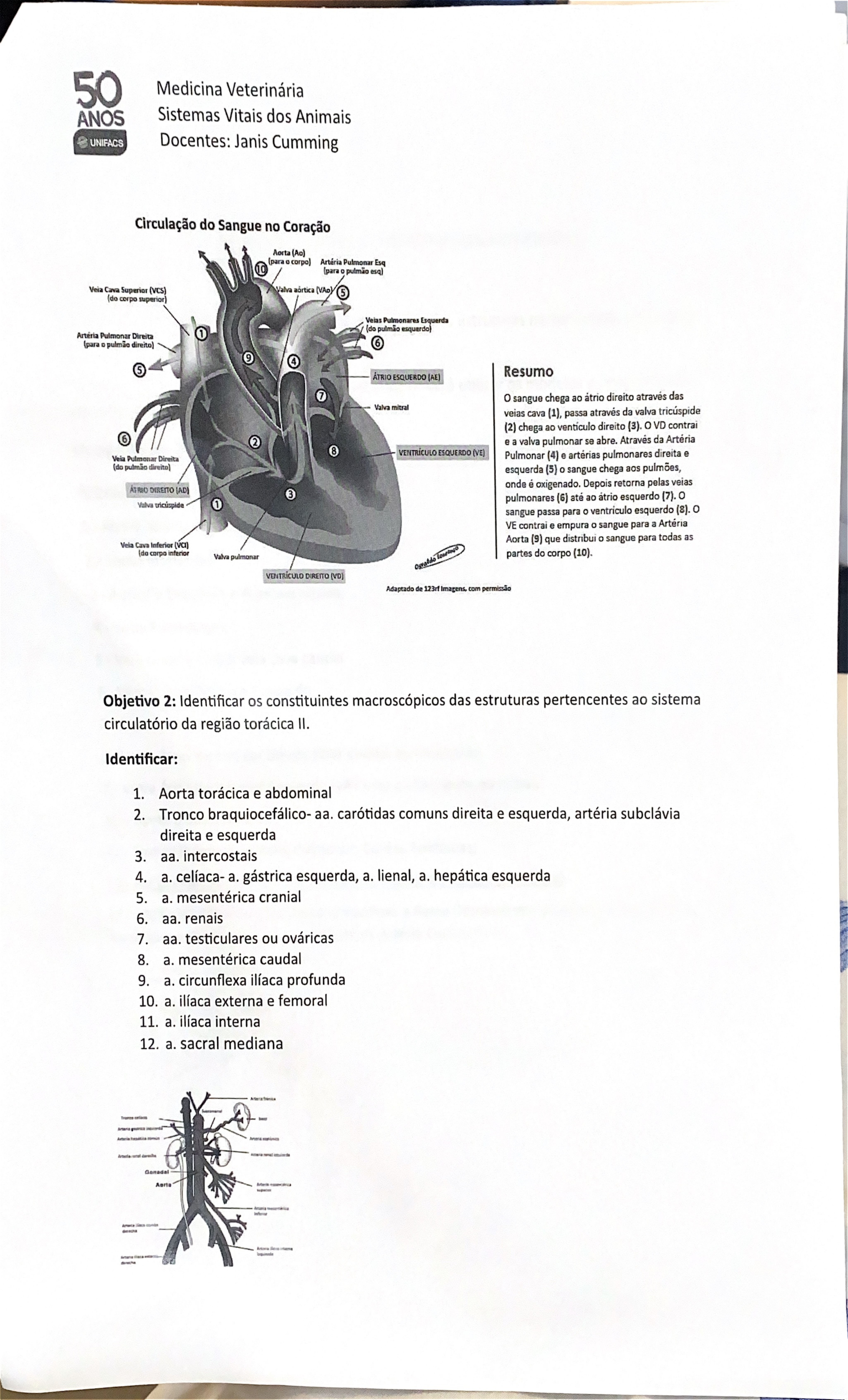 50 Medicina Veterinária ANOS Sistemas Vitais dos Animais UNIFACS Docentes: Janis Cumming Circulação do Sangue no Coração Aorta (Ao) (para corpo) Artéria Pulmonar Esq 10 (para pulmão esq) Veia Cava Superior (VCS) Valva aórtica (VAo) 5 (do corpo superior) Pulmonares Esquerda Artéria Pulmonar Direita 1 (do pulmão esquerdo) (para pulmão direito) 6 9 4 5 Resumo ÁTRIO ESQUERDO (AE) 7 o sangue chega ao átrio direito através das Valva mitral veias cava (1), passa através da valva tricúspide (2) chega ao direito (3). o VD contrai 6 2 e a valva pulmonar se abre. Através da Artéria 8 VENTRÍCULO ESQUERDO (VE) Veia Pulmonar Direita Pulmonar (4) e artérias pulmonares direita e (do pulmão direito) esquerda (5) o sangue chega aos pulmões, onde é oxigenado. Depois retorna pelas veias DIREITO 3 pulmonares (6) até ao átrio esquerdo (7). Valva 1 sangue passa para ventriculo esquerdo (8). VE contrai e empura o sangue para a Artéria Aorta (9) que distribui sangue para todas as Vela Cava Inferior (do corpo inferior Valva pulmonar partes do corpo (10). VENTRÍCULO DIREITO (VD) Adaptado de 123rf Imagens, com permissão Objetivo 2: Identificar os constituintes macroscópicos das estruturas pertencentes ao sistema circulatório da região torácica II. Identificar: 1. Aorta torácica e abdominal 2. Tronco braquiocefálico- aa. carótidas comuns direita e esquerda, artéria subclávia direita e esquerda 3. aa. intercostais 4. a. celíaca- a. gástrica esquerda, a. lienal, a. hepática esquerda 5. a. mesentérica cranial 6. aa. renais 7. aa. testiculares ou ováricas 8. a. mesentérica caudal 9. a. circunflexa ilíaca profunda 10. a. ilíaca externa e femoral 11. a. ilíaca interna 12. a. sacral mediana