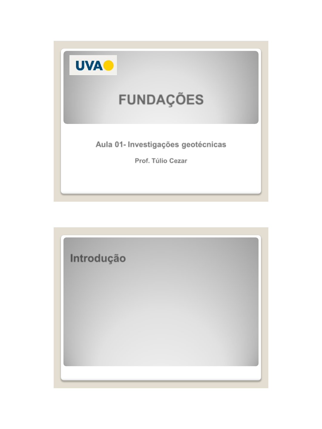 26/02/2016 1 FUNDAÇÕES Aula 01- Investigações geotécnicas Prof. Túlio Cezar Cabo Frio, 2016 UNIVERSIDADE VEIGA DE ALMEIDA – UVA DEPARTAMENTO D ENGENHARIA CIVIL Introdução Conhecimento adequado do solo Identificação e entendimento do seu comportamento; Ensaios “in situ” Ensaios de laboratório ( casos especiais) 26/02/2016 2 Reconhecimento inicial NBR 6122:2010 Ensaios mais comuns 26/02/2016 3 Ensaio de SPT Ensaio mais comum no processo de investigação; Ensaio in situ; Tipologia do solo em cada metro perfurado; Resistência N do solo à cravação do amostrador padrão; Posição do nível d´agua. Procedimento descrito pela NBR 6484 Ensaio de SPT Procedimento: Amostrador de 65 kg, em queda livre, numa altura de 75 cm; Determina-se em planta a posição dos furos ( projeção da lâmina da edificação, por exemplo); Experiência dos profissionais envolvidos 26/02/2016 4 Ensaio de SPT Montagem de cavalete com um conjunto de roldanas, por onde passa uma corda ligada ao martelo; Escavação prévia da superfície do terreno- Ponto “zero”; Recolhe-se este material – Amostra “zero”; Posteriormente, posiciona-se o amostrador e o martelo e deixa-o cair, na altura de 75 cm; Este procedimento é realizado até a penetração de 45 cm do amostrador padrão no solo; Conta –se o número de quedas do martelo para a cravação de cada 15 cm do total de 45 cm. Ensaio de SPT A soma do número de golpes necessários para a penetração dos últimos 30 cm do amostrador é designada por N; Na retirada do amostrador, o material retirado é acondicionado para classificação; O ensaio é prosseguido com a perfuração do próximo metro a ser analisado; É primordial a identificação da profundidade do nível d´agua, quando encontrada. 26/02/2016 5 Ensaio de SPT Ensaio de SPT 26/02/2016 6 Ensaio de SPT - T Medir o torque após a execução do SPT; Torquímetro – 50 kgfxm Anota-se o torque máximo obtido; Operação repetida a cada metro; Relação Tx N; Conceito de N equivalente ( Neq) Neq = 1,2; Menos suscetíveis de sofrerem com a estrutura do solo Vantagens: Identificação de pedregulhos intercalados; Presença de solos colapsíveis. Ensaio de penetração de cone - CPT Ensaio de penetração estática ( Ensaio Holandês”; Procedimento Crava-se um cone,numa velocidade 1cm/s; Registra-se as cargas obtidas para a penetração; Anota-se, inicialmente, a resistência de ponta; Posteriormente, o atrito lateral; Rapidez, confiabilidade e volume de dados obtidos; 26/02/2016 7 Ensaio de penetração de cone - CPT Parâmetros geotécnicos; Correlação com o comportamento de estacas; Estrutura do solo ( estratigrafia) Ensaio de Piezocone - CPTU Medição simultânea da resistência de ponta, poropressão e atrito lateral; Variação da posição da medição da poropressão; Pouco empregado no Brasil Utilização em investigações Offshore. 26/02/2016 8 Ensaio de Piezocone - CPTU Estratigrafia dos solos; Parâmetros geotécnicos Areias Ensaio de Piezocone - CPTU Argilas 26/02/2016 9 Ensaio de Piezocone - CPTU Ensaio de Palheta ( Vane test) caracterizar argilas moles Resistência não drenada do material é obtida por meio da ruptura se dá na superfície do cilindro É utilizado um torquímetro para a medição do momento aplicado 26/02/2016 10 Ensaio de Placa Ensaio de carregamento de placa – Prova de carga; Deformabilidade do solo; Utilização de placas circulares de 80 cm de diâmetro de ferro fundido ou quadradas com 80 cm de lado; Ruptura convencional :Carga correspondente a uma deformação de 10% do diâmetro ou lado; São medidos os recalques em 1,2,4,8,15 , 30 min ou até que haja estabilização; Obtêm-se o Módulo de Elasticidade do Solo