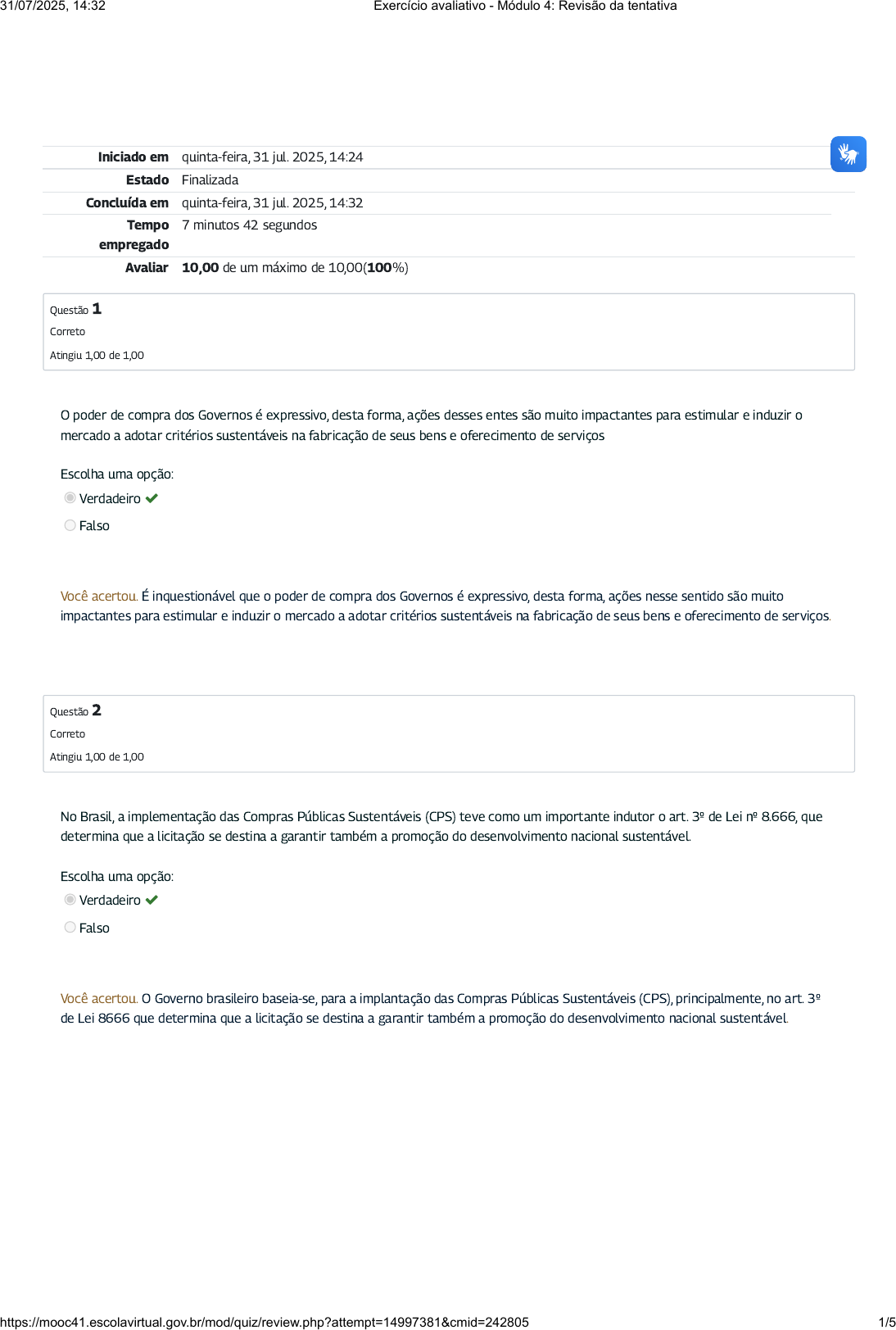 Iniciado em quinta-feira, 31 jul. 2025, 14:24 Estado Finalizada Concluída em quinta-feira, 31 jul. 2025, 14:32 Tempo empregado 7 minutos 42 segundos Avaliar 10,00 de um máximo de 10,00(100%) Questão 1 Correto Atingiu 1,00 de 1,00 Questão 2 Correto Atingiu 1,00 de 1,00 O poder de compra dos Governos é expressivo, desta forma, ações desses entes são muito impactantes para estimular e induzir o mercado a adotar critérios sustentáveis na fabricação de seus bens e oferecimento de serviços Escolha uma opção: Verdadeiro Falso Você acertou. É inquestionável que o poder de compra dos Governos é expressivo, desta forma, ações nesse sentido são muito impactantes para estimular e induzir o mercado a adotar critérios sustentáveis na fabricação de seus bens e oferecimento de serviços. No Brasil, a implementação das Compras Públicas Sustentáveis (CPS) teve como um importante indutor o art. 3º de Lei nº 8.666, que determina que a licitação se destina a garantir também a promoção do desenvolvimento nacional sustentável. Escolha uma opção: Verdadeiro Falso Você acertou. O Governo brasileiro baseia-se, para a implantação das Compras Públicas Sustentáveis (CPS), principalmente, no art. 3º de Lei 8666 que determina que a licitação se destina a garantir também a promoção do desenvolvimento nacional sustentável. 31/07/2025, 14:32 Exercício avaliativo - Módulo 4: Revisão da tentativa https://mooc41.escolavirtual.gov.br/mod/quiz/review.php?attempt=14997381&cmid=242805 1/5 Questão 3 Correto Atingiu 1,00 de 1,00 Questão 4 Correto Atingiu 1,00 de 1,00 Questão 5 Correto Atingiu 1,00 de 1,00 Compras sustentáveis consistem naquelas em que se priorizam produtos apenas devido a seu aspecto ambiental, desconsiderando aspectos tradicionais, como especificações técnicas e preço. Escolha uma opção: Verdadeiro Falso Você acertou. Compras sustentáveis não se trata de priorizar produtos apenas devido a seu aspecto ambiental, mas sim considerar seriamente tal aspecto juntamente com os tradicionais critérios de especificações técnicas e preço. A Lei Federal nº 14.133/21, denominada de nova Lei de Licitações e Contratos Administrativos, que veio para substituir a Lei nº 8.666/1993, trouxe consigo toda uma sistemática que se pauta na lógica da sustentabilidade ambiental. Escolha uma opção: Verdadeiro Falso Você acertou. De fato, a Lei nº 14.133/21, denominada de nova Lei de Licitações e Contratos Administrativos, que veio para substituir a Lei 8.666/1993, ao contrário do normativo anterior, trouxe consigo toda uma sistemática que se pauta na lógica da sustentabilidade ambiental. As regras da Instrução Normativa para a contratação de serviços não exigem das empresas contratadas que adotem medidas para evitar o desperdício de água tratada, conforme instituído no Decreto nº 48.138, de 8 de outubro de 2003. Escolha uma opção: Verdadeiro Falso Você acertou. As regras da Instrução Normativa para a contratação de serviços exigem das empresas contratadas adotem medidas para evitar o desperdício de água tratada, conforme instituído no Decreto nº 48.138, de 8 de outubro de 2003. 31/07/2025, 14:32 Exercício avaliativo - Módulo 4: Revisão da tentativa https://mooc41.escolavirtual.gov.br/mod/quiz/review.php?attempt=14997381&cmid=242805 2/5 Questão 6 Correto Atingiu 1,00 de 1,00 Questão 7 Correto Atingiu 1,00 de 1,00 O Acórdão nº 1.056/17 é um importante normativo sobre o tema sustentabilidade. Foi prolatado tendo em vista auditoria operacional realizada com objetivo de avaliar em que medida as ações promovidas pela administração pública federal, nas áreas de redução de consumo próprio de papel, de energia elétrica e de água, evoluíram em relação aos parâmetros suscitados pelo Acórdão nº 1.752/2011. Escolha uma opção: Verdadeiro Falso Você acertou. O Acórdão TCU-Plenário 1056/2017 foi prolatado tendo em vista auditoria operacional realizada com objetivo de avaliar em que medida as ações promovidas pela administração pública federal, nas áreas de redução de consumo próprio de papel, de energia elétrica e de água, evoluíram em relação aos parâmetros suscitados pelo Acórdão nº 1.752/2011. Um dos eixos utilizados pelo IASA para avaliar a sustentabilidade na APF é a racionalização no uso de energia elétrica. Escolha uma opção: Verdadeiro Falso Você acertou. Os onze eixos temáticos da sustentabilidade avaliados pelo IASA são: I. Elaboração, implementação e monitoramento do Plano de Gestão de Logística Sustentável (PLS); II. Racionalização no uso de energia elétrica; III. Racionalização no uso de água; IV. Atendimento a requisitos de acessibilidade; V. Certificação de prédios públicos; VI. Racionalização no uso de papel e implementação de processo eletrônico; VII. Gestão de resíduos e coleta seletiva; VIII. Contratações públicas sustentáveis; IX. Mobilidade e gases de efeito estufa; X. Conscientização e capacitação; e XI. Adesão a programas de sustentabilidade. 31/07/2025, 14:32 Exercício avaliativo - Módulo 4: Revisão da tentativa https://mooc41.escolavirtual.gov.br/mod/quiz/review.php?attempt=14997381&cmid=242805 3/5 Questão 8 Correto Atingiu 1,00 de 1,00 Questão 9 Correto Atingiu 1,00 de 1,00 Questão 10 Correto Atingiu 1,00 de 1,00 Os dados utilizados para a construção do IASA foram levantados por meio de questionário eletrônico enviado a órgãos da Administração Pública Federal, cujo grau de adesão alcançou 60%. Escolha uma opção: Verdadeiro Falso Você acertou. Os dados utilizados para a construção do IASA foram levantados por meio de questionário eletrônico enviado a 169 órgãos da Administração Pública Federal, cujo grau de adesão alcançou 60% (resposta de 101 órgãos e entidades). Dos onze eixos temáticos, utilizados para a construção do IASA, os indicadores com pior pontuação foram os relativos às práticas 