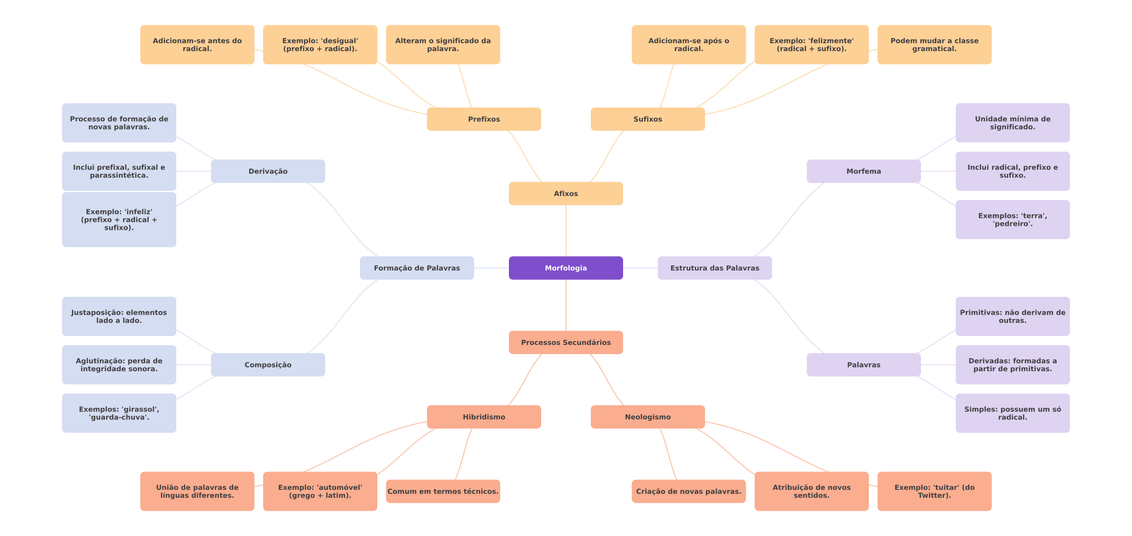 Adicionam-se antes do Exemplo: 'desigual' Alteram significado da Adicionam-se após Exemplo: 'felizmente' Podem mudar a classe radical. (prefixo + radical). palavra. radical. (radical + sufixo). gramatical. Processo de formação de Prefixos Sufixos Unidade mínima de novas palavras. significado. Inclui prefixal, sufixal e Derivação Morfema Inclui radical, prefixo e parassintética. sufixo. Afixos Exemplo: 'infeliz' (prefixo + radical + Exemplos: 'terra', sufixo). Formação de Palavras Morfologia Estrutura das Palavras Justaposição: elementos Primitivas: não derivam de lado a lado. outras. Processos Secundários Aglutinação: perda de Derivadas: formadas a integridade sonora. Composição Palavras partir de primitivas. Exemplos: 'girassol', Simples: possuem um só 'guarda-chuva'. Hibridismo Neologismo radical. União de palavras de Exemplo: 'automóvel' Atribuição de novos Comum em termos técnicos. línguas diferentes. (grego + latim). Criação de novas palavras. Exemplo: 'tuitar' (do sentidos. Twitter).