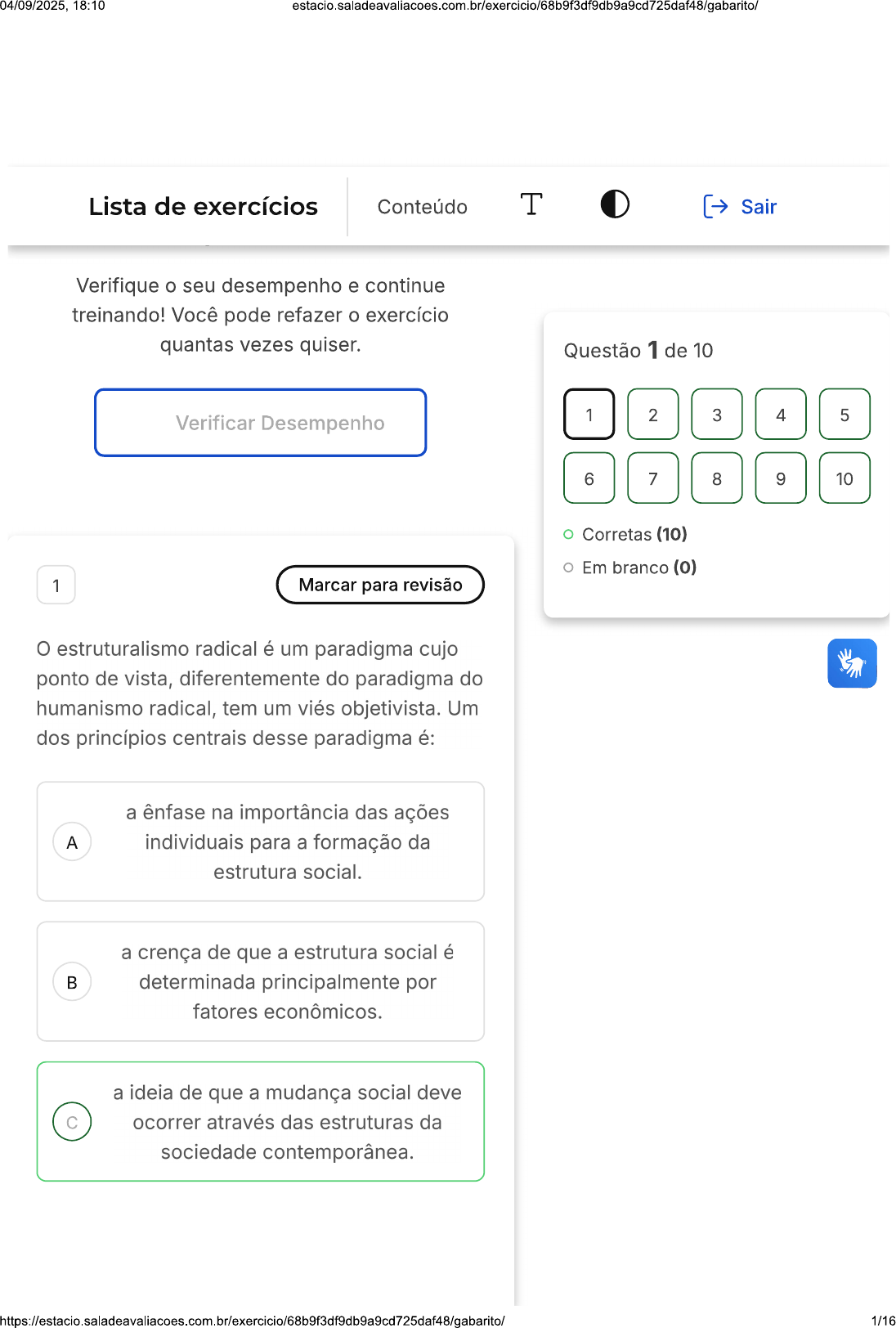 04/09/2025, 18:10 estacio.saladeavaliacoes.com.br/exercicio/68b9f3df9db9a9cd725daf48/gabarito Lista de exercícios Conteúdo T Sair Verifique seu desempenho e continue treinando! Você pode refazer exercício quantas vezes quiser. Questão 1 de 10 Verificar Desempenho 1 2 3 4 5 6 7 8 9 10 Corretas (10) Em branco (0) 1 Marcar para revisão estruturalismo radical é um paradigma cujo ponto de vista, diferentemente do paradigma do humanismo radical, tem um viés objetivista. Um dos princípios centrais desse paradigma é: a ênfase na importância das ações A individuais para a formação da estrutura social. a crença de que a estrutura social é determinada principalmente por fatores econômicos. a ideia de que a mudança social deve c ocorrer através das estruturas da sociedade contemporânea. 1/1604/09/2025, 18:10 estacio.saladeavaliacoes.com.br/exercicio/68b9f3df9db9a9cd725daf48/gabarito/ a concepção de que as instituições D sociais são essencialmente disfuncionais e devem ser eliminadas. a perspectiva de que a mudança E social é alcançada por meio de revoluções políticas radicais. Resposta correta Parabéns, você selecionou a alternativa correta. Confira gabarito comentado! Gabarito Comentado No paradigma do estruturalismo radical, os pensadores defendem a sociologia da mudança radical sob ponto de vista objetivista. Embora esse paradigma possua muitas similaridades com a teoria funcionalista, este é dirigido para fins fundamentalmente distintos. estruturalismo radical busca, como diz o próprio nome, a mudança radical, a autonomia e a potencialidade. E dá ênfase no conflito estrutural, nos tipos de autoridade, na contradição e na privação do ponto de vista realista, positivista, determinista e nomotético. Enquanto paradigma do humanismo radical manipula sua perspectiva como foco na consciência, o estruturalismo radical se concentra nas relações estruturais dentro de um mundo social real. Posto de outro modo, os estruturalistas enfatizam que a mudança radical é construída na verdadeira natureza e estrutura da sociedade contemporânea. E ainda buscam prover explanações das https://estacio.saladeavaliacoes.com.br/exercicio/68b9f3df9db9a9cd725daf48/gabarito/ 2/1604/09/2025, 18:10 inter-relações básicas dentro do contexto total das formações sociais. 2 Marcar para revisão Os quatro paradigmas de Burrell e Morgan representam diferentes lentes ou cosmovisões de aproximação com a realidade. Avalie as assertivas abaixo: I. humanista radical é baseado na suposição de que a sociedade tem existência concreta e real, tendo um caráter sistêmico orientado para produzir um sistema social ordenado e regulado. II. interpretativista é baseado na visão de que o mundo social possui uma situação ontológica duvidosa e de que a realidade social não existe em qualquer sentido concreto, mas é um produto da experiência subjetiva e intersubjetiva dos indivíduos. III. funcionalista vincula sua análise ao interesse no que pode ser descrito como patologia da consciência, por meio da qual os seres humanos se tornam aprisionados nos limites de realidade que eles mesmos criam e sustentam. IV. estruturalista radical é preocupado em entender as tensões intrínsecas e o modo como os que possuem o poder na sociedade procuram se manter nessa posição por meio de diversos modos de dominação. É (são) correta(s): https://estacio.saladeavaliacoes.com.br/exercicio/68b9f3df9db9a9cd725daf48/gabarito/ 3/1604/09/2025, 18:10 estacio.saladeavaliacoes.com.br/exercicio/68b9f3df9db9a9cd725daf48/gabarito/ A I, e III, apenas I, III e IV, apenas c e II, apenas. D e IV, apenas. E II, III e IV, apenas Resposta correta Parabéns, você selecionou a alternativa correta. Confira gabarito comentado! Gabarito Comentado As assertivas e IV estão corretas. A assertiva descreve corretamente paradigma interpretativista, que entende a realidade social como um produto da experiência subjetiva e intersubjetiva dos indivíduos. A assertiva IV, por sua vez, descreve corretamente paradigma estruturalista radical, que se preocupa em entender as tensões intrínsecas na sociedade e como os detentores de poder buscam manter sua posição através de diferentes formas de dominação. 3 Marcar para revisão Avalie as seguintes afirmativas: 4/1604/09/2025, 18:10 I. Os termos regulação e mudança radical sugeridas por Burrell e Morgan (1979), estão relacionados com os termos ordem e conflito, respectivamente. II. A desintegração, a coerção, os conflitos estruturais e questionamento aos modos de autoridade e poder estão relacionados à dimensão da mudança radical. III. A dimensão da regulação social está interessada com a emancipação do homem daquilo que limita seu potencial de desenvolvimento. IV. A dimensão da mudança radical está interessada na necessidade de entender por que a sociedade não desmoronou até hoje. É (são) correta(s): A I, e III, apenas I, III e IV, apenas c le II, apenas. D e IV, apenas. E II, III e IV, apenas Resposta correta Parabéns, você selecionou a alternativa correta. Confira gabarito comentado! Gabarito Comentado As afirmativas e são as únicas corretas. A afirmativa I está correta porque os termos regulação e mudança radical, 5/1604/09/2025, 18:10 estacio.saladeavaliacoes.com.br/exercicio/68b9f3df9db9a9cd725daf48/gabarito sugeridos por Burrell e Morgan (1979), realmente se relacionam com os termos ordem e conflito, respectivamente. A afirmativa também está correta, pois a desintegração, a coerção, os conflitos estruturais e questionamento aos modos de autoridade e poder estão, de fato, relacionados à dimensão da mudança radical. As afirmativas III e IV, por outro lado, não estão corretas. A dimensão da regulação social não está necessariamente interessada na emancipação do homem daquilo que limita seu potencial de desenvolvimento (afirmativa III) e a dimensão da mudança radical não está focada na necessidade de entende