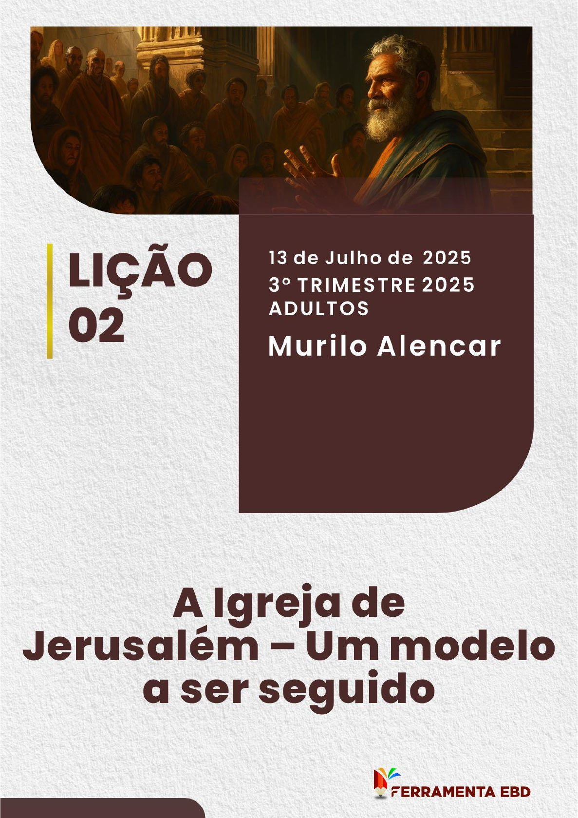 Murilo Alencar | FERRAMENTA EBD ________________________________________________________________________________________________ Conheça a FERRAMENTA EBD. Tudo para o professor da Escola Dominical em um só lugar Conheça o curso para pregadores iniciantes: O Pregador e a Pregação Murilo Alencar | FERRAMENTA EBD ________________________________________________________________________________________________ Conheça a FERRAMENTA EBD. Tudo para o professor da Escola Dominical em um só lugar Esboço Da Lição 02 Do 3º Trimestre De 2025 Por Murilo Alencar DIREITOS AUTORAIS Este subsídio está protegido por leis de direitos autorais. Todos os direitos sobre o subsídio são reservados. Você não tem permissão para alterar ou vender este subsídio. Nem tem permissão para copiar/reproduzir o conteúdo do subsídio em sites, blogs ou jornais. Qualquer tipo de violação dos direitos autorais estará sujeita a ações legais. SOBRE O ABRA A JAULA O Abra a Jaula é um projeto de pregação, evangelismo e ensino da palavra de Deus. O abrir a jaula pode ser comparado com a ordenança máxima dada a igreja por Jesus "Ide por todo mundo e pregai o evangelho a toda criatura". Spurgeon disse que o evangelho é como um leão faminto que está enjaulado, de modo que nosso papel não é salvar ninguém, mas abrir a jaula e deixar que o Leão saia e consuma os corações! Nesse sentido, nos colocamos a disposição, principalmente de Deus, para promover um conteúdo bíblico e pentecostal. No acervo de vídeos do Abra a Jaula, temos pregações curtas, reflexões bíblicas, pré-aula da Escola Dominical, dicas de pregação com O Pregador e a Pregação e o personagem da bíblia, além de vários projetos que ainda estão para serem colocados em prática, pois estamos em constante crescimento. É um privilégio muito grande contribuir com seu ministério. Nós gostaríamos de te conhecer melhor e estar mais próximo de você. Faça parte da nossa família, é só clicar nos botões. Site Canal Instagram Facebook Twitter (87) 99808-9816 https://www.abraajaula.com/ https://www.youtube.com/c/AbraaJaula?sub_confirmation=1 https://www.instagram.com/abraajaula https://www.facebook.com/abraAjaula https://twitter.com/abra_jaula Murilo Alencar | FERRAMENTA EBD ________________________________________________________________________________________________ Conheça a FERRAMENTA EBD. Tudo para o professor da Escola Dominical em um só lugar A IGREJA EM JERUSALÉM Doutrina, Comunhão e Fé: A Base para o Crescimento da Igreja em meio às Perseguições Domingo, 13 de julho 2025 A IGREJA DE JERUSALÉM: UM MODELO A SER SEGUIDO A Igreja de Jerusalém ocupa lugar central na narrativa de Atos dos Apóstolos, sendo considerada o berço histórico do cristianismo. Sua origem, marcada pela descida do Espírito Santo no Pentecostes, revela uma comunidade fundamentada na doutrina dos apóstolos, na comunhão fraterna, na observação das ordenanças e na vida de oração. O relato de Atos 2.37–47 fornece uma descrição rica de seus valores, práticas e impacto no mundo. Este estudo propõe examinar os pilares teológicos e eclesiológicos dessa igreja, a fim de extrair lições relevantes para a vida da igreja contemporânea e para a espiritualidade cristã autêntica. TEXTO PRINCIPAL Todos se dedicavam de coração ao ensino dos apóstolos, à comunhão, ao partir do pão e à oração. (At 2.42 NVT). Tomando como referência o contexto imediato, Keener (2022) sugere que Lucas usa uma figura de linguagem conhecida como quiasmo na seção de Atos 2.41–47. A estrutura quiástica (ou quiasmo) é uma forma literária usada na Bíblia (em narrativas, poesia e discursos) para organizar ideias em forma de espelho, ou seja, de maneira simétrica. Os elementos são apresentados em uma ordem (por exemplo: A – B – C) e depois retomados em ordem inversa (C’ – B’ – A’), formando um padrão “cruzado” (daí o termo quiasmo, do grego chiasma, cruzamento). A organização das ideias presentes na perícope supramencionada ficam assim: A Evangelização eficaz (pela pregação, At 2.41). B Adoração e refeições compartilhadas (At 2.42). C Bens compartilhados (At 2.44,45). B Adoração e refeições compartilhadas (At 2.46). A Evangelização eficaz (pelo estilo de vida, At 2.47). Essa estrutura, segundo Keener, mostra como Lucas enfatiza tanto o crescimento externo da igreja (A–A’) quanto sua vida interna de comunhão, ensino e espiritualidade (B–B’, C), evidenciando o equilíbrio entre missão, doutrina e vida comunitária no modelo da igreja primitiva. VERDADE PRÁTICA A igreja de Jerusalém, como igreja-mãe, tornou-se exemplo para as demais. Um modelo a ser seguido por todas as igrejas verdadeiramente bíblicas. Murilo Alencar | FERRAMENTA EBD ________________________________________________________________________________________________ Conheça a FERRAMENTA EBD. Tudo para o professor da Escola Dominical em um só lugar A Igreja de Jerusalém serve como modelo, não por estar isenta de falhas, mas por ter sido a primeira igreja a viver sob o impacto direto do Pentecostes, manifestando elementos fundamentais da fé cristã: doutrina apostólica, comunhão fraterna, vida de oração e testemunho evangelístico (At 2.42–47). A autoridade do exemplo da igreja-mãe está no fato de ter sido edificada pela pregação apostólica e de ser cheia do Espírito Santo. Ainda assim, era uma igreja composta por pessoas humanas, sujeitas a erros e limitações (At 5.1–11; 6.1–7). Embora exemplar, não era perfeita. Em Atos 5, a hipocrisia de Ananias e Safira revela o perigo do pecado oculto dentro da igreja (At 5.1–11). Em Atos 6, surge a primeira crise administrativa, quando os helenistas reclamam da negligência no cuidado das viúvas, apontando uma tensão étnica e estrutural (At 6.1). Em Atos 11, os líderes de Jerusalém demonstram resistência ao aceitar a inclusão dos gentios, evidenciando uma 