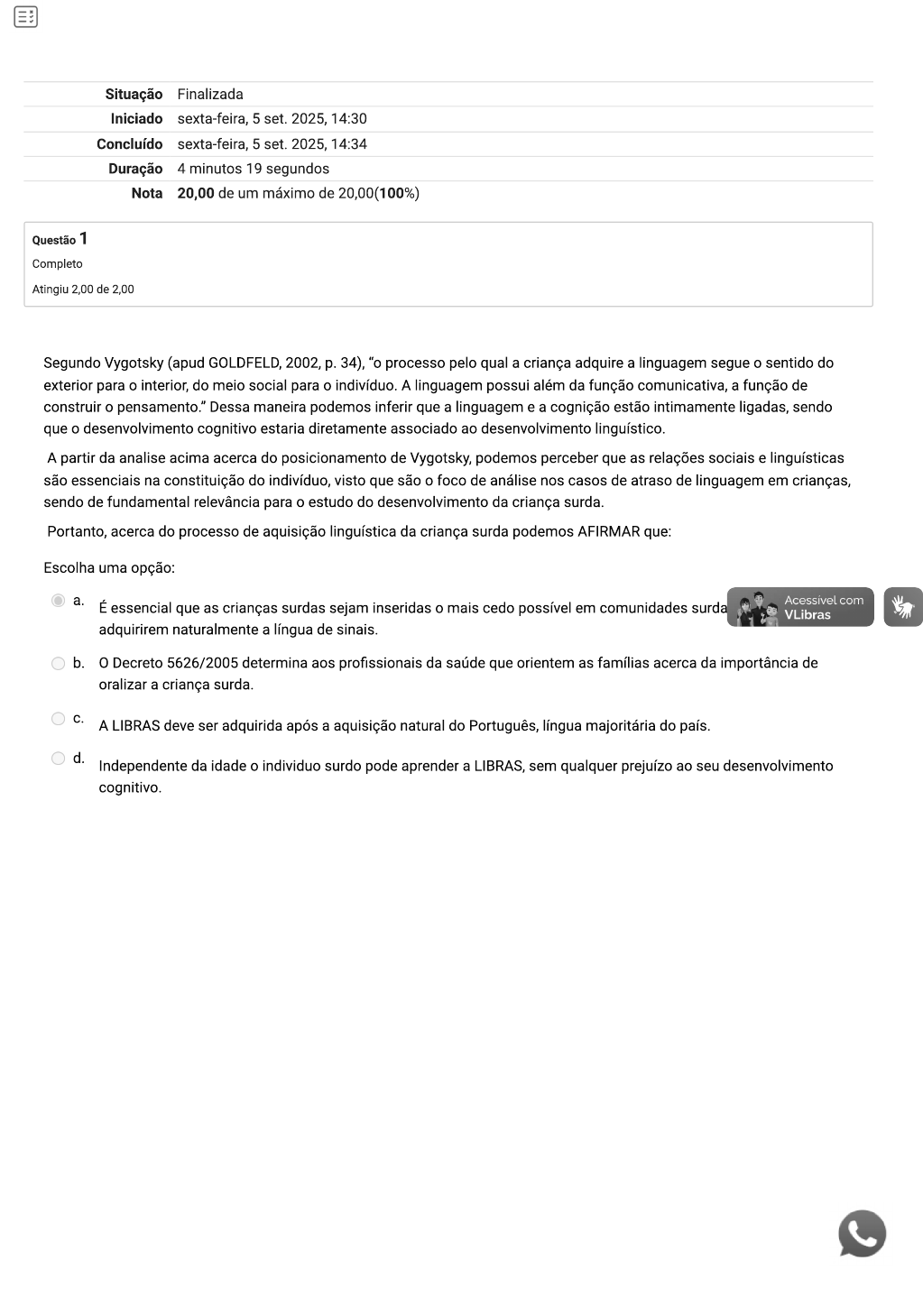 Situação Finalizada Iniciado sexta-feira, 5 set. 2025, 14:30 Concluído sexta-feira, 5 set. 2025, 14:34 Duração 4 minutos 19 segundos Nota 20,00 de um máximo de 20,00(100%) Questão 1 Completo Atingiu 2,00 de 2,00 Segundo Vygotsky (apud GOLDFELD, 2002, p. 34), processo pelo qual a criança adquire a linguagem segue o sentido do exterior para o interior, do meio social para o indivíduo. A linguagem possui além da função comunicativa, a função de construir o pensamento." Dessa maneira podemos inferir que a linguagem e a cognição estão intimamente ligadas, sendo que o desenvolvimento cognitivo estaria diretamente associado ao desenvolvimento linguístico. A partir da analise acima acerca do posicionamento de Vygotsky, podemos perceber que as relações sociais e linguísticas são essenciais na constituição do indivíduo, visto que são o foco de análise nos casos de atraso de linguagem em crianças, sendo de fundamental relevância para o estudo do desenvolvimento da criança surda. Portanto, acerca do processo de aquisição linguística da criança surda podemos AFIRMAR que: Escolha uma opção: a. Acessível com É essencial que as crianças surdas sejam inseridas o mais cedo possível em comunidades surda VLibras adquirirem naturalmente a língua de sinais. b. Decreto 5626/2005 determina aos profissionais da saúde que orientem as famílias acerca da importância de oralizar a criança surda. C. A LIBRAS deve ser adquirida após a aquisição natural do Português, língua majoritária do país. d. Independente da idade o individuo surdo pode aprender a LIBRAS, sem qualquer prejuízo ao seu desenvolvimento cognitivo.Questão 2 Completo Atingiu 2,00 de 2,00 26 de Setembro dia NACIONAL DO SURDO 30 de Setembro dia MUNDIAL DO SURDO Disponível em: Algumas datas comemoradas pelas comunidades surdas espalhadas pelo mundo revelam a visão dos mesmos acerca da sua condição de surdez. A visão da surdez como uma diferença linguística e cultural e não uma condição limitadora e incapacitante pode ser denominada: Escolha uma opção: a. Visão médico cultural da surdez. b. Visão etnocêntrica da surdez. C. Visão clínica terapêutica da surdez. d. Visão sócio antropológica da surdez. Questão 3 Acessível com Completo VLibras Atingiu 2,00 de 2,00 Acerca das legislações inerentes a comunidade surda, analise as afirmações a seguir: intérprete de LIBRAS é um profissional que atua em diferentes contextos sociais fazendo a intermediação comunicativa entre surdos e ouvintes. As empresas concessionárias de serviços públicos devem capacitar 100% dos seus funcionários para atender o surdo em sua língua natural, a LIBRAS. III ( ) Ser surdo, segundo o Decreto é ter uma perda auditiva, parcial ou total, e ser usuário ou não da LIBRAS. A LIBRAS é uma língua oficial no Brasil desde 2012, tornando-nos um país bilíngue. Marque a ORDEM CORRETA do V ou F acima: Escolha uma opção: a. I-V; II-F; III-F; IV-V. b. I-V; II-V; III-F; IV-F. I-F; II-V; III-V; IV-F. d. I-F; II-F; III-V; IV-V.Questão 4 Completo Atingiu 2,00 de 2,00 Analise a imagem a seguir acerca do profissional tradutor e intérprete de LIBRAS: Acerca da imagem acima podemos AFIRMAR que: Escolha uma opção: a. A imagem revela a importância do intérprete na vida do surdo como um tutor, ou seja, alguém responsável por responder pelo surdo e cuidar do mesmo. b. A imagem deixa clara a função do intérprete de ser voz e ouvido do surdo, mas não expressa a importância do intérprete estabelecer vínculos de amizade com a pessoa surda com a qual está interpretando. C. A imagem não contempla a amplitude das funções do intérprete que vão muito além de transitar entre línguas, pois perpassam pela tarefa de ensinar, corrigir e disciplinar o surdo. d. A imagem expressa a função básica do intérprete de LIBRAS, intermediar de forma clara e fiel a comunicação entre surdos e ouvintes. Questão 5 Acessível com Completo VLibras Atingiu 2,00 de 2,00 0 termo surdo é o mais adequado e escolhido pela comunidade surda para se autodenominarem. PORQUE Apesar de ser considerado um termo pejorativo para muitos ouvintes, para os surdos este termo é definidor de uma característica linguística e cultural e não de uma deficiência limitadora e incapacitante. Acerca das asserções apresentadas, assinale a opção CORRETA: Escolha uma opção: a. A primeira asserção é uma proposição verdadeira, e a segunda é uma proposição falsa. b. As duas asserções são proposições verdadeiras, e a segunda é uma justificativa correta da primeira. C. As duas asserções são proposições verdadeiras, mas a segunda não é uma justificativa correta da primeira. d. A primeira asserção é uma proposição falsa, e a segunda, uma proposição verdadeira.Questão 6 Completo Atingiu 2,00 de 2,00 Acerca da leitura labial é preciso ressaltar que em média, apenas 25% do que se diz pode ser identificado pelos melhores leitores labiais do mundo, segundo Fine (1977). Também outras fontes indicam as poucas possibilidades oferecidas pela leitura labial, considerada "a menos consistente das possibilidades de comunicação para pessoas surdas. Somente 30% dos sons da língua inglesa são visíveis nos lábios e 50% dos sons são homófonos". (Gallaudet College, 1984). A fixação do olhar pelo surdo costuma acarretar muito desconforto para o ouvinte (Higgins, 1980, p. 159). Muitos sujeitos surdos descrevem cansaço e limitações em fazer leitura labial, como Rita, sujeito da pesquisa de Botelho (1998): "A professora fala, fala, fala, fala... escreve pouco, você fica cansada... não dá pra entender". Considerando o texto acima infere-se que: Escolha uma opção: a. A leitura labial é extremamente eficiente na comunicação com surdos apesar de ser muito dependente de compreensão do contexto e da integração do conjunto de elementos verbais e não verbais. b. A leitura labial não depende de uma atitude ativa do suje